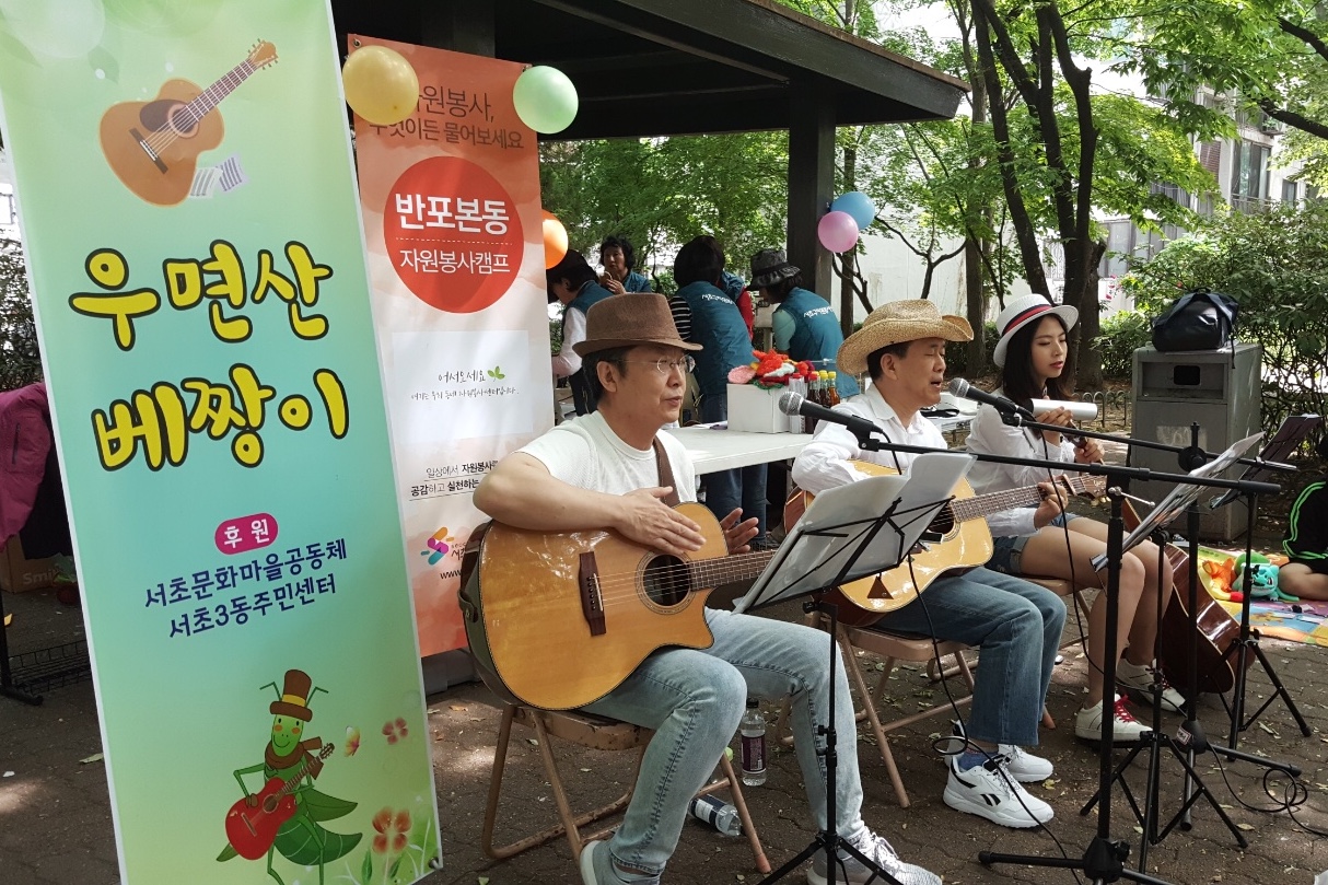 캠페인을 다녀 온 후, 우면산 베짱이의 축하 공연 통해 장터의 시작을 알렸습니다. 우면산 베짱이의 축하공연이 반포 본동 주민 분들이 나와서 공연도 즐기고, 장터도 구경하는 장터의 좋은 시작이 되었습니다.
