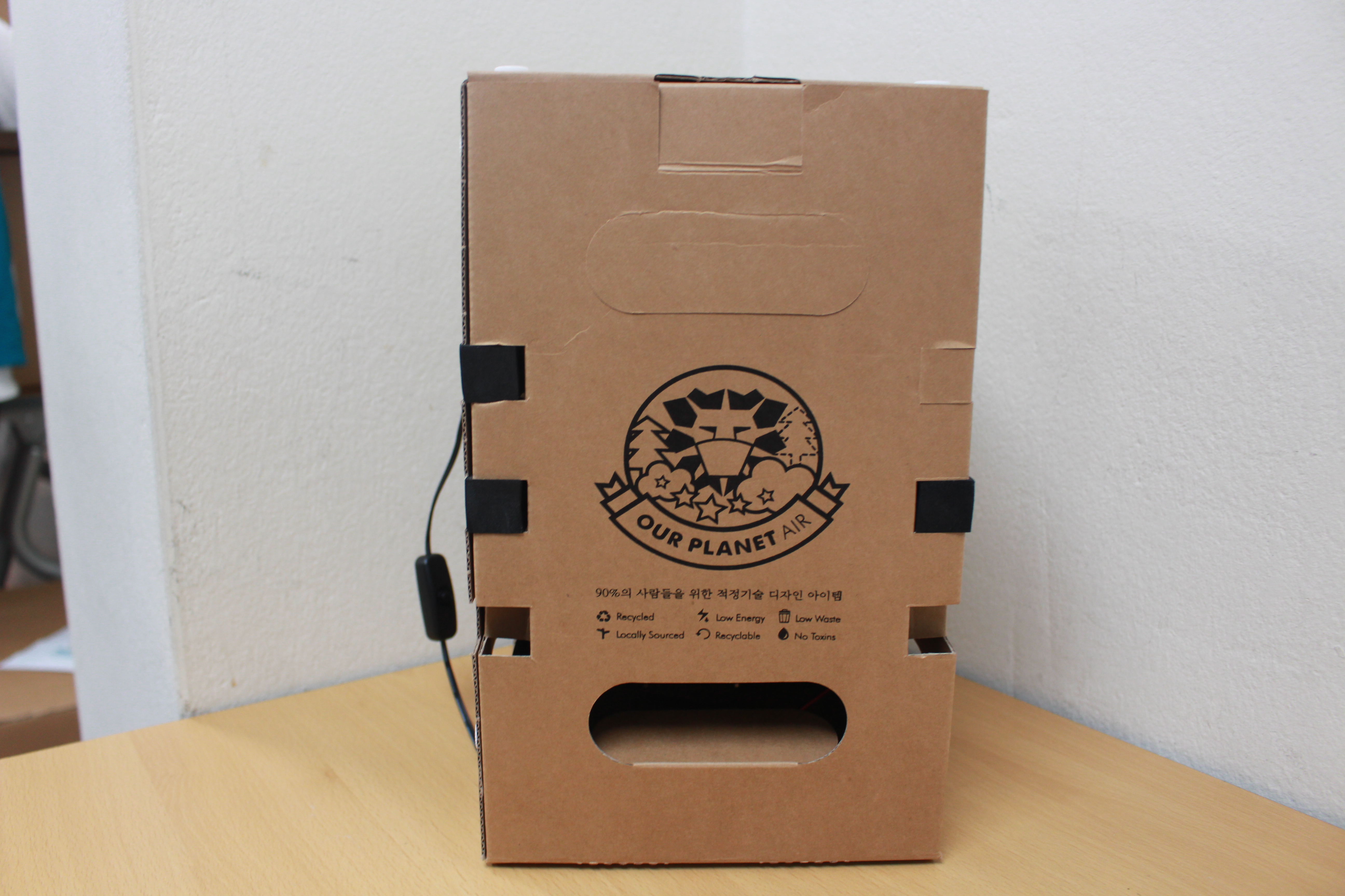 카드보드 아트컬리지 공기청정기(Our Planet Air)는 화려한 외관이나 여러가지 기능이 아닌 꼭 필요한 기능만 넣어 다양한 계층에 보급할 수 있도록 만든 착한 공기청정기입니다. 또한 제품의 80%가 재활용이 가능한 종이재질로 만들어진 친환경 공기청정기 입니다.