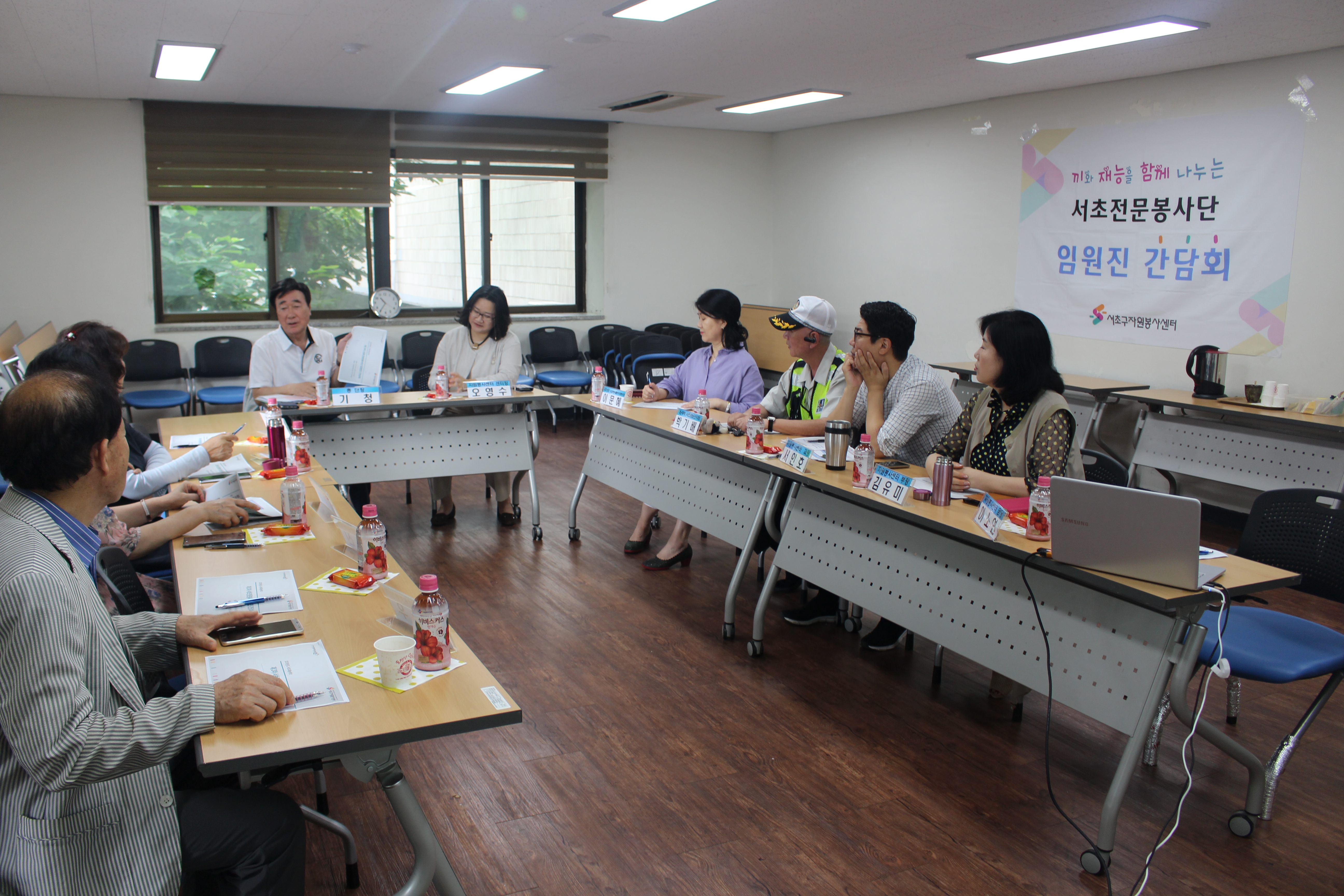 또 서초구자원봉사센터 오영수 센터장님은 각 분야별로 서초구내에서 여러 활동을 이어나가는 봉사단이 오늘 한자리에 모인 만큼 활발한 논의가 이루어질 수 있는 네트워크의 장이 되길 바라며, 봉사단의 많은 도움과 관심 덕분에 앞서 진행되었던 2019 서초전문봉사단 '생기 있는 마을 만들기'가 성공적으로 활동을 잘 마칠 수 있었다는 감사인사를 전하셨습니다. 아울러 앞으로도 서초구 내 우리 전문봉사단이 활발히 활동하기를 바란다는 말씀을 끝으로 본격적인 간담회를 시작하였습니다!