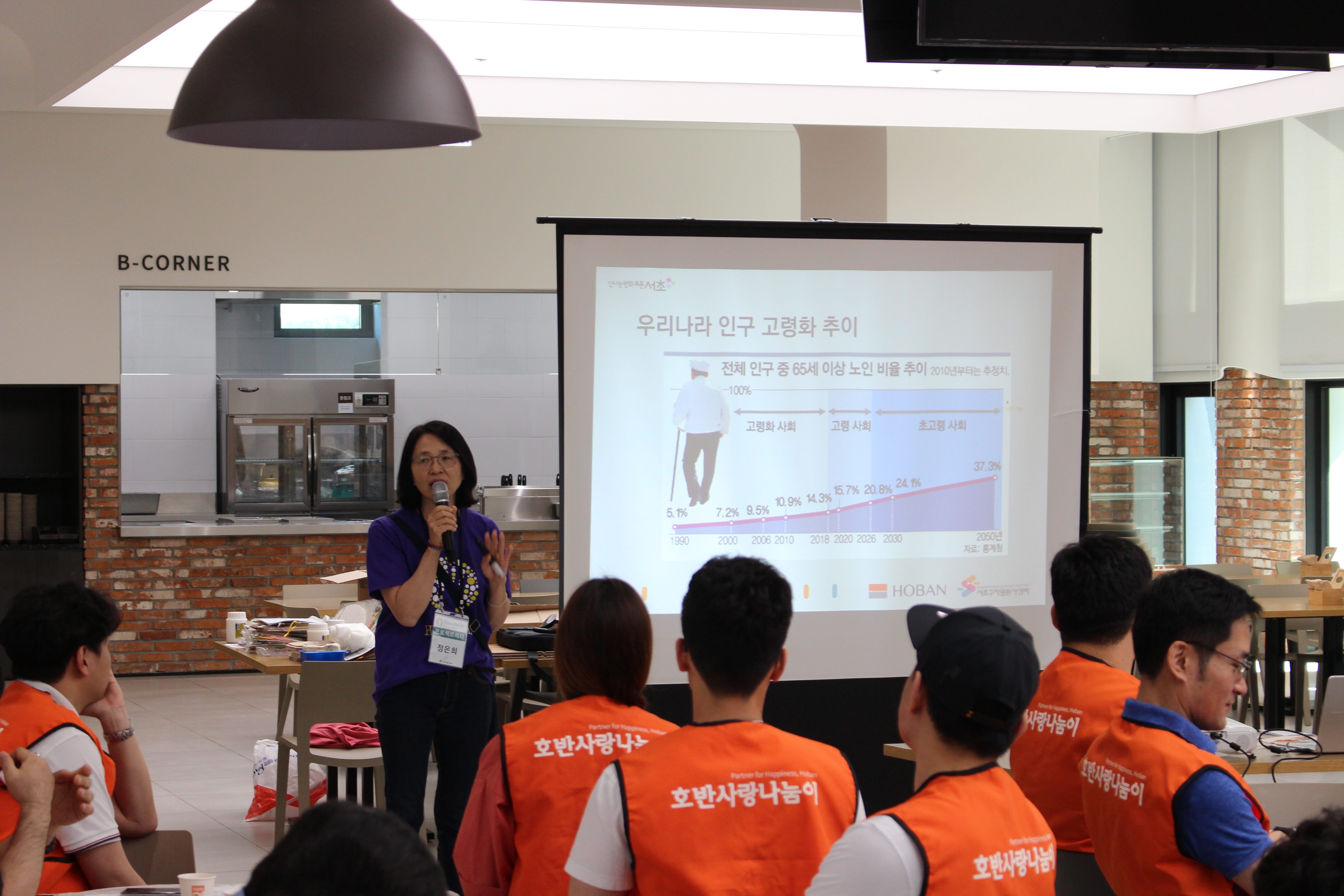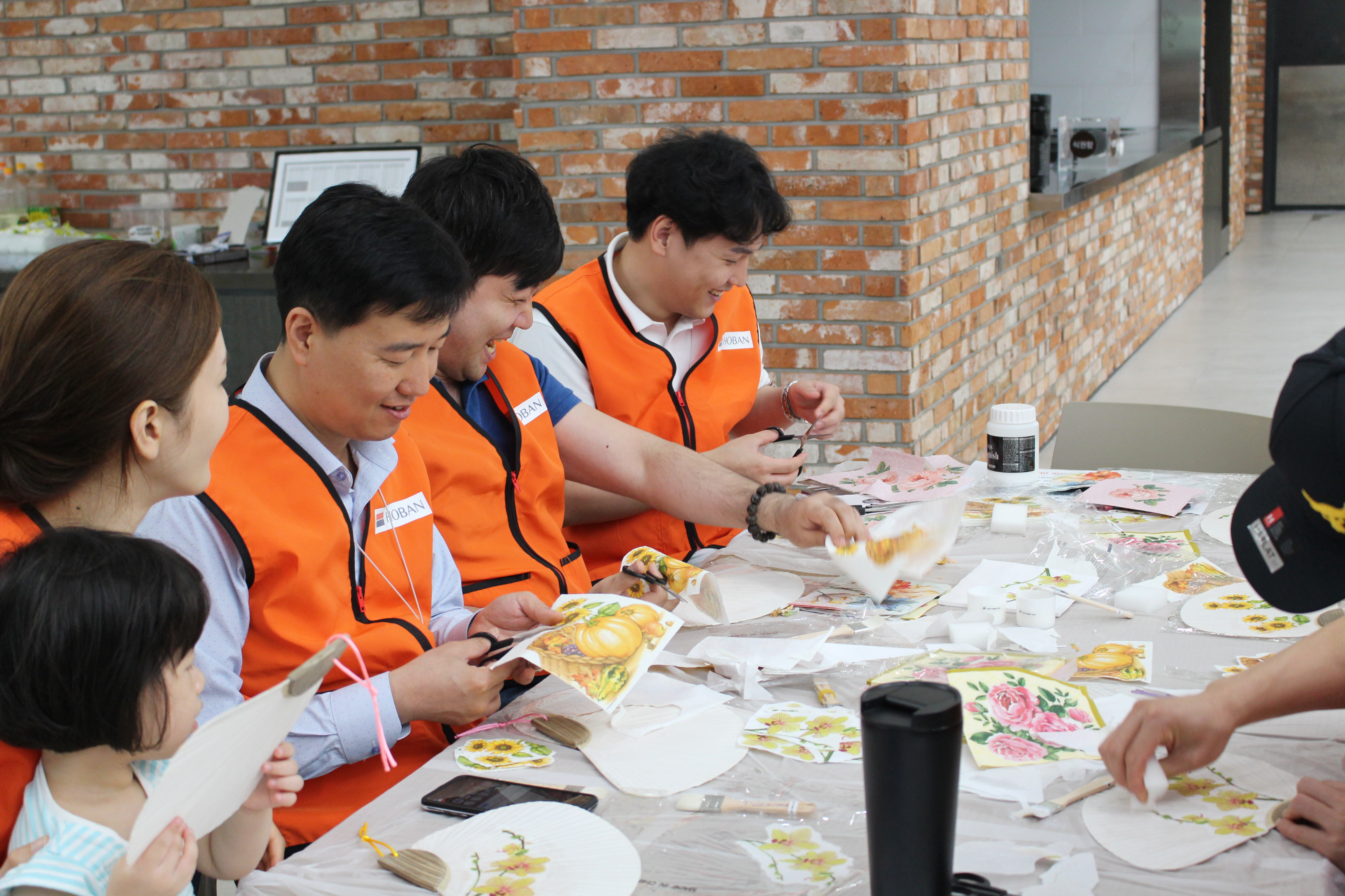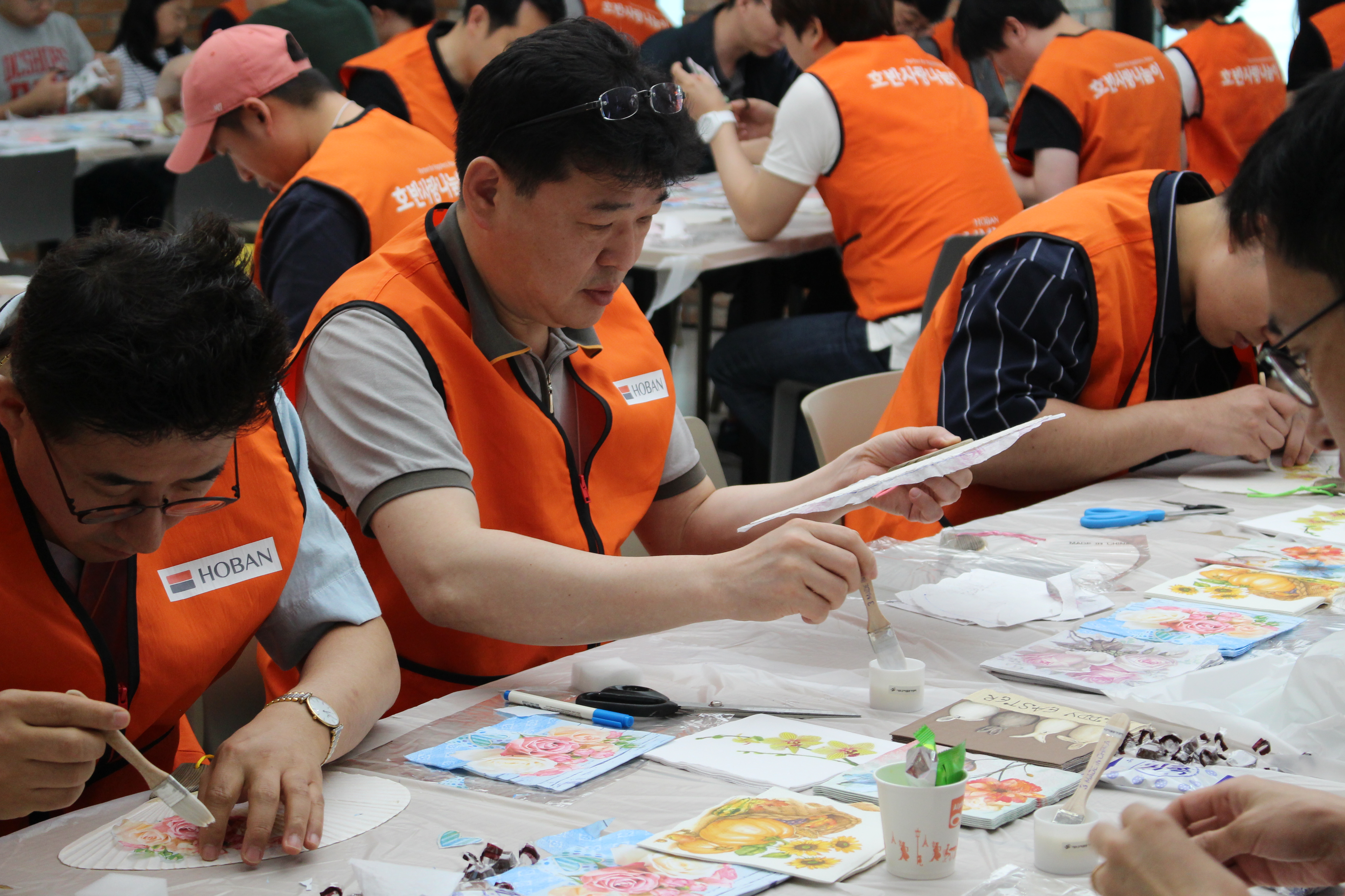 부채 만들기 활동에 앞서 서초구자원봉사센터에서 호반건설 임직원 봉사자들을 대상으로 봉사의 의미와 취지를 설명하는 시간이 있었습니다. 많은 봉사자들은 그 의미를 잊지 않고 열심히 예쁘게 부채를 만들어 보겠다고 다짐하였고, 본 핸즈온 프로젝트의 전 과정을 책임지는 전문 봉사자인 프로젝트 리더와 함께 조를 나눠 본격적인 활동이 시작되었습니다.