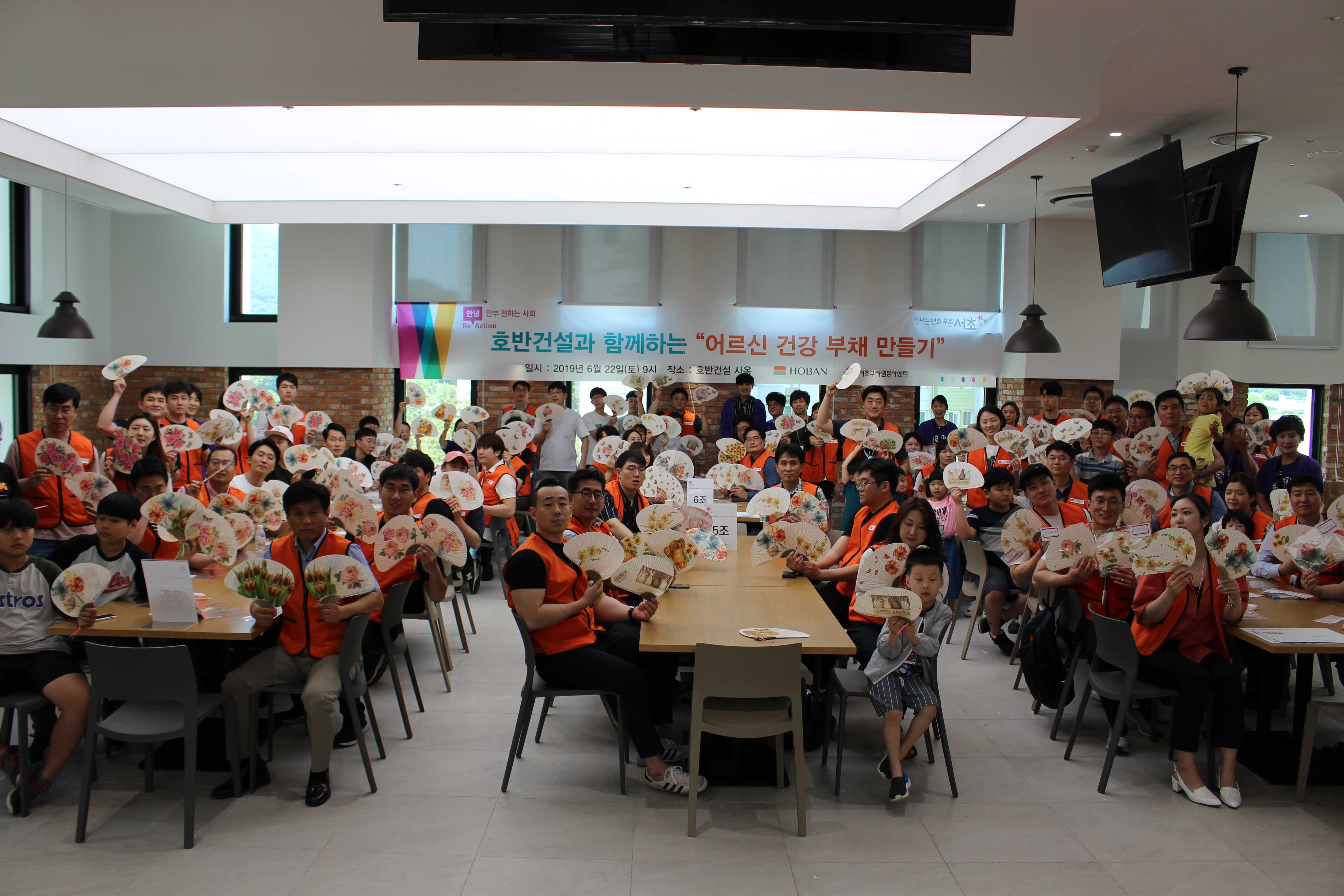 이번 2019년 6월 22일 오전 9시, “안녕하세요 캠페인”의 일환으로 90여명의 임직원들과 함께 “어르신 건강 부채 만들기” 봉사활동을 진행하였습니다. “안녕하세요 캠페인”은 안부를 묻는 사회, 안전한 사회, 안심할 수 있는 사회를 만들고자 하는 캠페인으로, 내곡동 인근 경로당이나 양재노인종합복지관의 어르신에게 건강부채를 전달할 예정입니다.