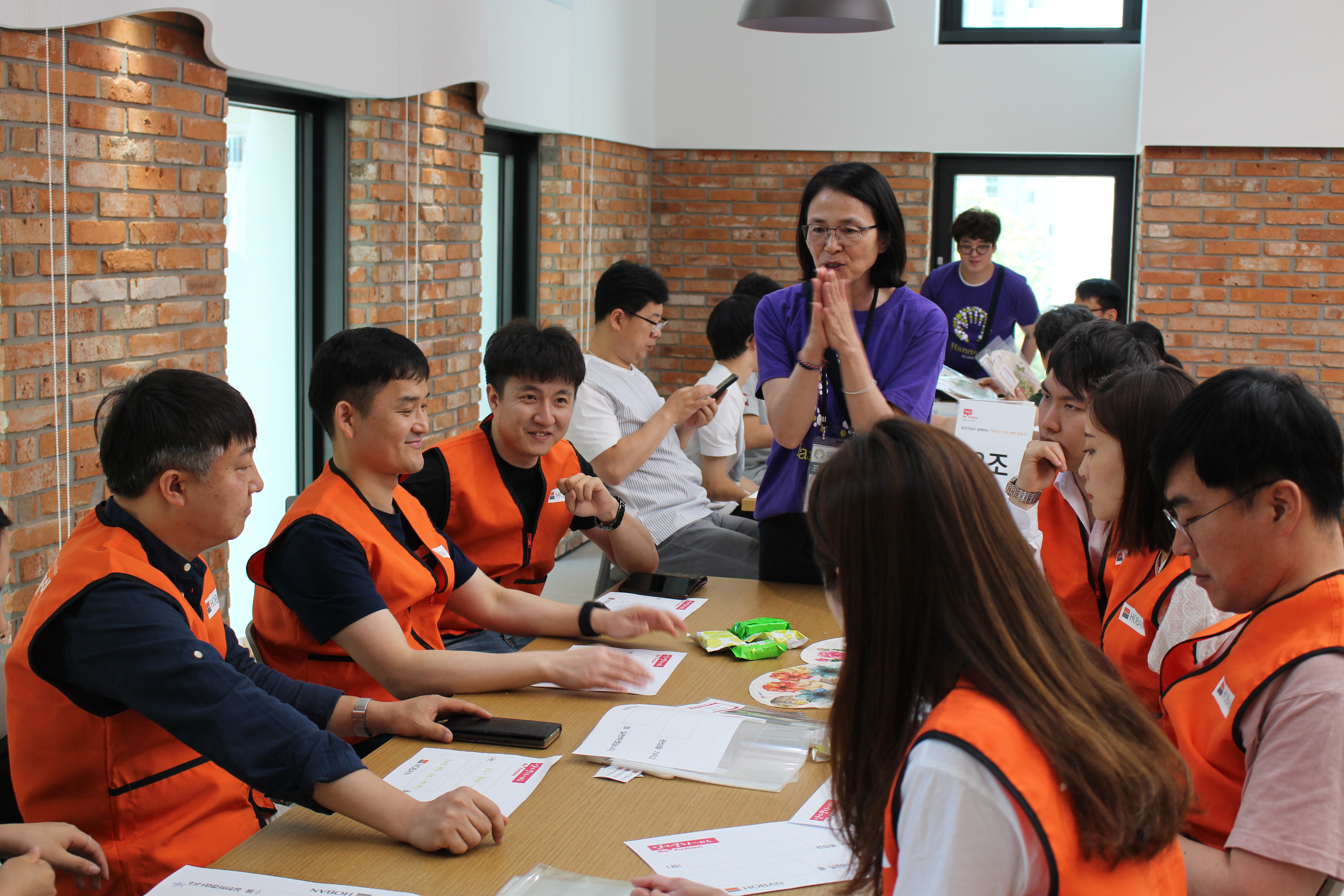 부채 만들기 활동에 앞서 서초구자원봉사센터에서 호반건설 임직원 봉사자들을 대상으로 봉사의 의미와 취지를 설명하는 시간이 있었습니다. 많은 봉사자들은 그 의미를 잊지 않고 열심히 예쁘게 부채를 만들어 보겠다고 다짐하였고, 본 핸즈온 프로젝트의 전 과정을 책임지는 전문 봉사자인 프로젝트 리더와 함께 조를 나눠 본격적인 활동이 시작되었습니다.