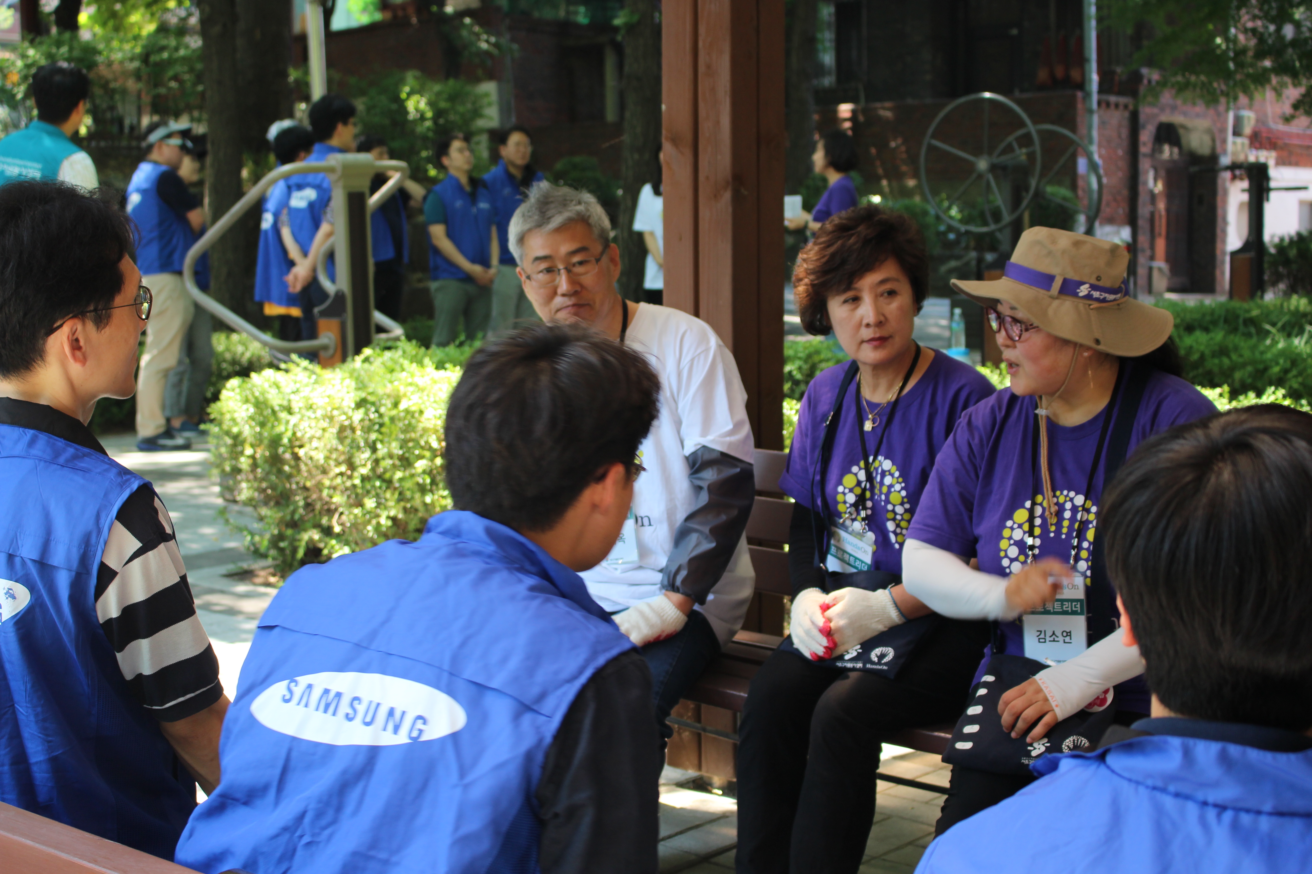 오전 11시, 본격적인 활동이 시작되기 3시간전 일찍이 모인 프로젝트리더들은 삼성자산운용 임직원들의 배치와 일의 순서에 대해 다시 논의하는 시간을 가졌습니다. 노후화 된 공원을 손보는 것에 보이는 것 보다 많은 노력이 들어가기 때문에 이에 대한 회의가 열띠게 진행되었습니다. 이 과정에서 이 일에 대한 프로젝터리더들의 열정을 볼 수 있었습니다. 그 이후에는 팀 마다 사용해야 하는 물품을 정리하였습니다. 아참! 프로젝트리더는 청소년, 가족, 기업 등을 대상으로 자원봉사 프로그램을 기획, 준비, 진행하는 전문자원봉사단입니다.