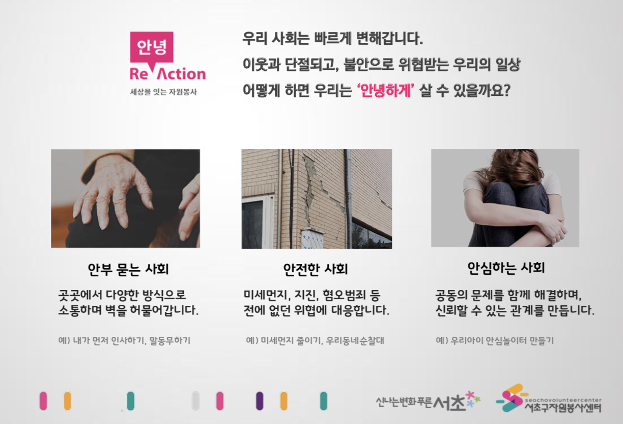 안녕 Re-Action 캠페인은 전국민 자원봉사 프로젝트로서, 현대사회를 안녕하게 살아가는데 도움을 줄 수 있는 방법을 모색합니다. 예를 들어, 이웃들과 벽을 허물기(안부 묻는 사회), 미세먼지나 지진, 혐오범죄 등의 위협에 대응하기(안전한 사회), 어린이 놀이터와 같은 공동의 문제를 함께 해결하는 활동들(안심하는 사회)이 있습니다.