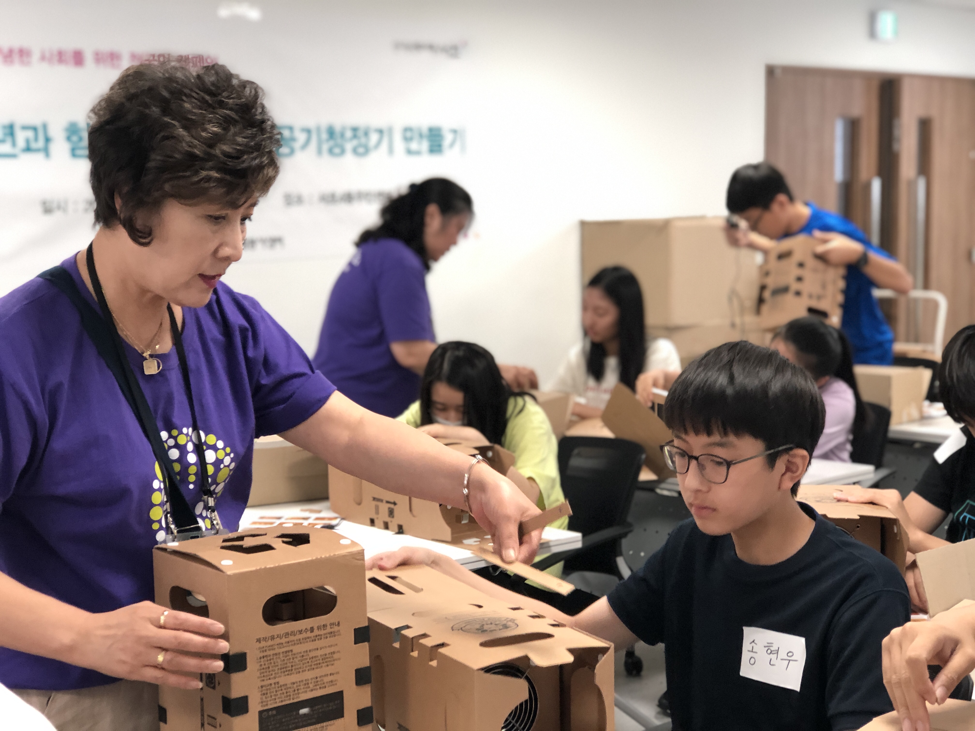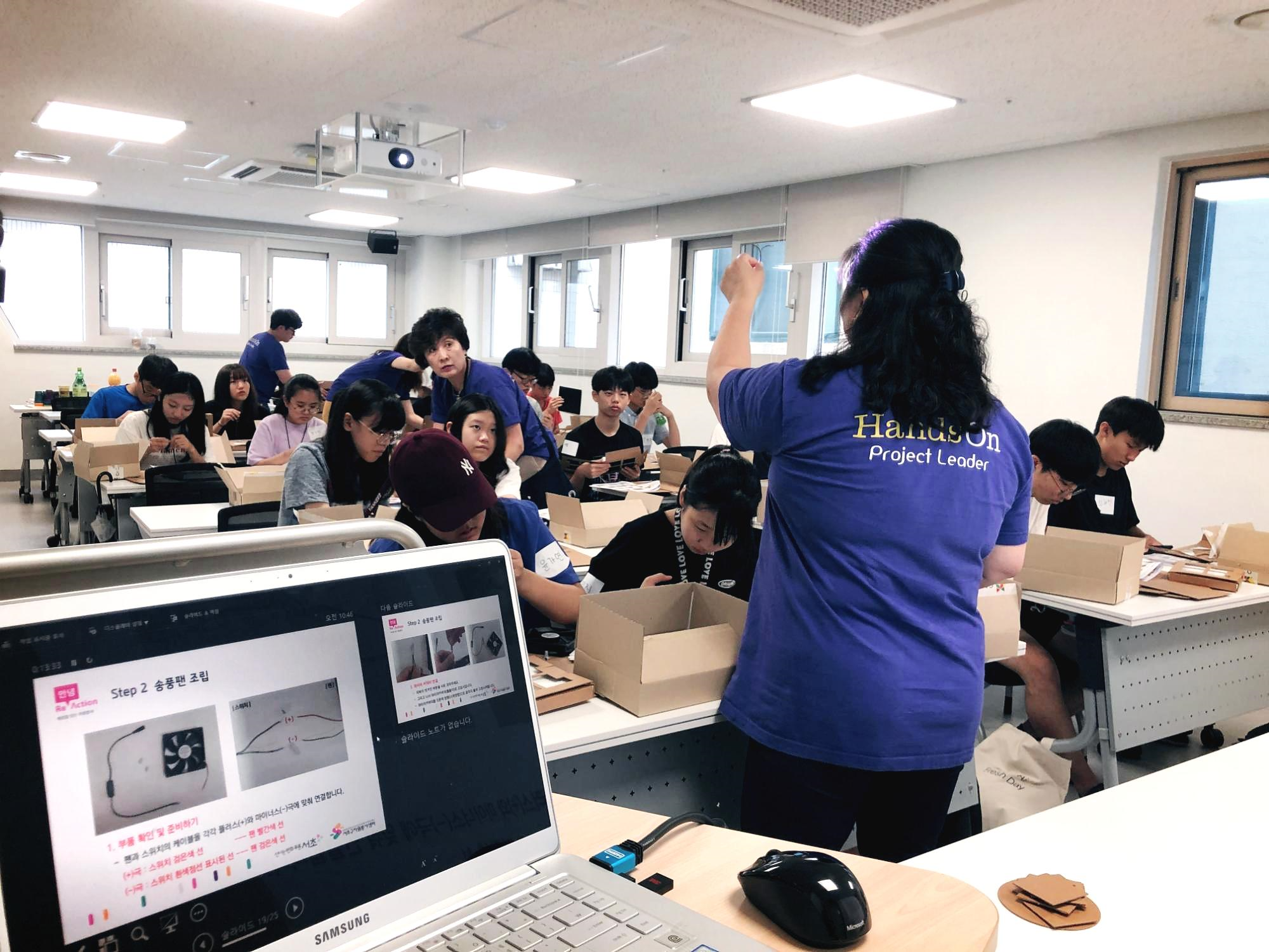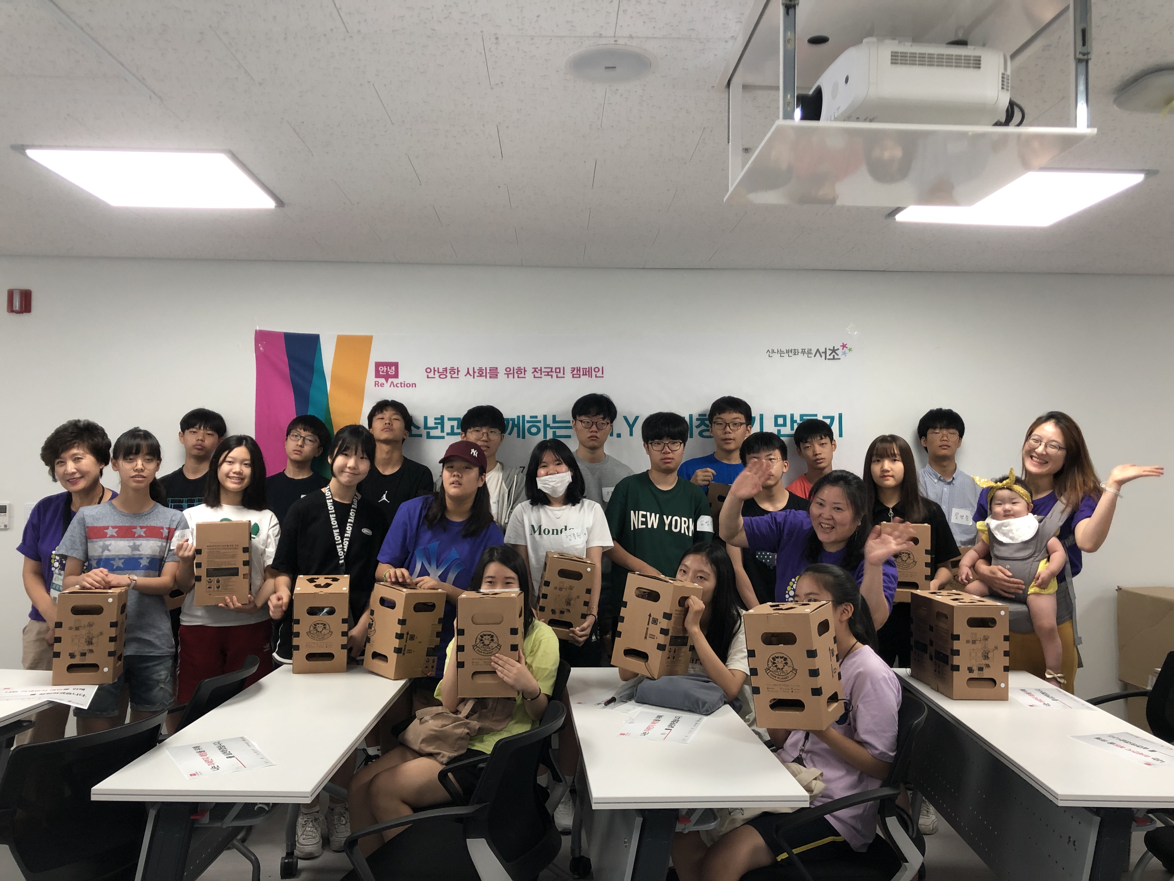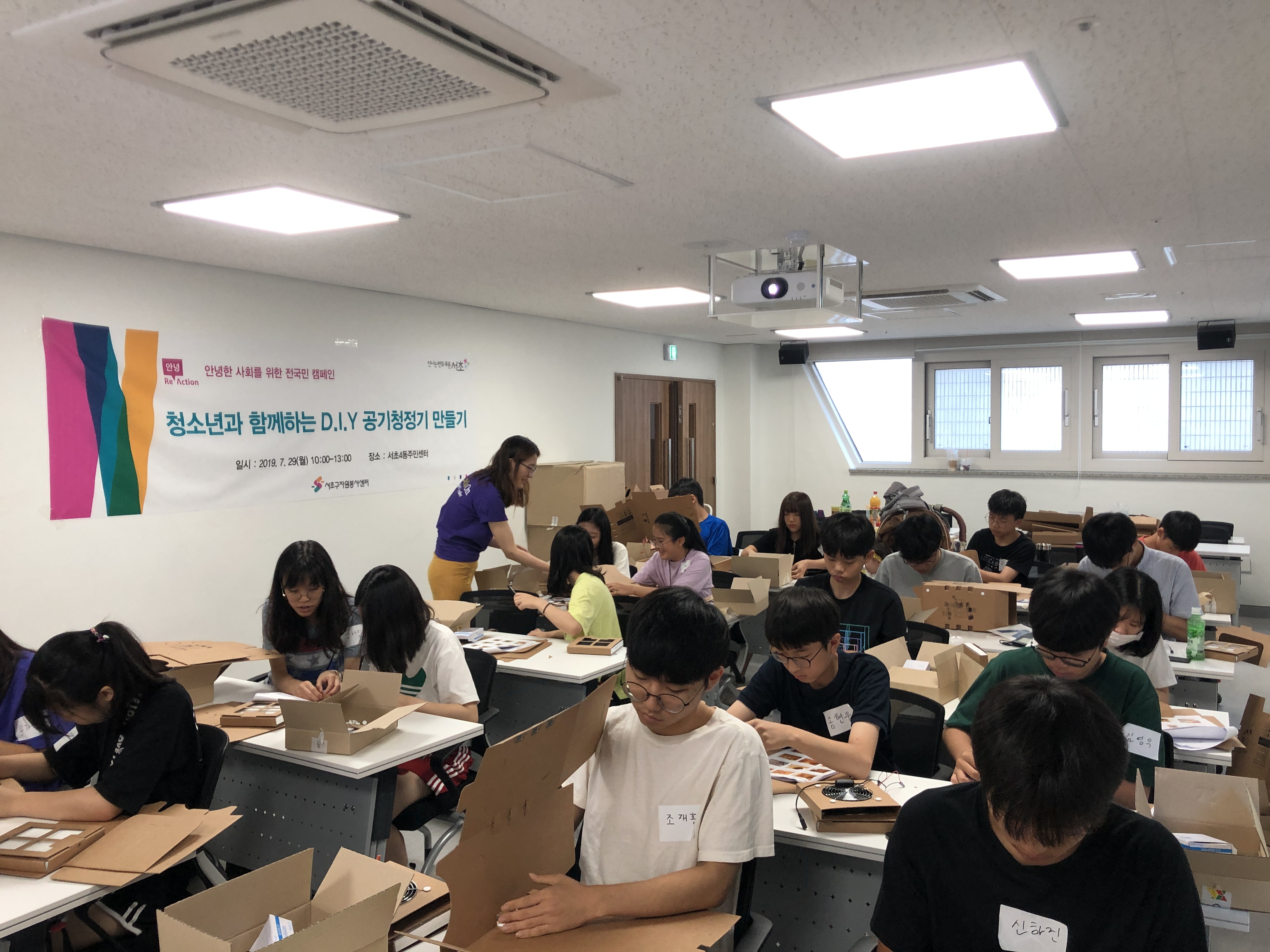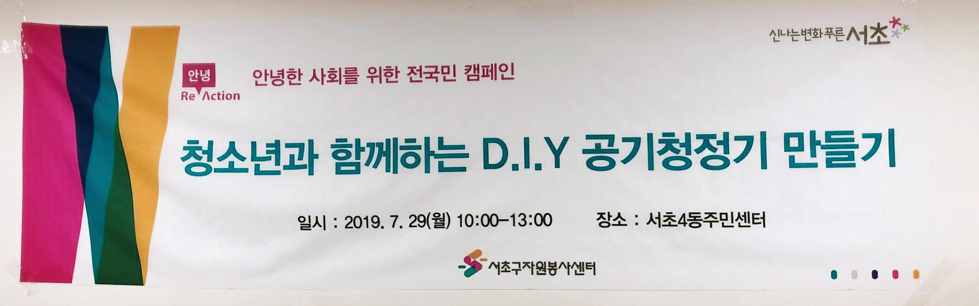 7월 29일 월요일 오전 10시, 서초구자원봉사센터 소속 핸즈온 프로젝트리더들이 20여 명의 청소년과 함께 서초4동 주민센터에서 안녕 Re-Action 캠페인의 일환인 ‘D.I.Y 공기청정기’ 활동을 하였습니다.