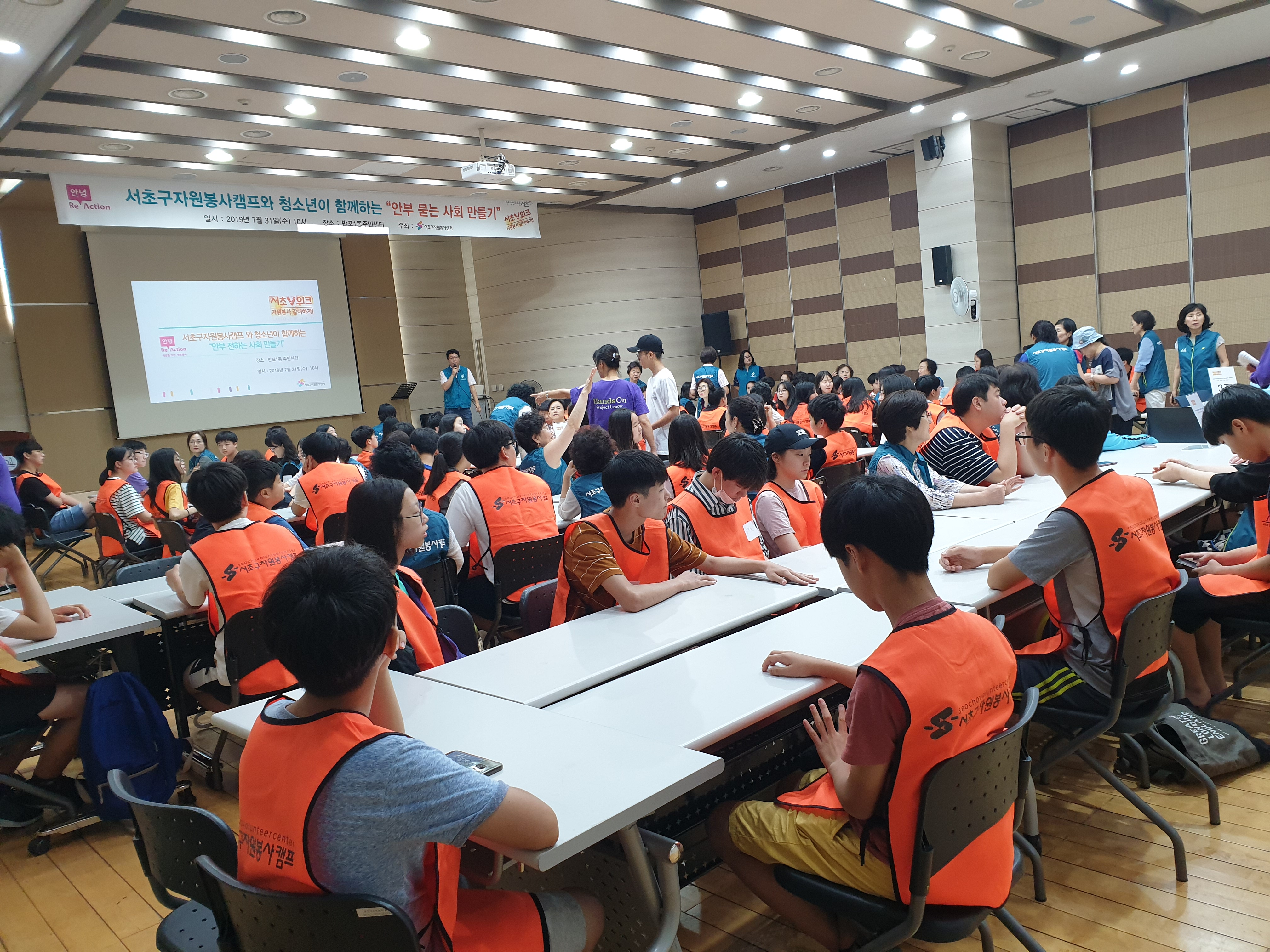 4년째 진행하고 있는 [서초V위크]는 올해도 대규모 액션으로 7월 31일(수) 오전 10시부터 반포1동주민센터 대강당에서 서초구자원봉사캠프 상담가와 청소년이 함께하는 “안부 묻는 사회 만들기” 활동으로 130명이 참여하여 어르신 건강 부채 및 양말 인형 만들기를 진행하였습니다.