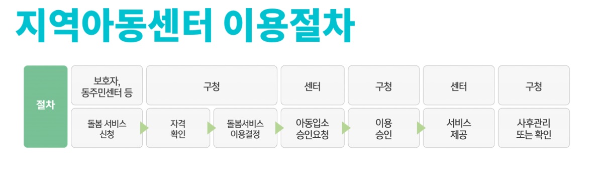 지역아동센터는 보건복지부가 지원하는 아동복지시설로써, 지역사회 아동의 보호와 교육, 건전한 놀이제공 및 보호자와 지역사회 연계 등 아동의 건전한 육성을 위하여 종합적인 아동복지 서비스를 제공하는 곳입니다. 만 18세 미만의 초등학교 및 중학교에 재학 중인 아동 혹은 청소년을 대상으로 무료로 제공되고 있습니다. 이용을 원할 경우 ‘돌봄 서비스 제공 신청서’와 ‘건강보험류 확인서류’ 등을 작성한 뒤, 각 센터마다 필요한 별도의 서류를 추가로 작성하여 신청할 수 있습니다.