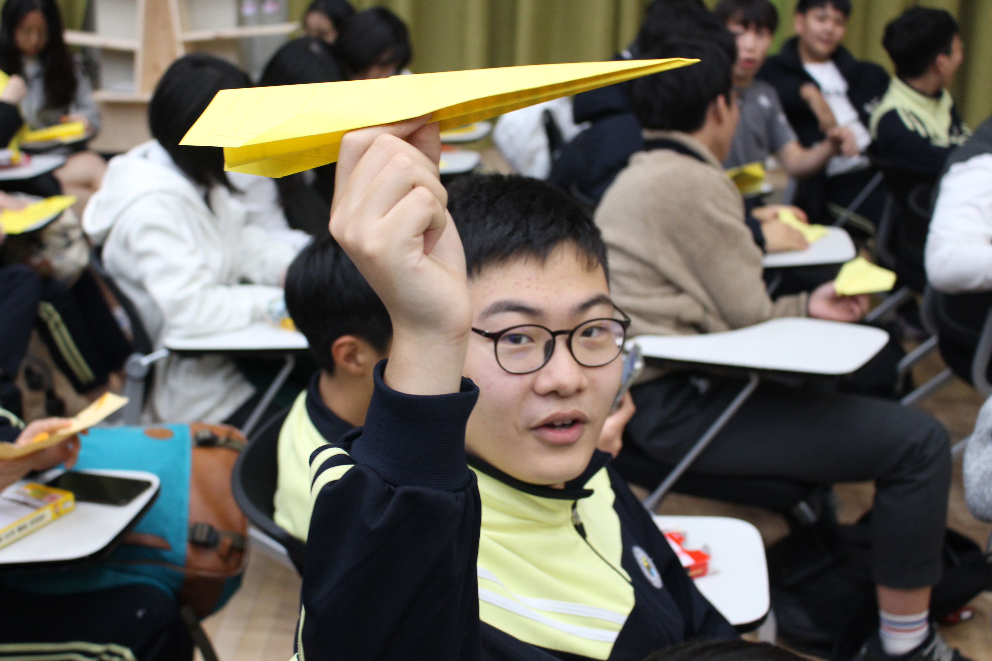 비행기를 접는 학생들도 "종이 비행기는 오랜만에 접어본다.", "어떻게 접는지 기억이 안 난다." 하면서도 접을 줄 모르는 친구를 위해 대신 접어주기도 하고, 살짝 날려보기도 하며 즐거워했습니다.