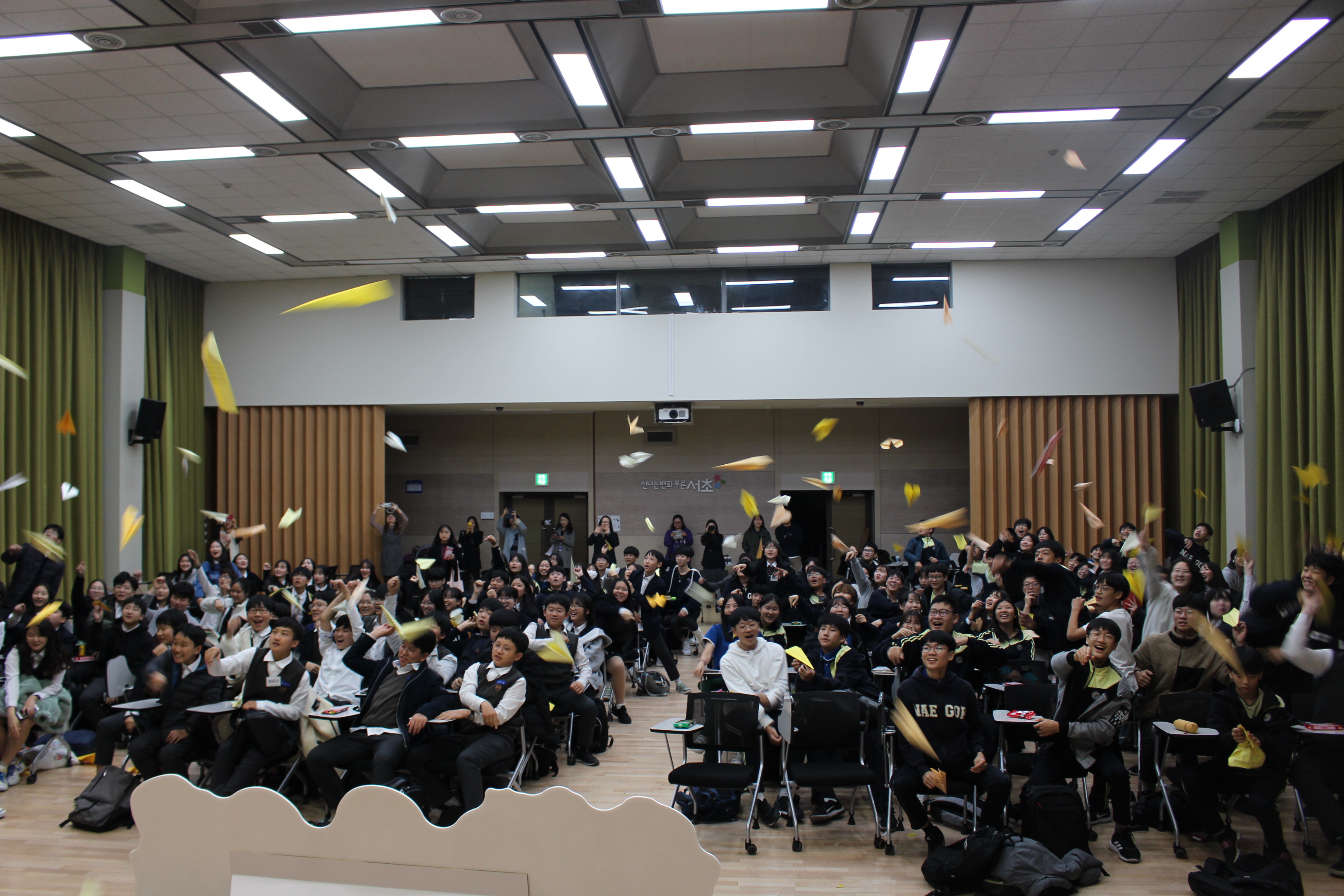 잠시 후 구호("봉사학습 실천학교 ~ 즐거웠다")에 맞춰 비행기를 강단으로 날렸습니다.