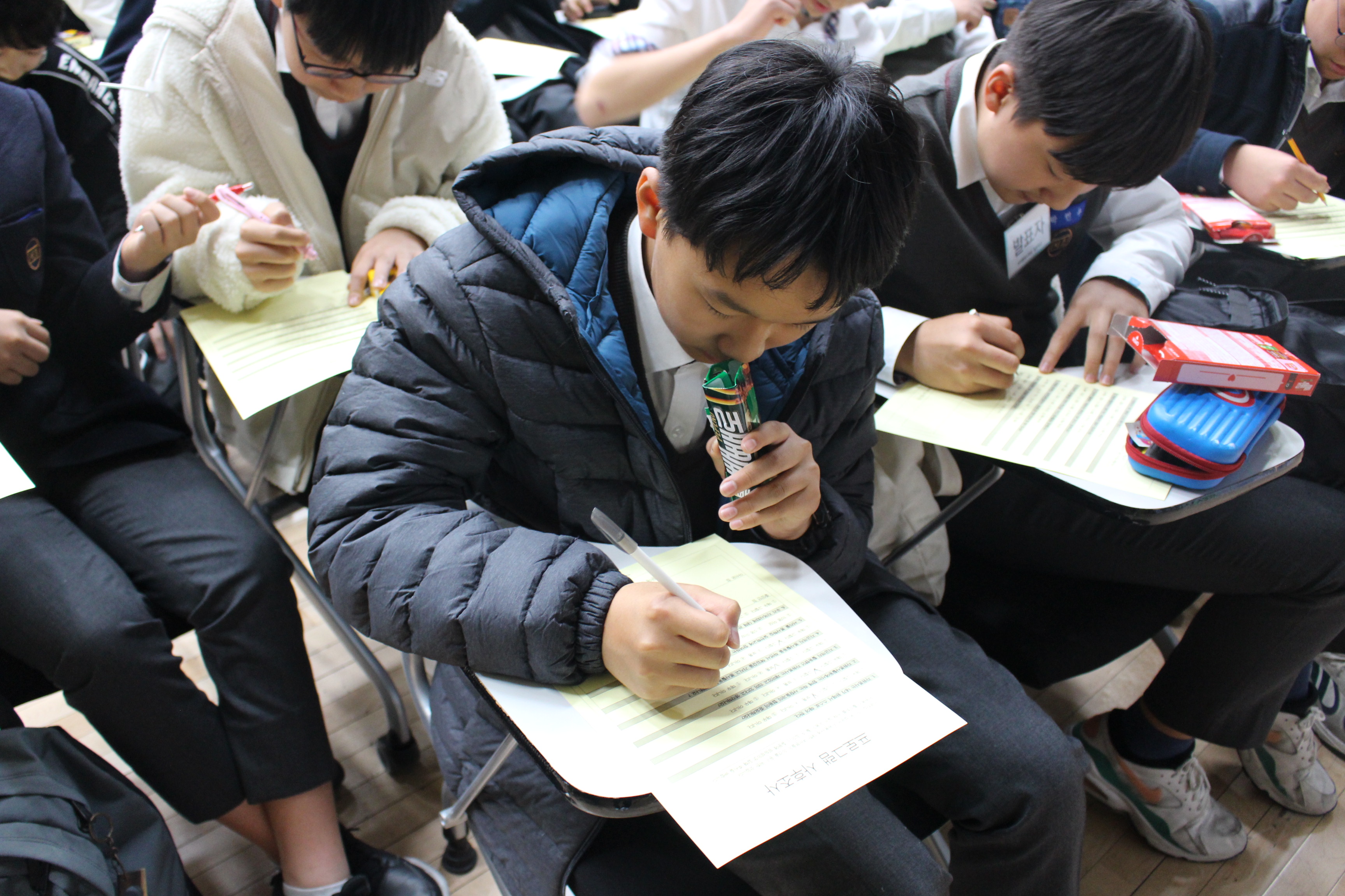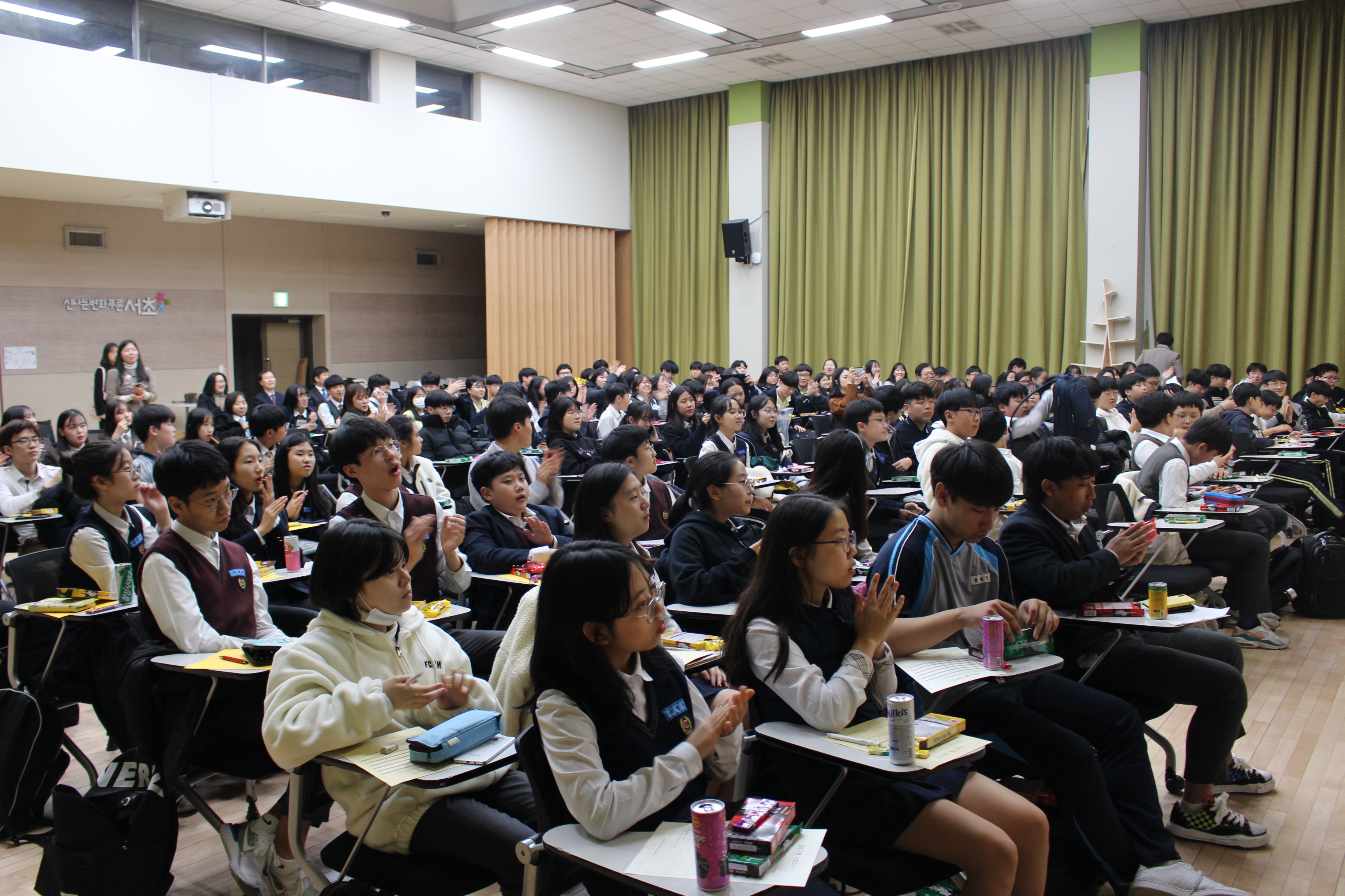각 학급이 일 년동안 진행한 활동을 영상으로 제작해 공유하는 시간도 있었습니다. 중학생만의 개성과 발랄함이 느껴지는 영상들이었는데요. 영상에 친구들이 나올때 마다 환호하고 다른 학교 친구들의 모습도 흥미롭게 시청했습니다.
