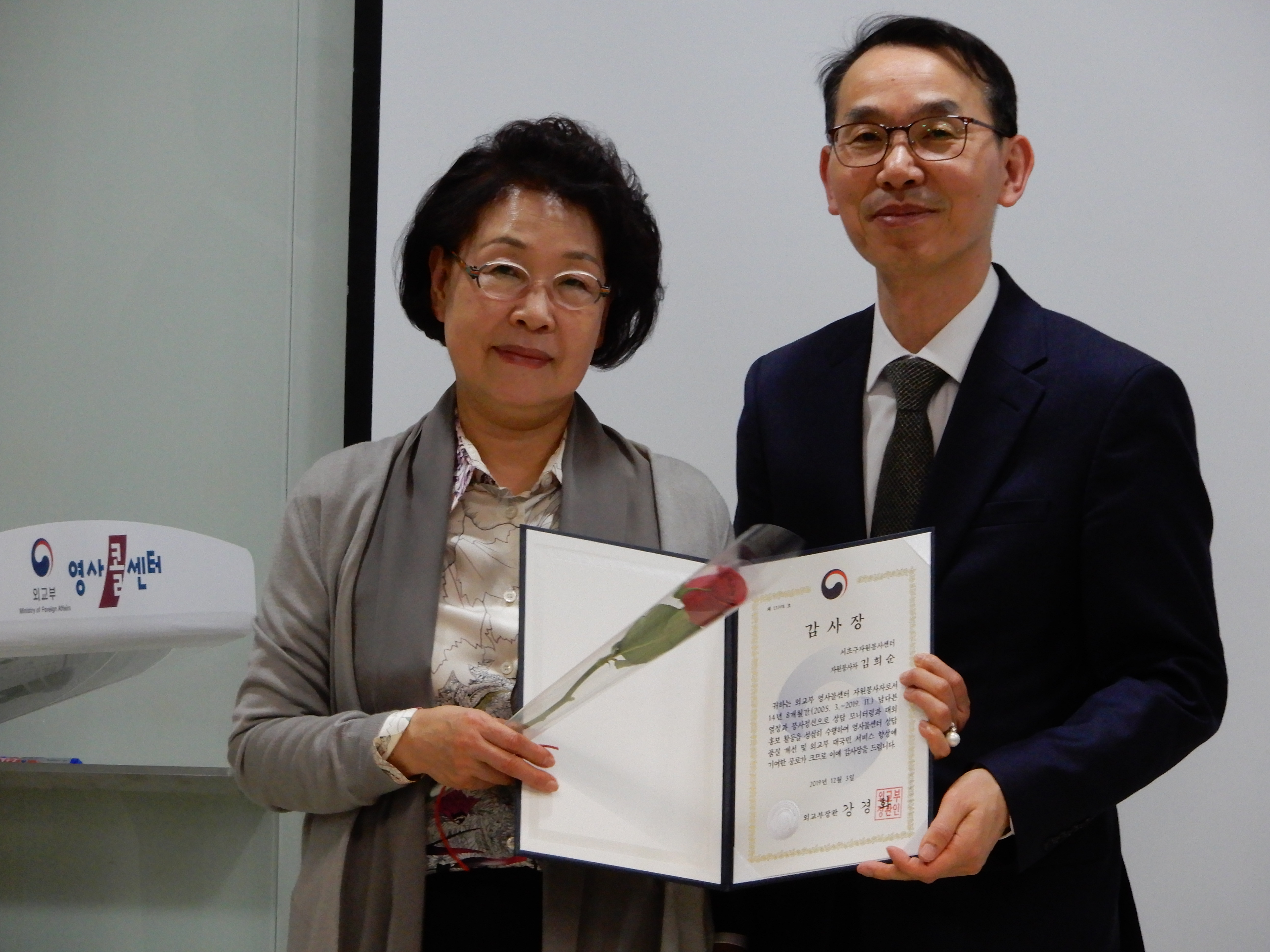이어 서초구자원봉사센터가 영사콜센터 개소 이래 자원봉사자의 영사콜센터 상담 모니터링 및 대외홍보 활동에 아낌없는 지원으로 외교부의 대국민 서비스 향상에 이바지한 공로를 인정받아 감사패를 수여 받았습니다.