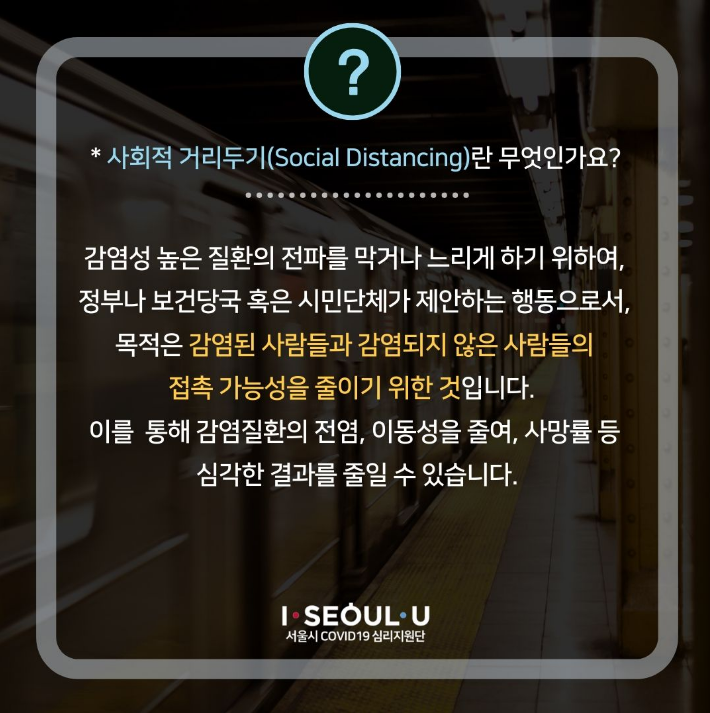 사회적 거리두기(Social Distancing)란, 감염성 높은 질환의 전파를 막거나 느리게 하기 위하여 정부나 보건당국 혹은 시민단체가 제안하는 행동으로서, 목적은 감염된 사람들과 감염되지 않은 사람들의 접촉 가능성을 줄이기 위한 것입니다. 이를 통해 감염질환의 전염, 이동성을 줄여, 사망률 등 심각한 결과를 줄일 수 있습니다. 사회적 거리두기는 오래전부터 전염성 질환의 전파를 막기 위하여 사용했던 방법이고, 우리 모두의 안전을 높일 수 있는 실천이랍니다. 과거 1918년 미국에서 처음 실행되었던 방법으로 당시 미국의 교회들은 예배를 중단했고, 시민들은 모임을 취소했고, 시와 당국도 잠시 행사를 멈추었다고 합니다. 전직 대통령의 장례식조차 조촐하게 치르기로 했었다고 하네요.
