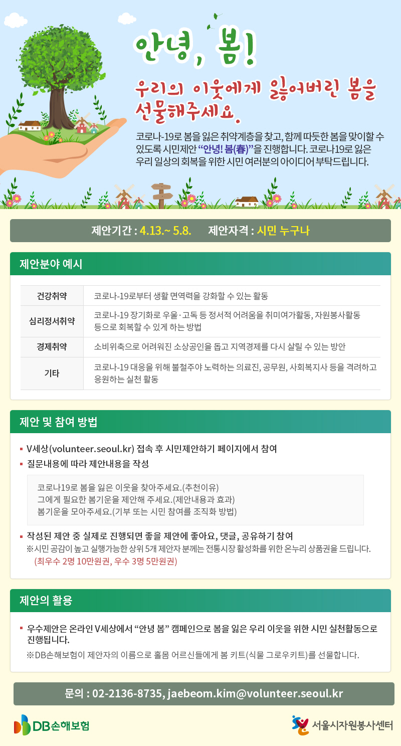코로나-19로 봄을 잃은 취약계층을 찾고, 함께 따듯한 봄(春)을 맞이할 수 있도록 시민제안 “안녕 봄(春)”을 진행합니다. 코로나19로 잃은 우리 일상의 회복을 위한 시민 여러분의 아이디어 부탁드립니다.