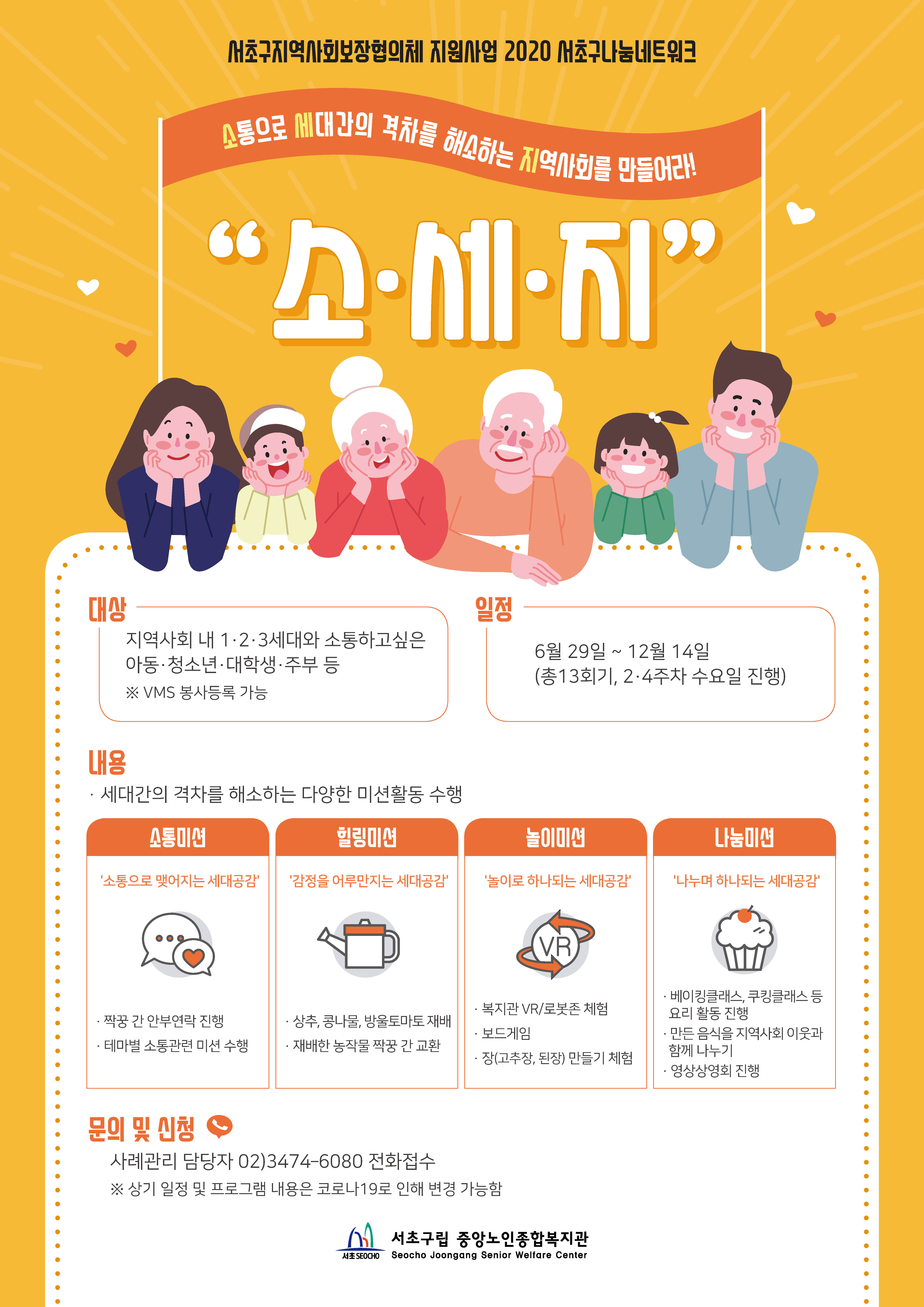 ○ 대 상 자 : 서초구 거주 만 60세 이상 어르신 10명, 2·3세대 봉사자 20명