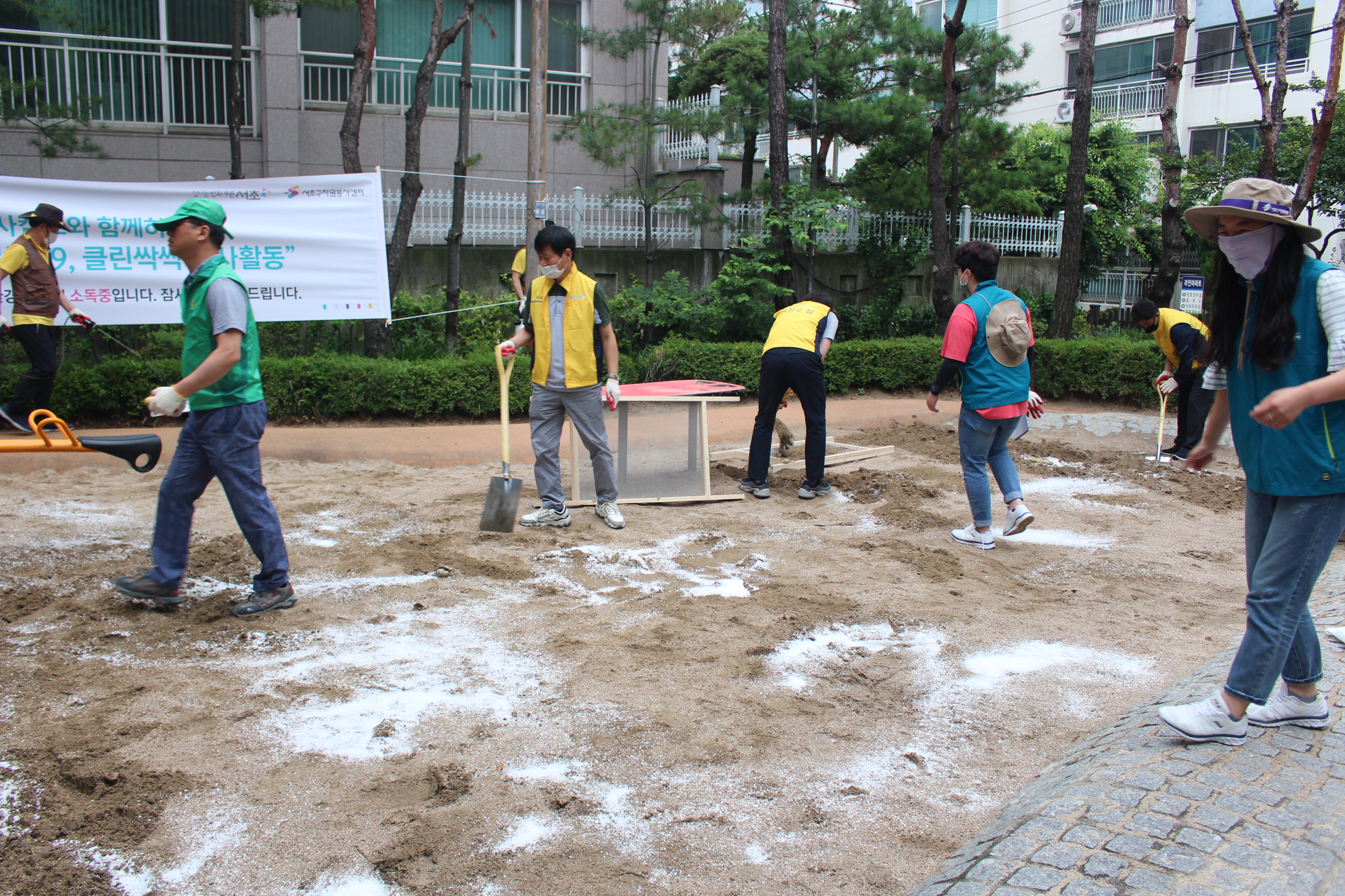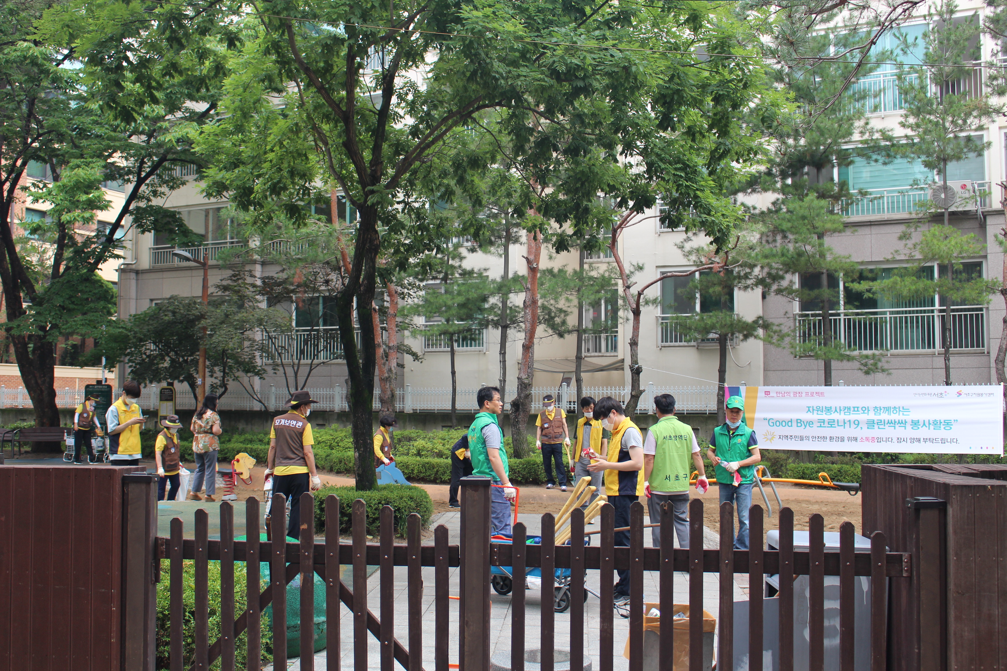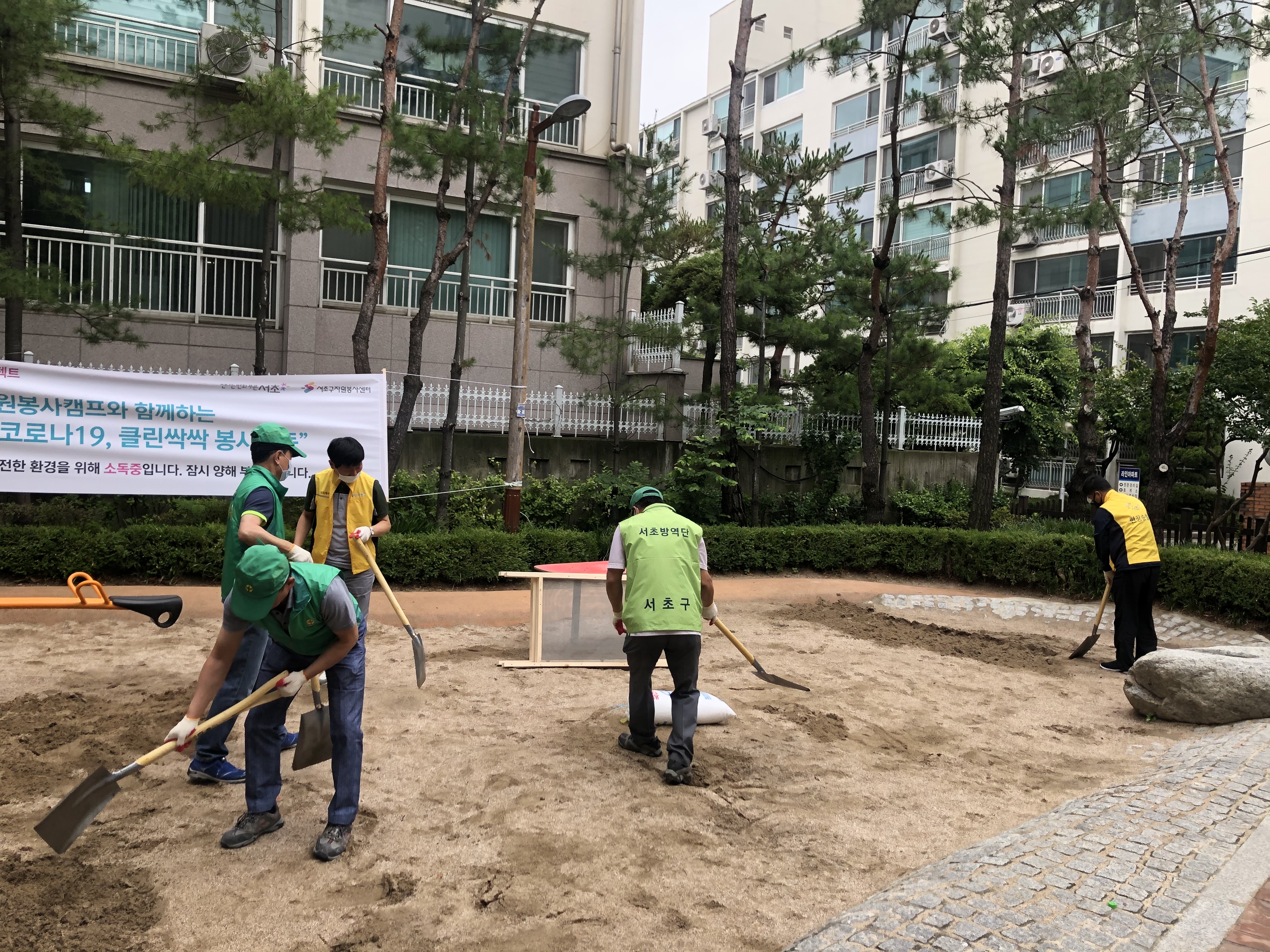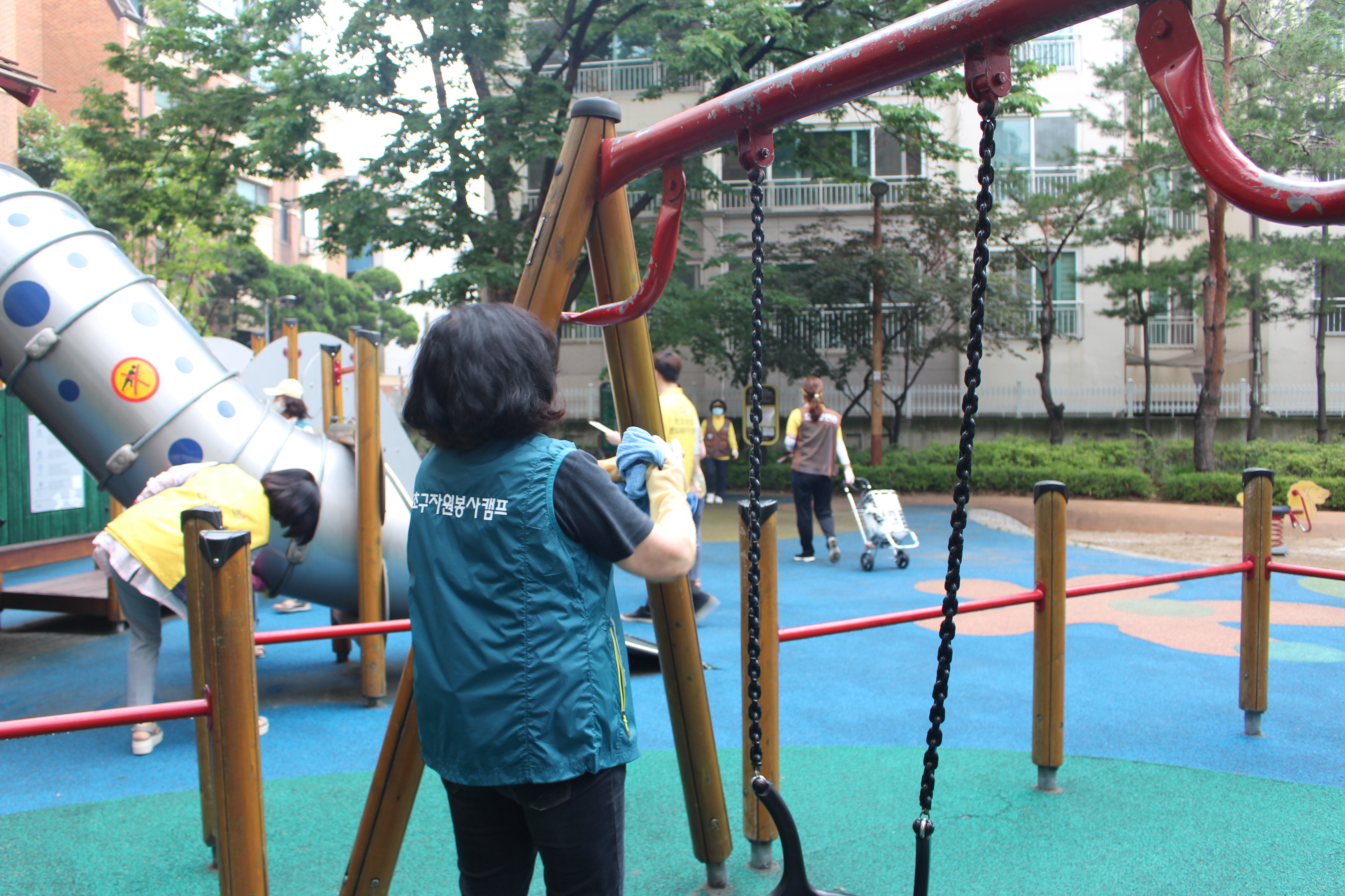 서초구자원봉사캠프, 새마을지도자협의회, 자율방재단, 모기보완관이 모여 어린이들이 자주 사용하는 놀이기구와 벤치그리고 모래 소독을 하는 봉사활동이 진행되었습니다.