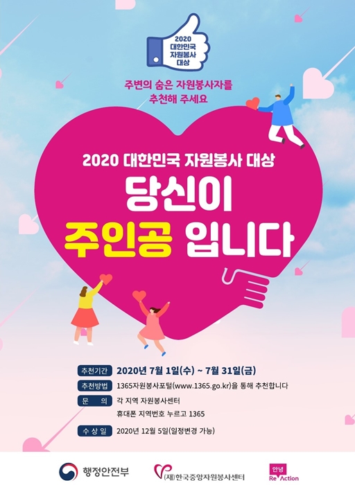 대한민국 자원봉사대상 후보자는 개인이나 단체 등 국민 누구나(본인 추천은 제외)