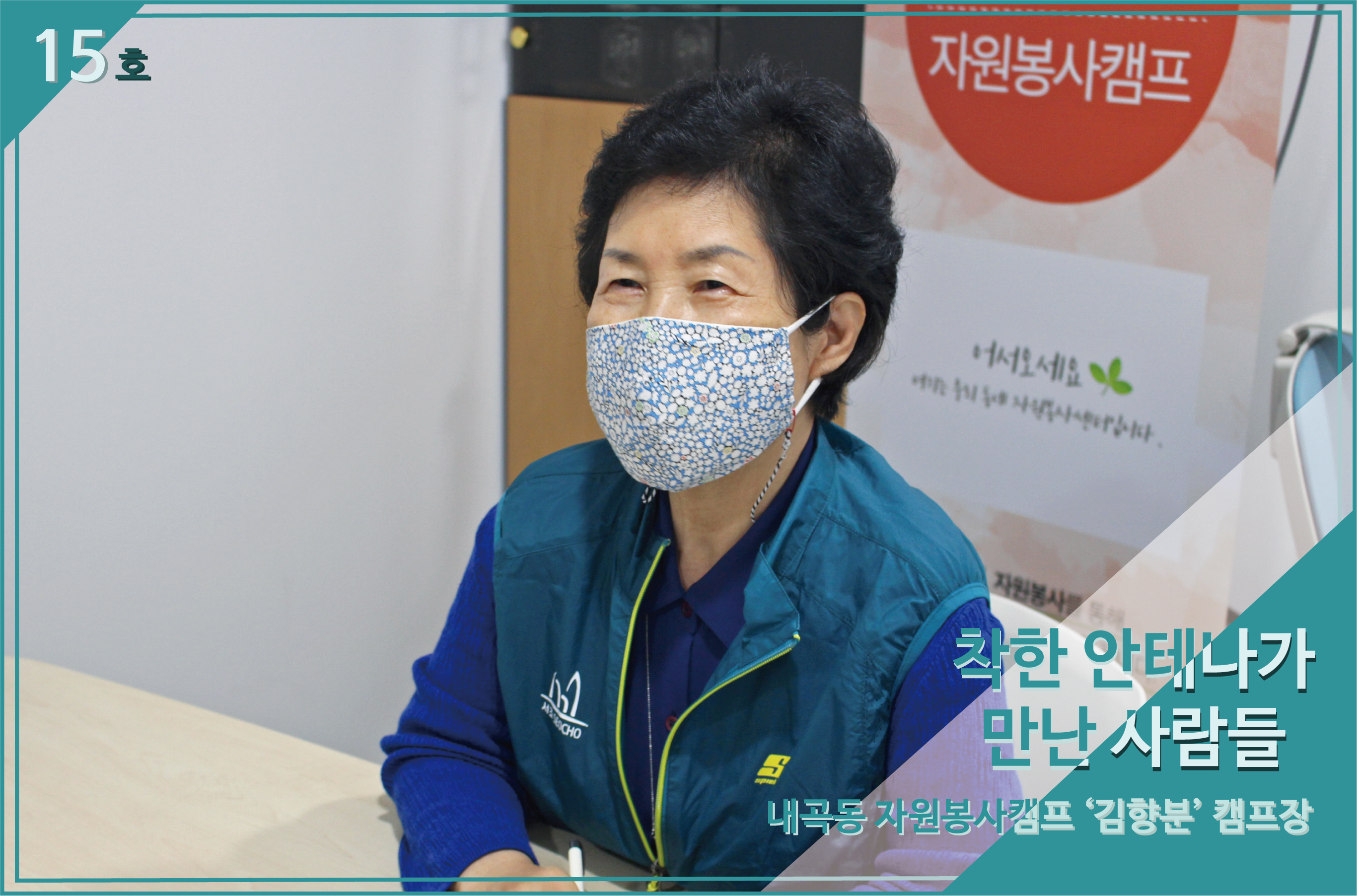 자원봉사는 일상생활과 아주 밀접한, 우리가 살아가는데 함께 하는 공간과 시간이라고 생각해요. 저에게 자원봉사란 삶의 자부심이고 기쁨이며 보람입니다. 저의 건강이 허락하는 한까지 내곡동 캠프와 함께 하고 싶네요.