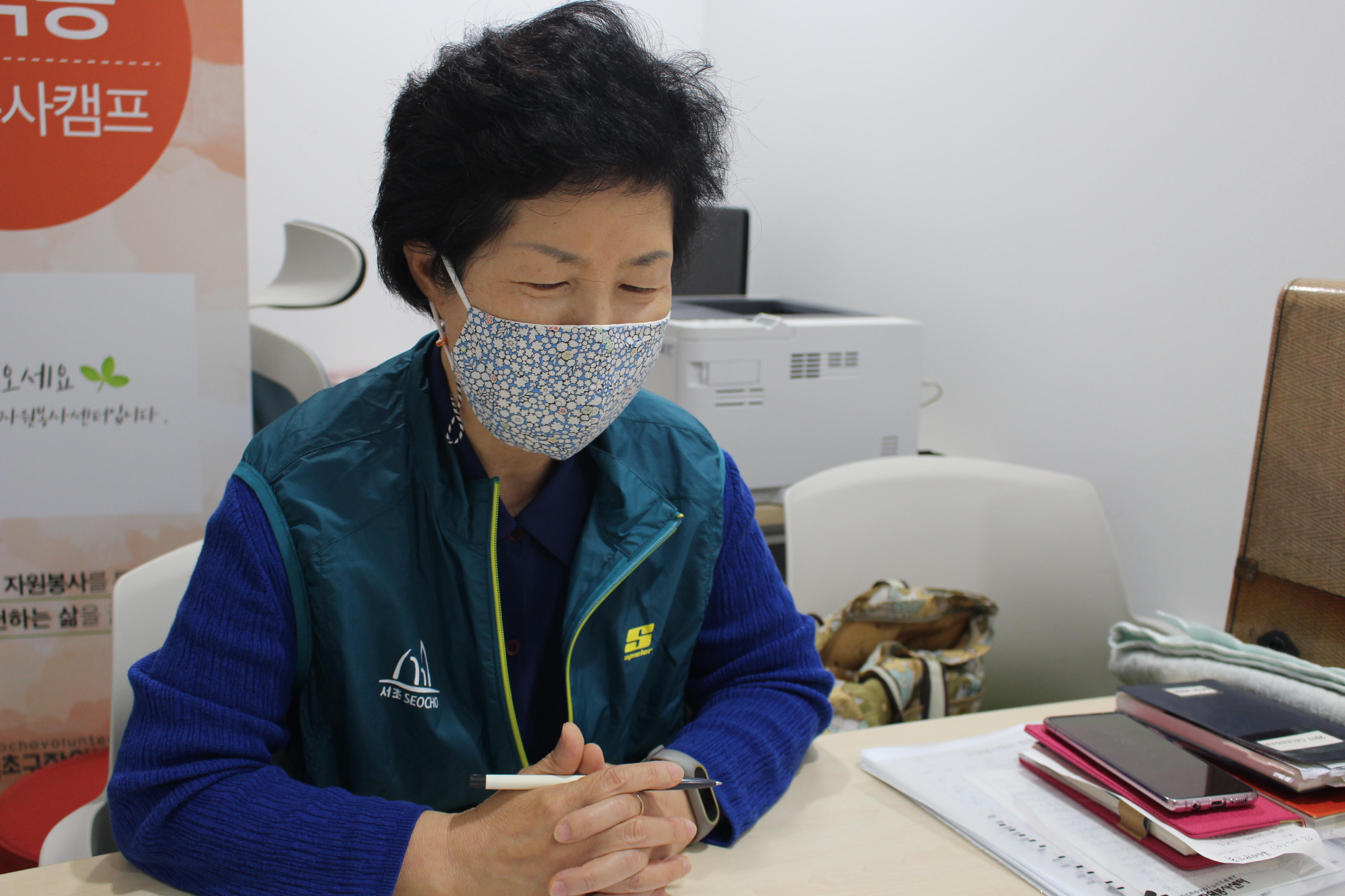 비대면 활동을 위해 서초구자원봉사센터에서 각 동 캠프에 마스크를 만드는 원단과 재료를 나눠주면, 저와 캠프 총무님이 함께 내곡동 캠프 상담가(현 활동가) 10여 명의 각각의 집으로 재료를 배부해드렸어요. 그럼 상담가 분들이 마스크를 만들어 다시 센터로 수거하는 방식으로 진행했어요.