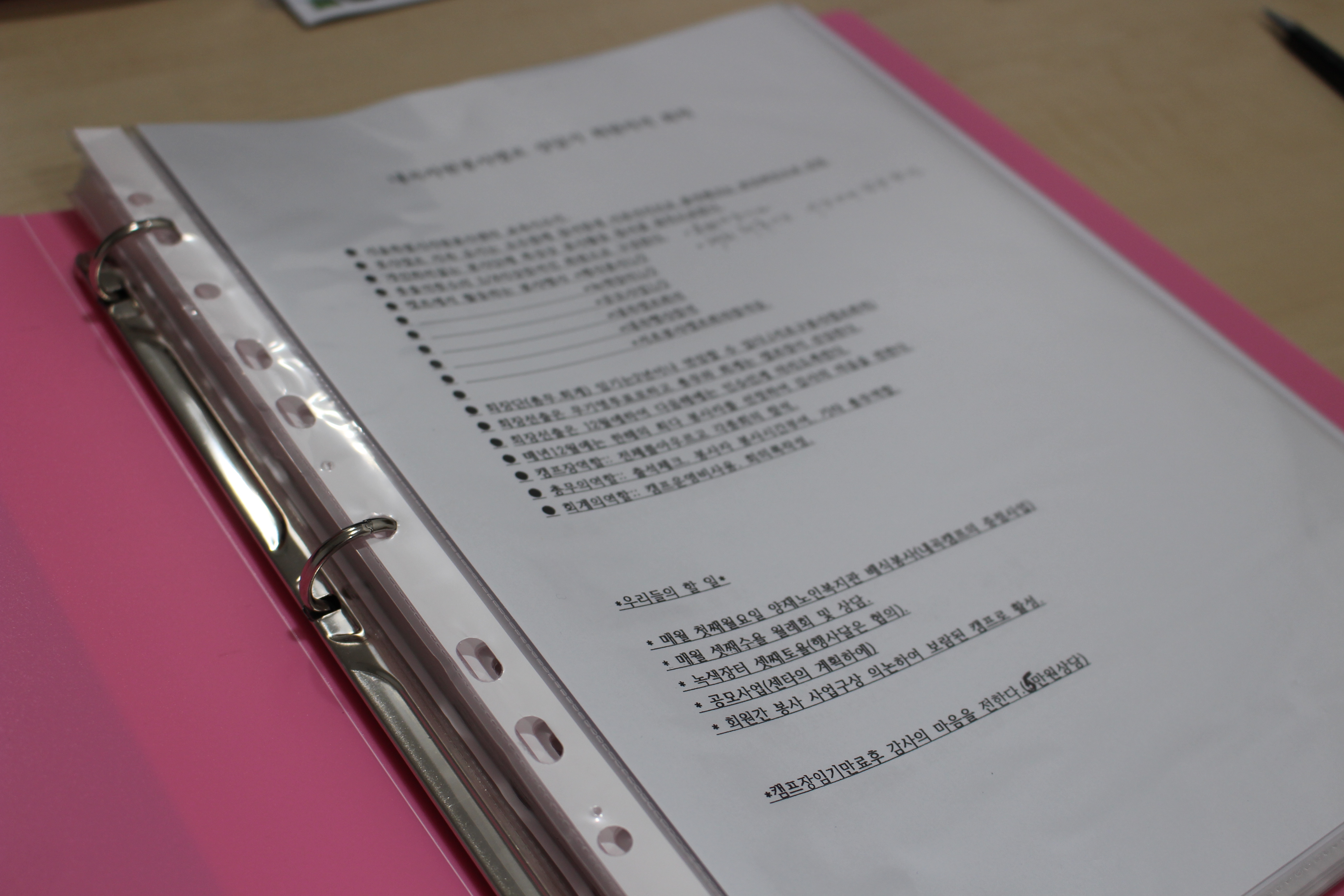 맞아요. 또한 그런 활동들을 더 오래 기억하기 위해 활동 기록을 작성하고 있어요. 그리고 보다 체계적인 캠프 활동을 위해 자원봉사캠프 활동 수칙들을 정하기도 했고요. 이러한 기록들 덕분에 자원봉사캠프 활동을 수월하게 할 수 있었습니다.