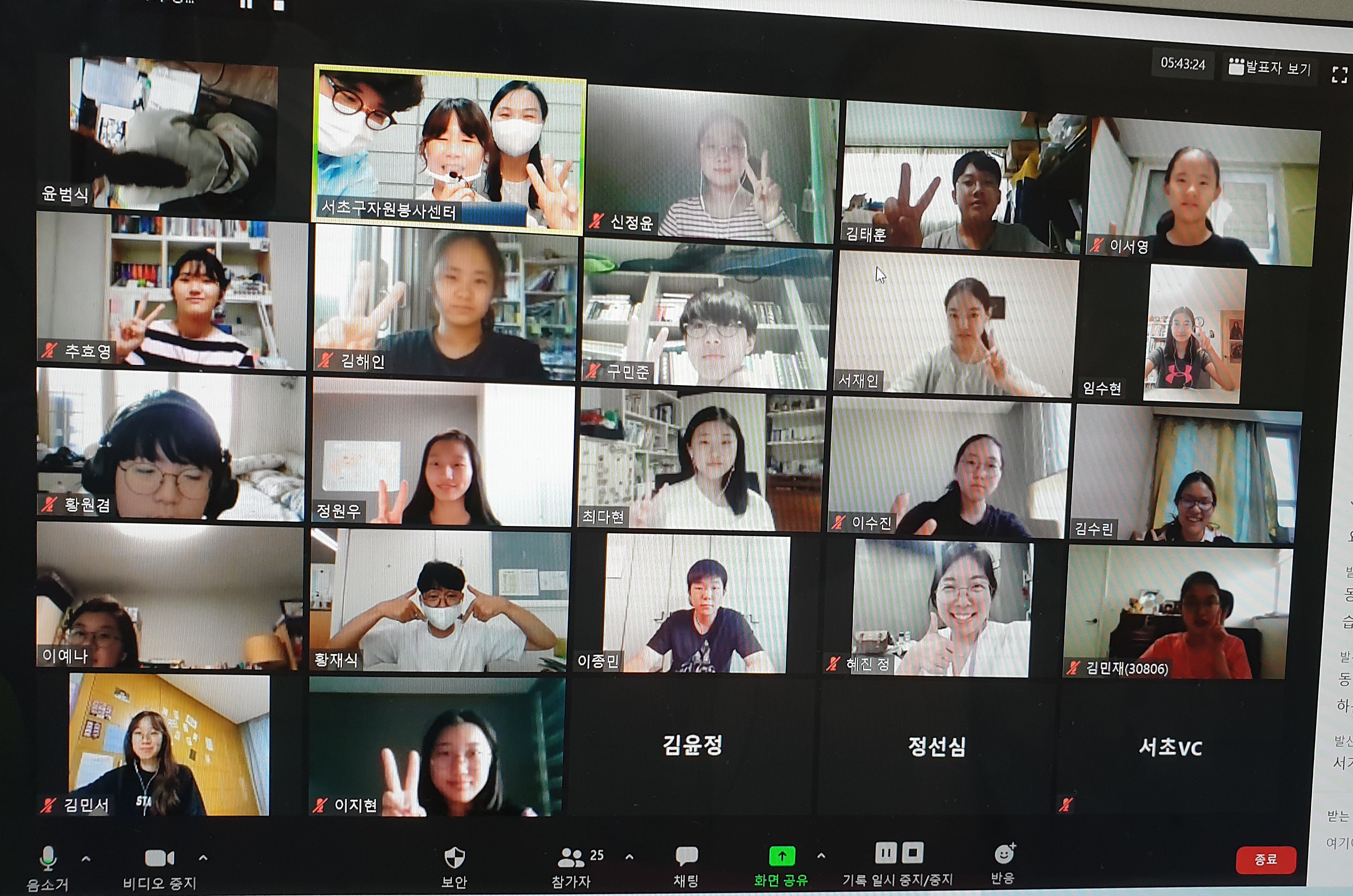 21명의 신동중학교 학생회 임원들과 서리풀 봉사학습 실천학교 멘토로 활동하시는 김윤정, 정선심 선생님, 그리고 센터 담당자 윤범식, 정혜진 선생님이 ZOOM 화상회의로 만난 자리에 저희 안테나들이 함께했습니다!