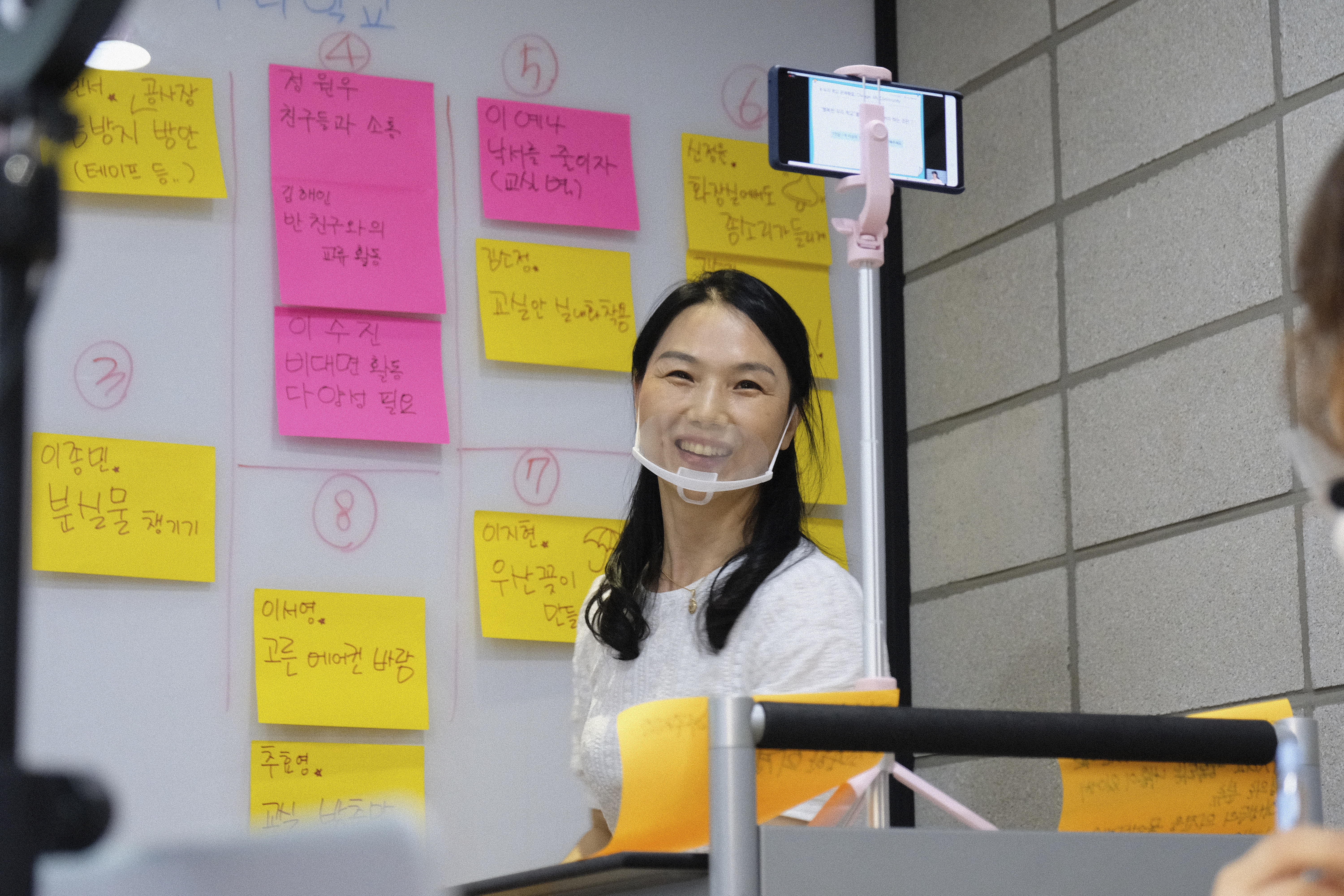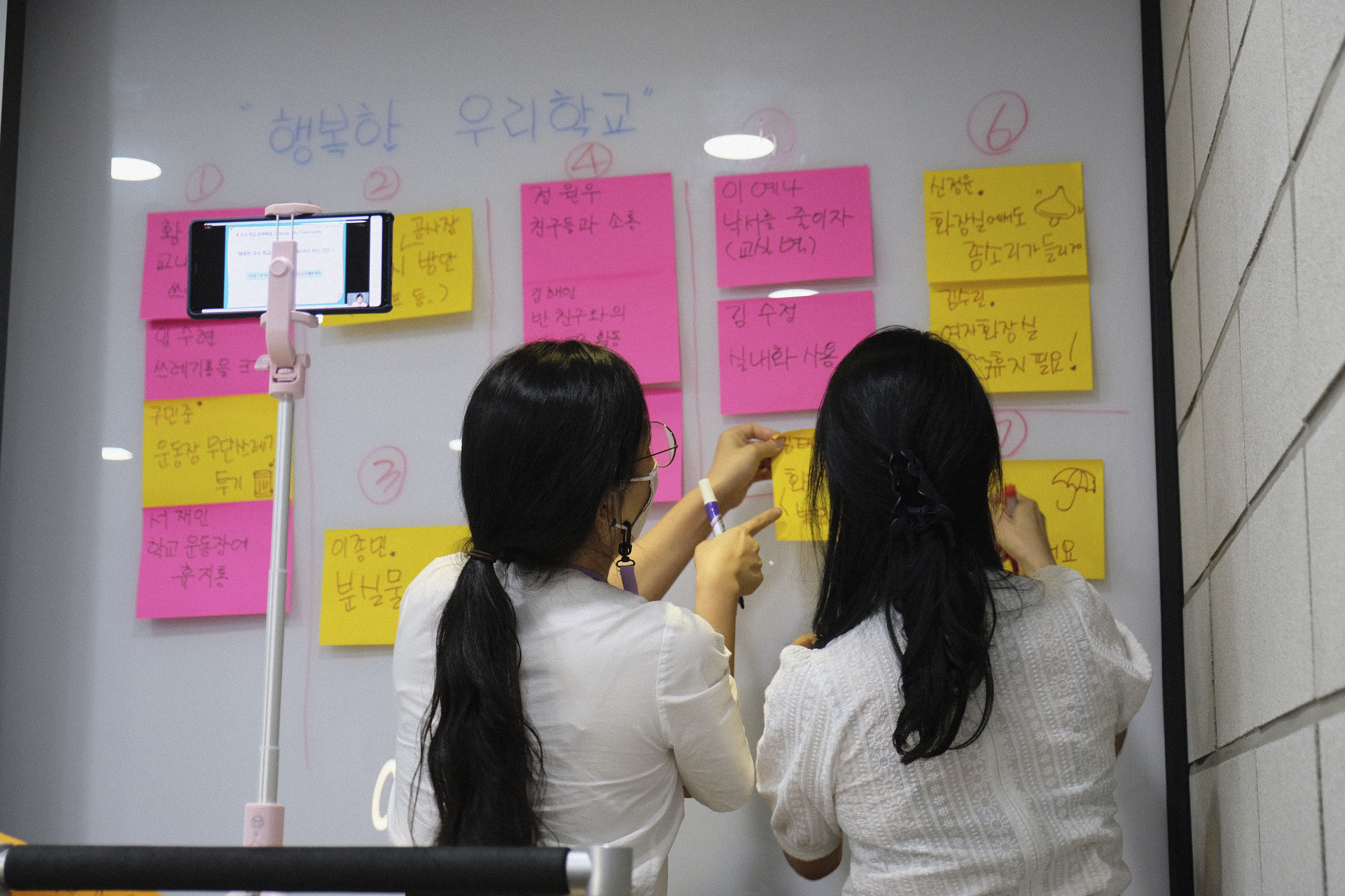 멘토분들은 학생들의 의견을 포스트잇에 적어 칠판에 붙여주었는데요, 조금이나마 오프라인 회의를 하는 것 같은 느낌도 들었답니다. 이렇게 보니 형형색색 메모지들이 꽤 예쁘죠?