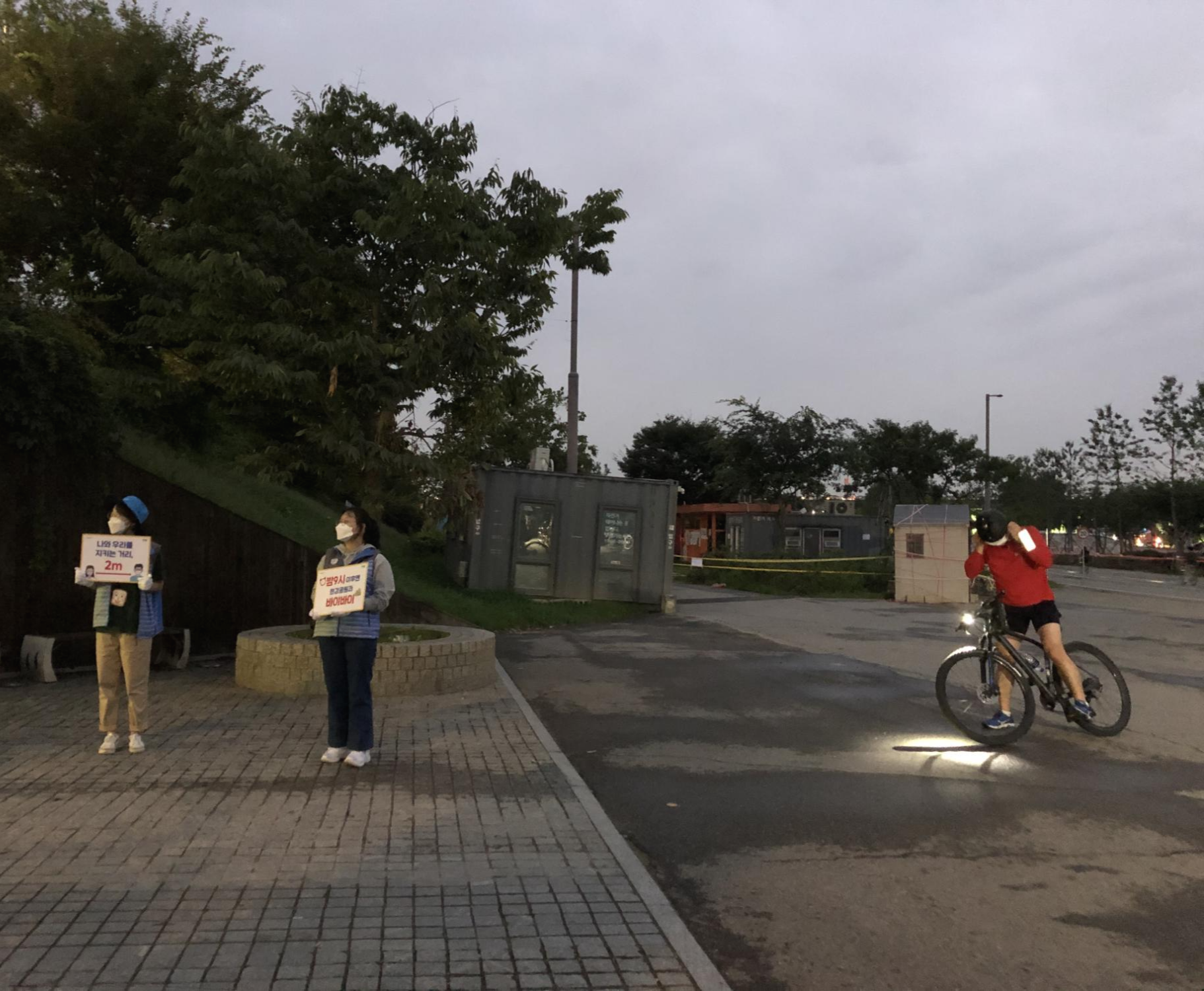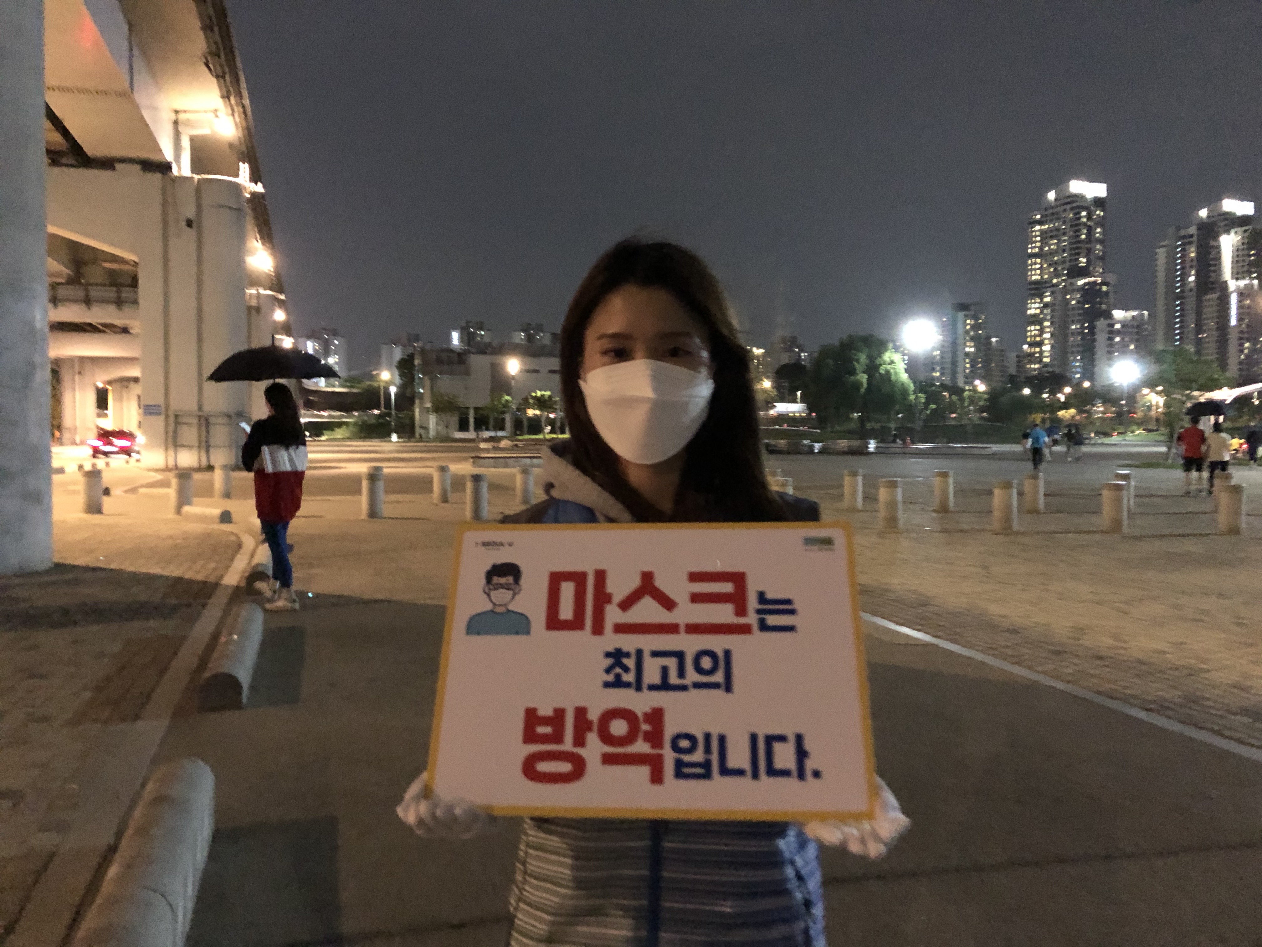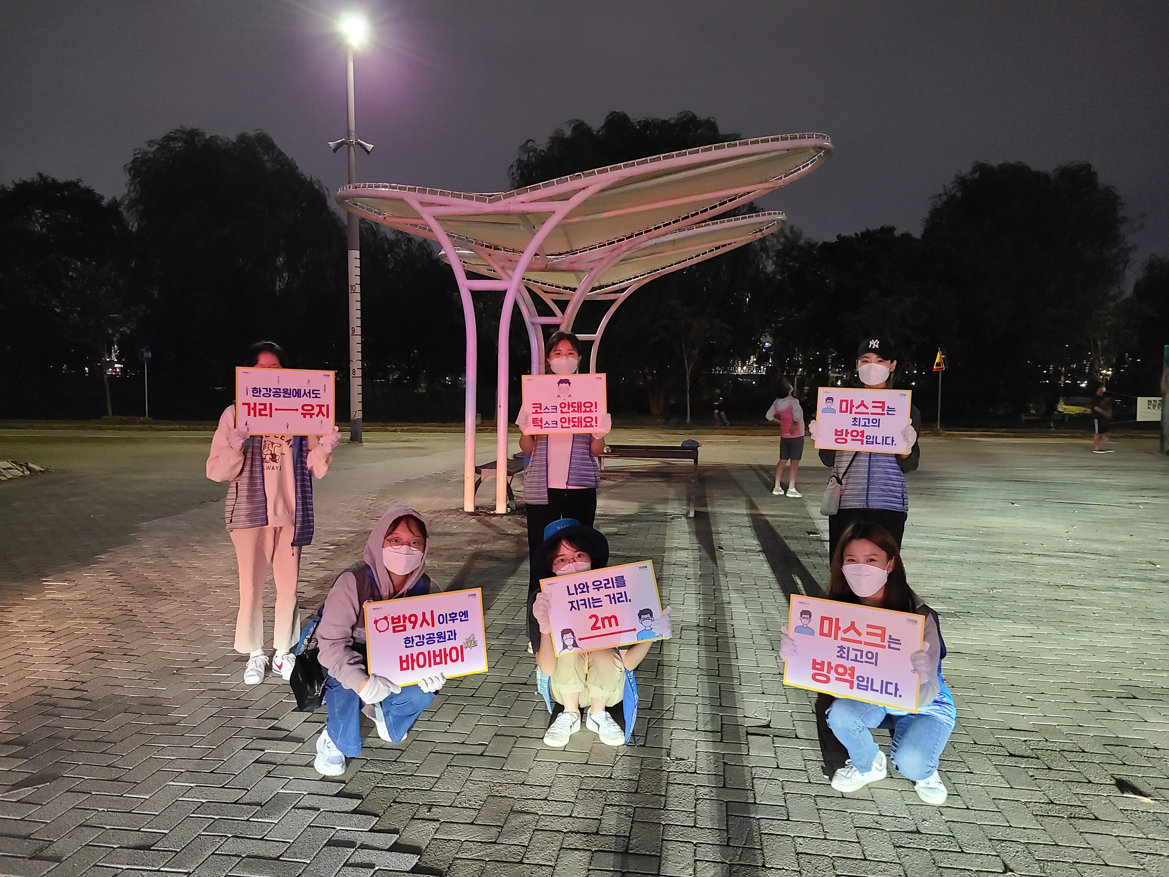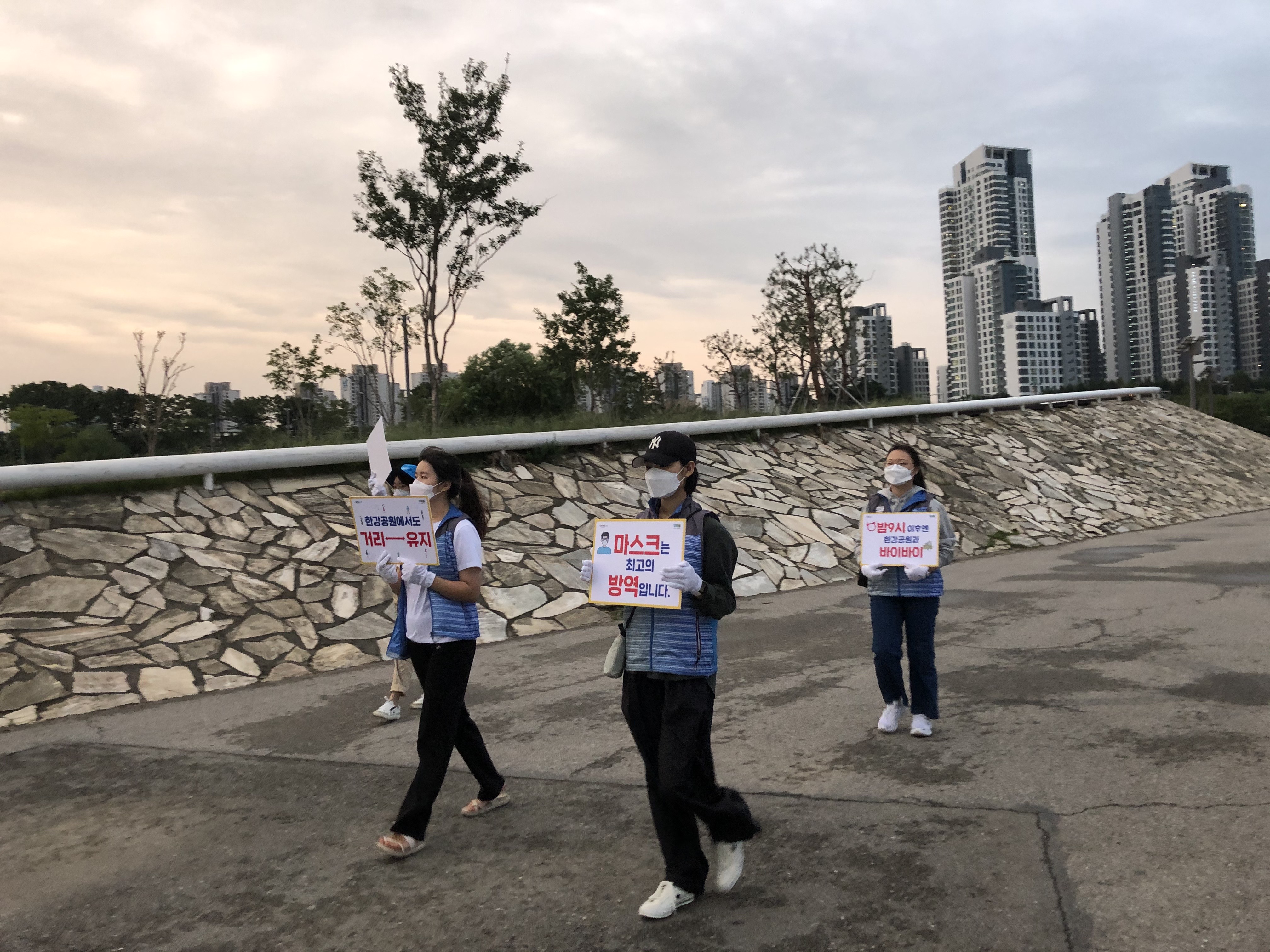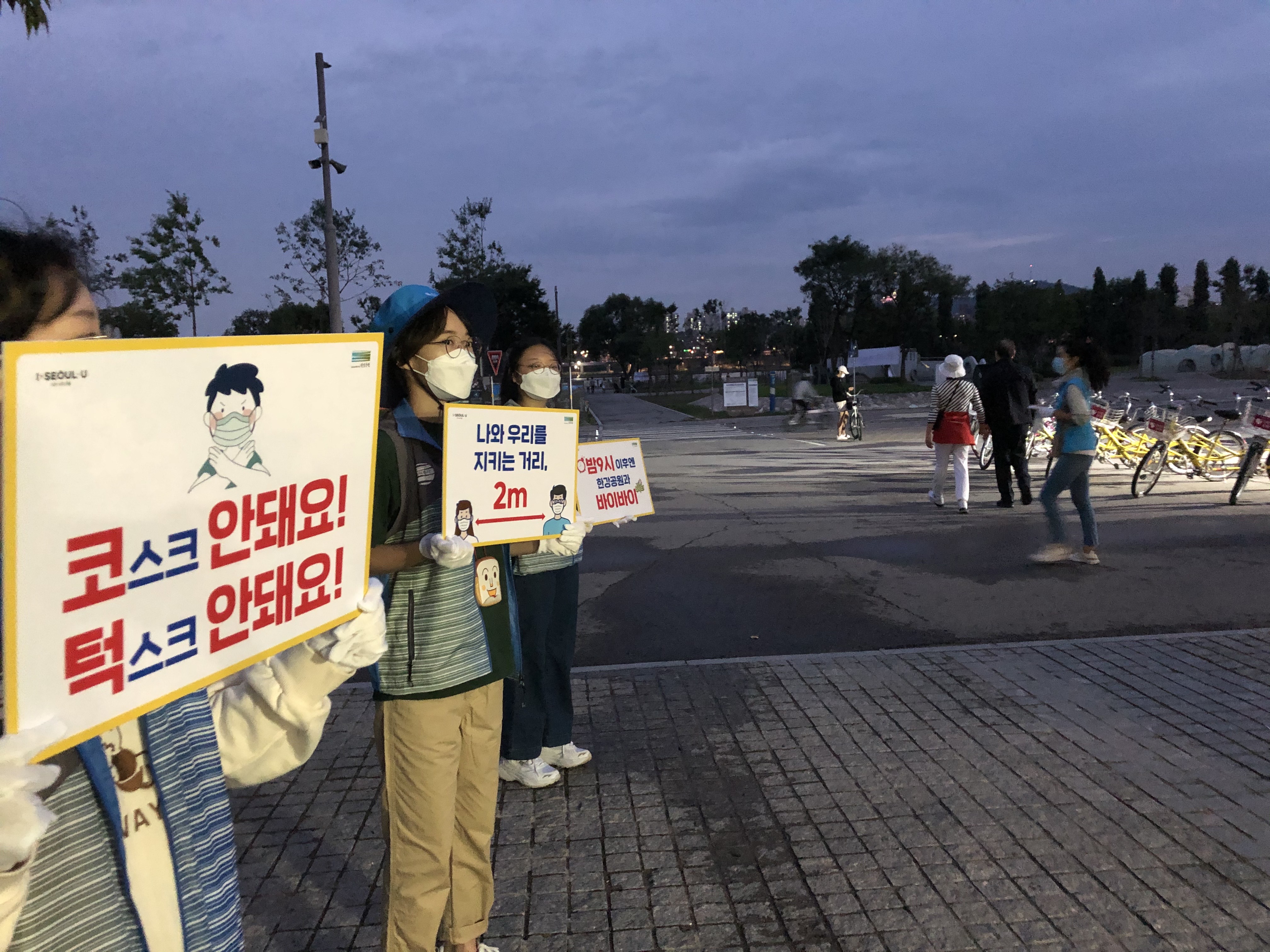 짧은 인터뷰 후에 에너지 충전을 마친 봉사자들과 다시 2차 계도활동에 나섰습니다. 초반보다는 확실히 날이 어두워진 모습이네요. 이 날 비가 꽤 많이 내리고 걷기도 하면서 다소 힘들기도 했지만, 계도활동에 대한 봉사자들의 열정은 식지 않았습니다! 한강공원의 예쁜 야경도 보고, 작게나마 코로나 확진자를 줄이는 데에 기여할 수 있어 뜻깊고 정말 기억에 남는 좋은 시간이었습니다.