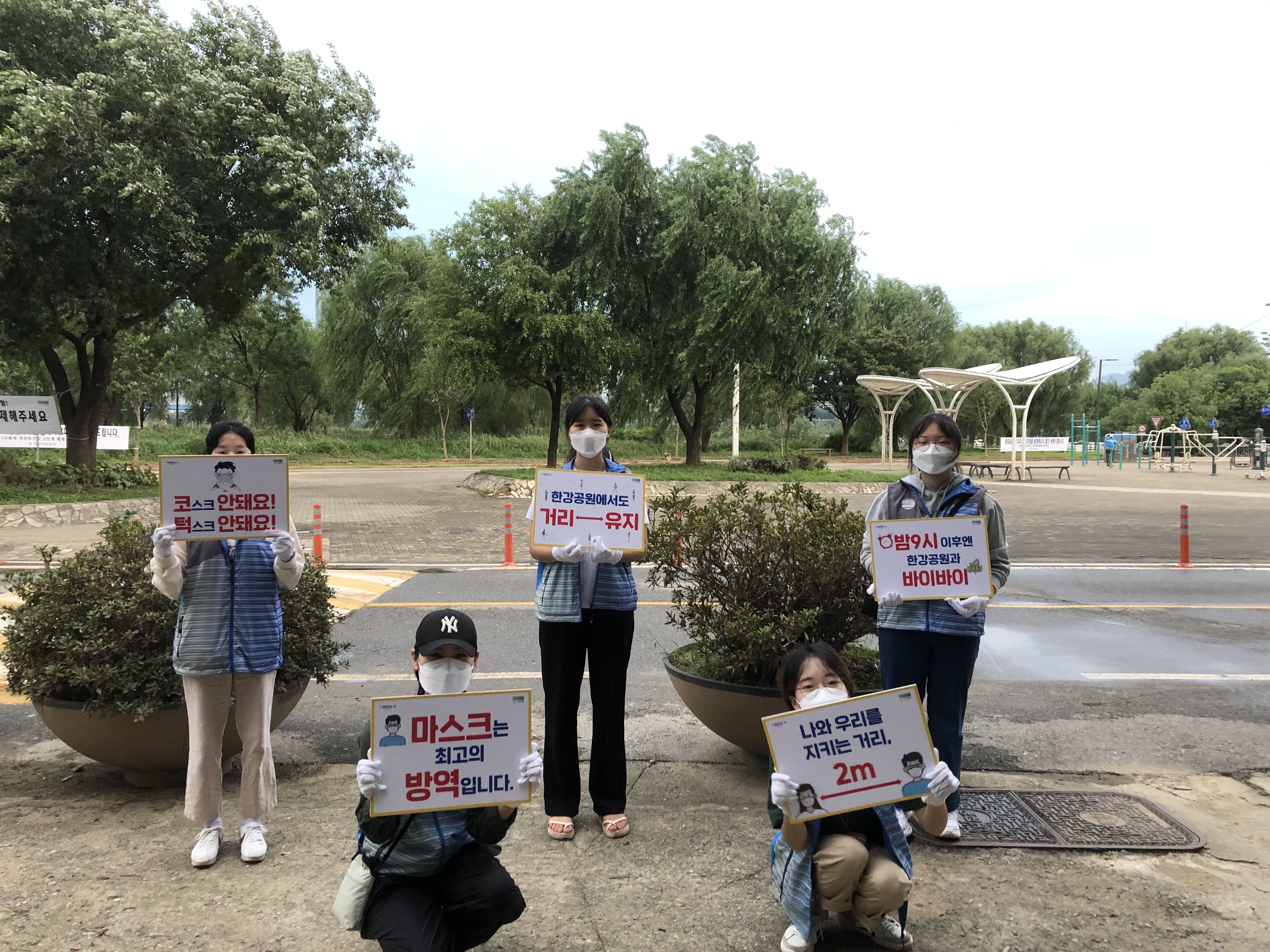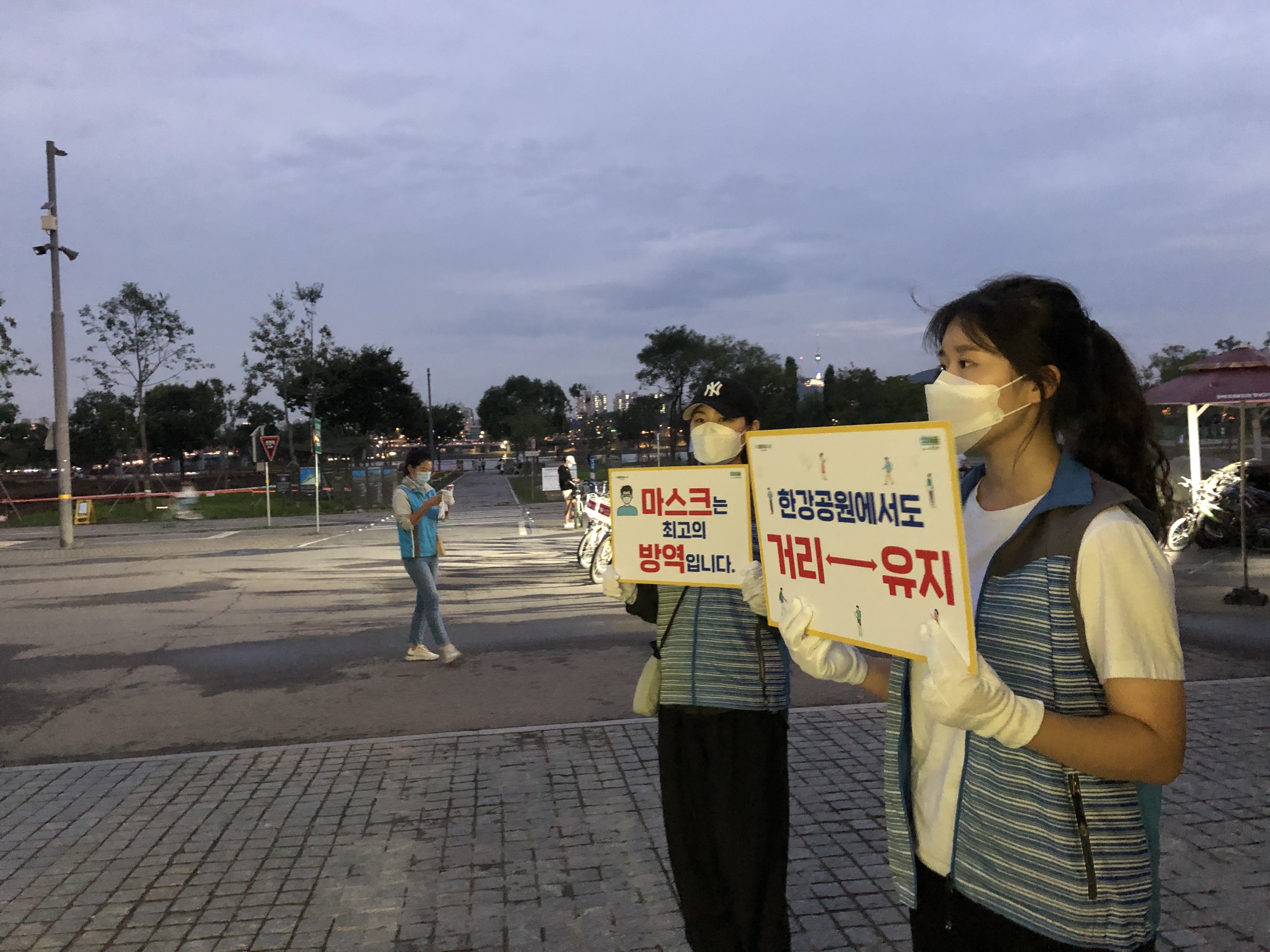 한강공원 계도활동은 수도권 사회적 거리두기 2.5단계가 시행됨에 따라 한강공원을 이용하는 시민들을 대상으로 ①올바른 마스크 착용, ②공원 내 거리두기, ③21시 이후 빠른 귀가에 대해 안내하고 지도하는 활동입니다. 감염병 전염을 최소화시키고, 마스크 착용의 중요성을 일깨워줄 수 있다는 점에서 정말 뜻깊은 활동인 것 같습니다.