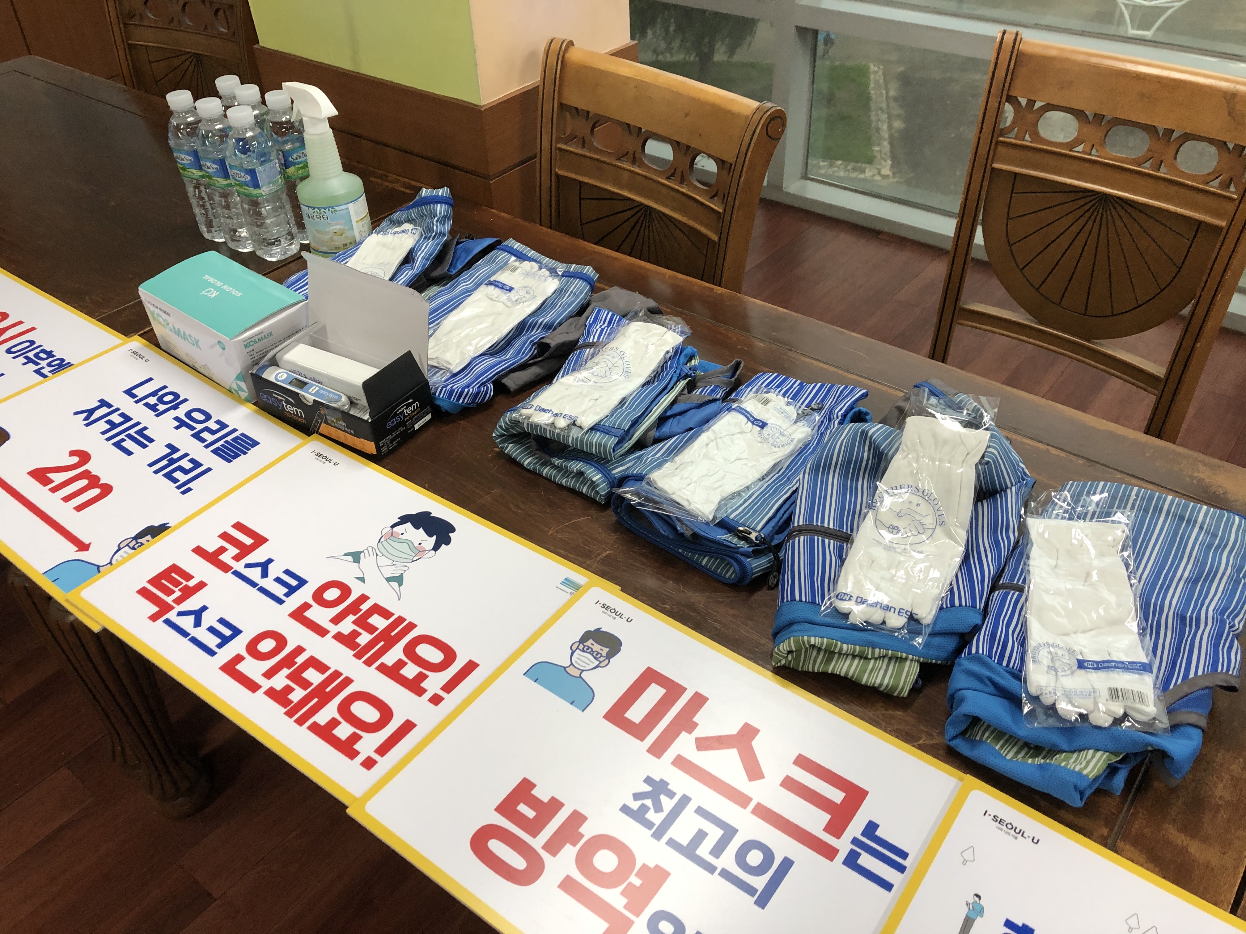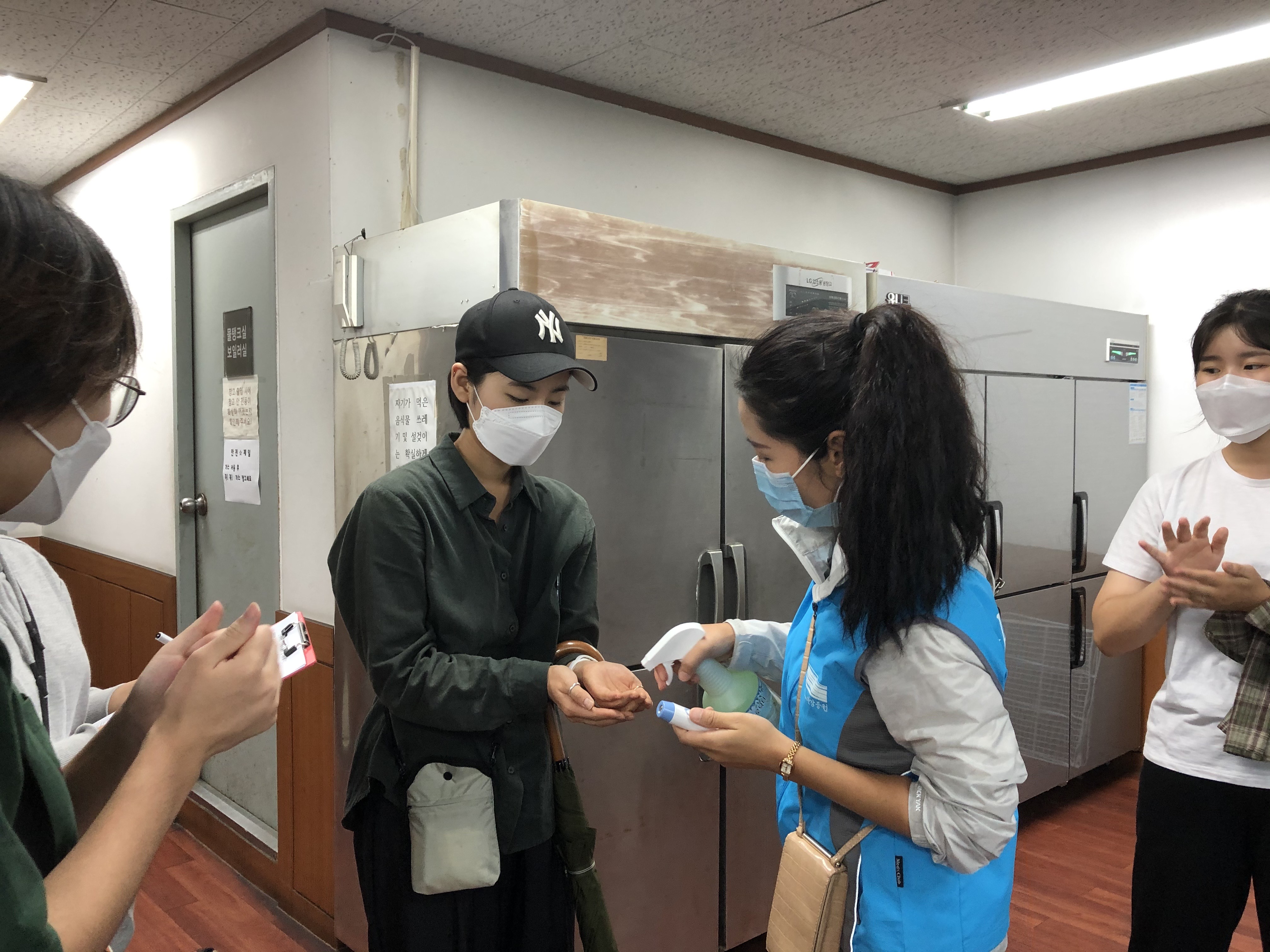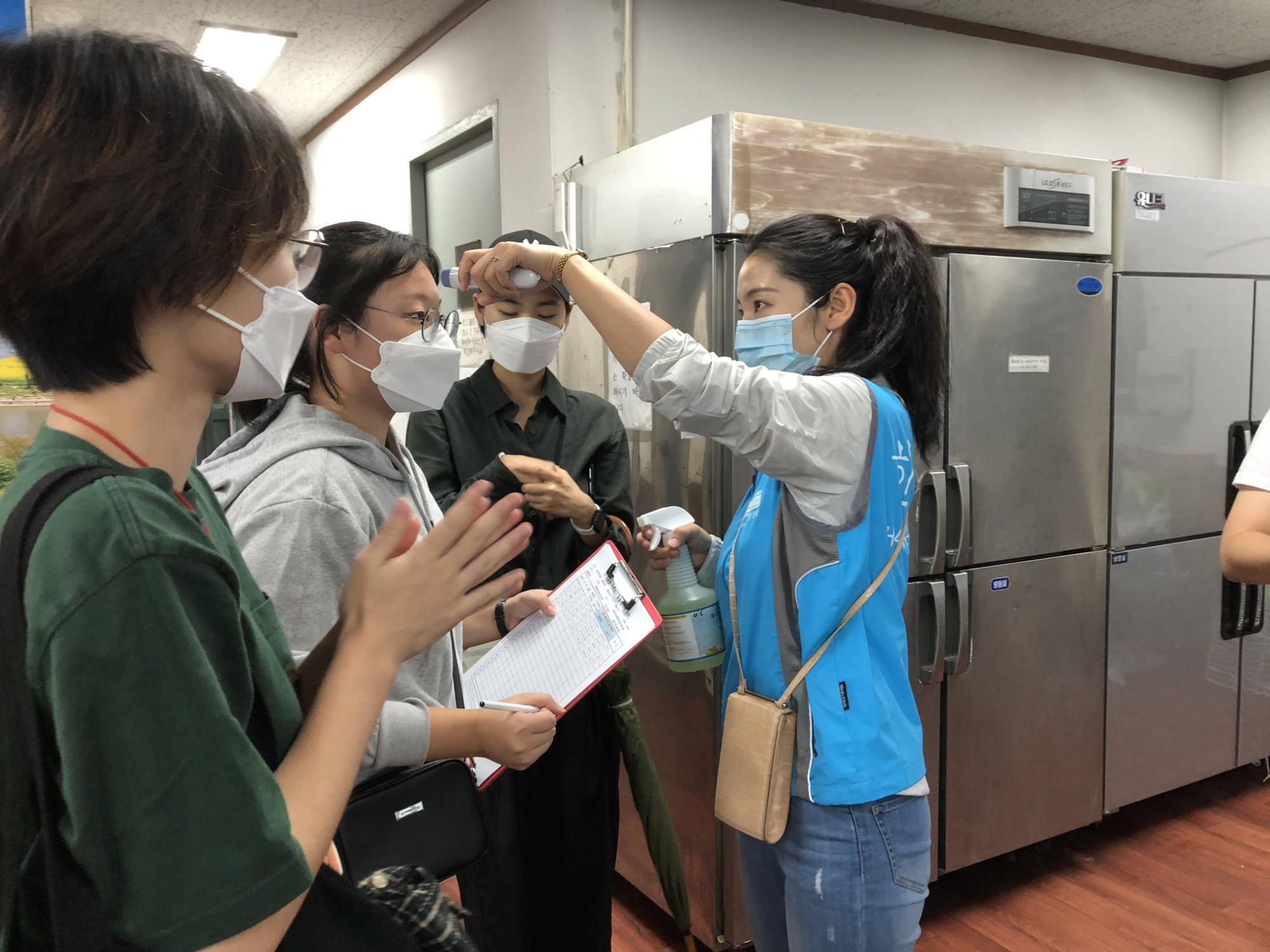 봉사 전 체온 측정과 손 소독을 하고, 사회적 거리두기를 위해 2m 이상 간격을 두며 간단한 OT를 진행했습니다.