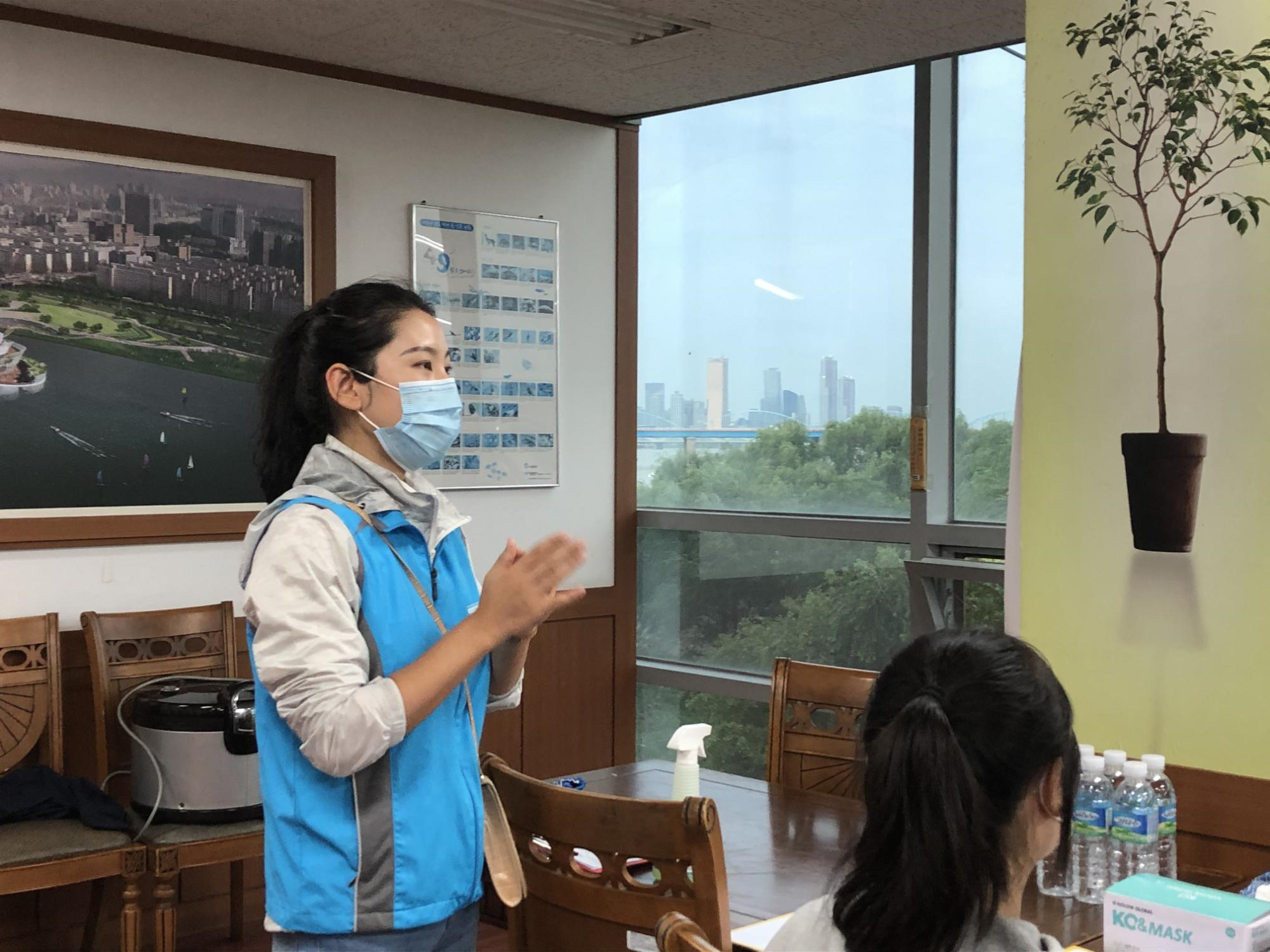 고은아 : 사회적 거리두기 2.5단계가 실시되면서 식당이나 카페의 이용이 어려워진 탓에 사람들이 한강에 모이기 시작하고, 한강공원이 코로나 전파의 시작점이 되는 것 같았습니다. 그래서 한강공원을 중심으로 한 코로나 확산을 늦추기 위해 환경에 관심이 많은 동아리 부원들과 함께 봉사하러 오게 되었습니다.