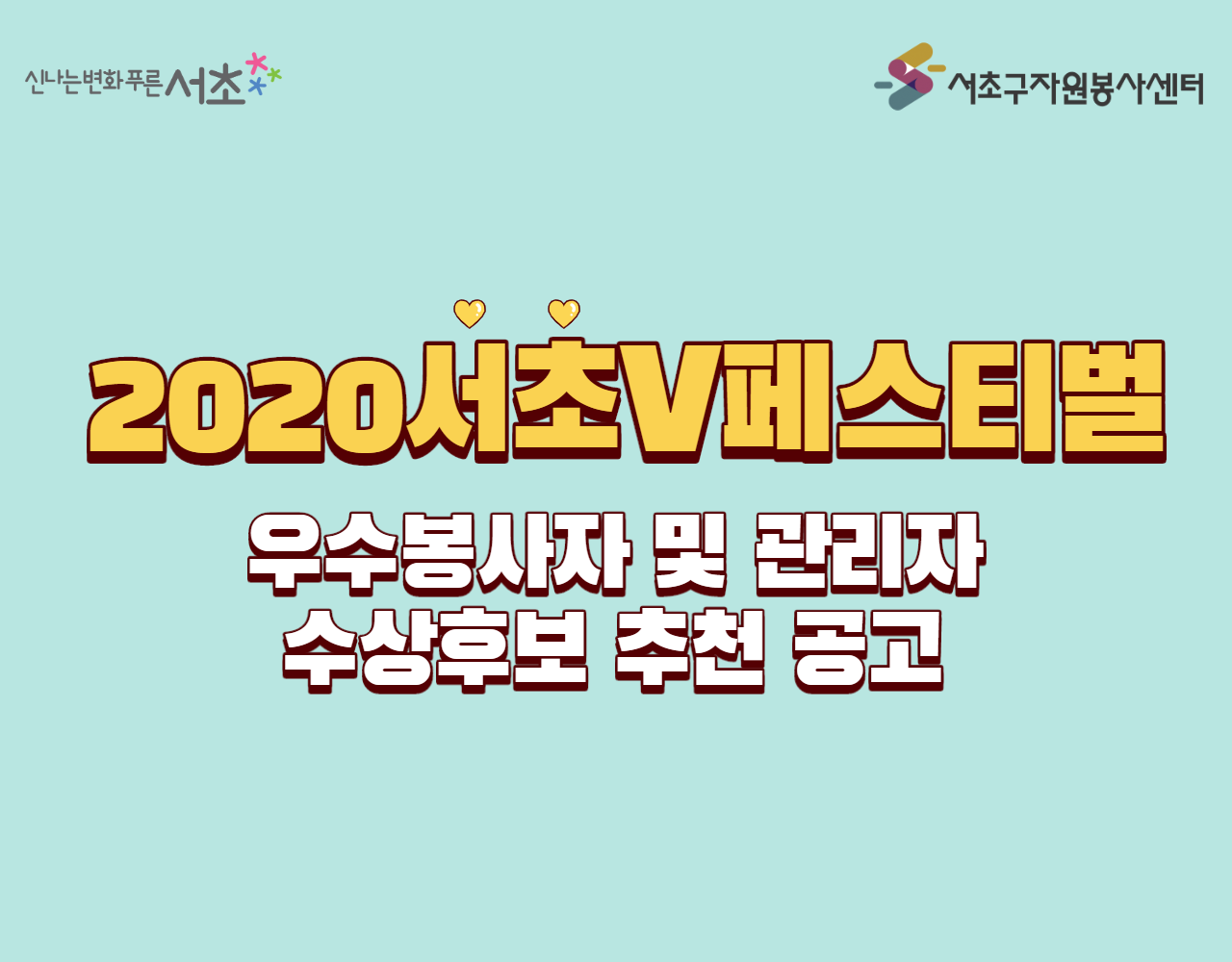우리 센터에서는 자원봉사자들의 공로를 인정하고 활동을 축하하는 자원봉사자 연말대회인 <2020 서초V페스티벌>을 맞이하여 자원봉사활동에 모범을 보인 자원봉사자(개인 및 단체)와 자원봉사관리에 있어서 우수한 업무를 수행한 관리자들을 격려하고 인정하는 자리를 마련하고자 합니다. 특히 이번 시상에는 코로나19 시기에도 이웃을 돌보고 위기를 함께 극복하기 위해 다양한 활동으로 수고해 주신 분들을 위하여 특별부문이 신설되었습니다.