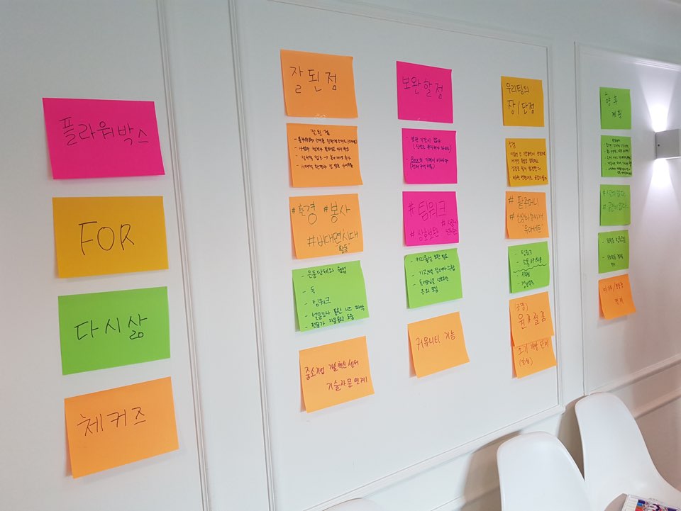 우선 본격적으로 간담회를 시작하기 전에 각 팀이 각자의 사업의 잘된 점, 보완할 점, 장단점, 향후 계획에 대해 생각해보고 정리해보는 시간을 가졌습니다. 팀원들이 함께 논의하면서 사업의 과거, 현재, 미래에 대해 얘기해볼 수 있는 뜻깊은 시간이었습니다. 그리고 각자 논의한 사항들을 포스트잇에 간단하게 적은 뒤 벽에 붙여서 모두 함께 볼 수 있도록 정리해보았습니다.