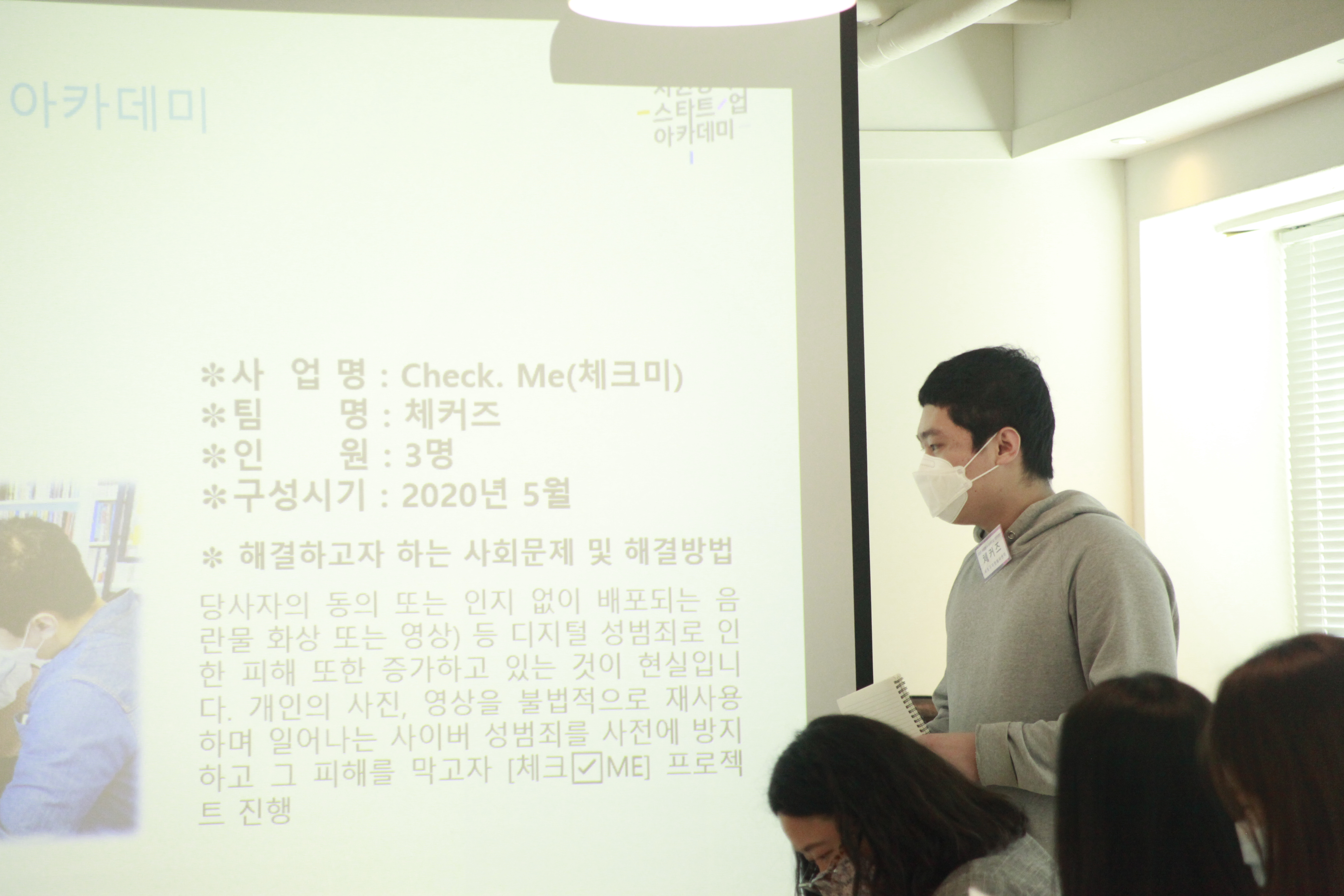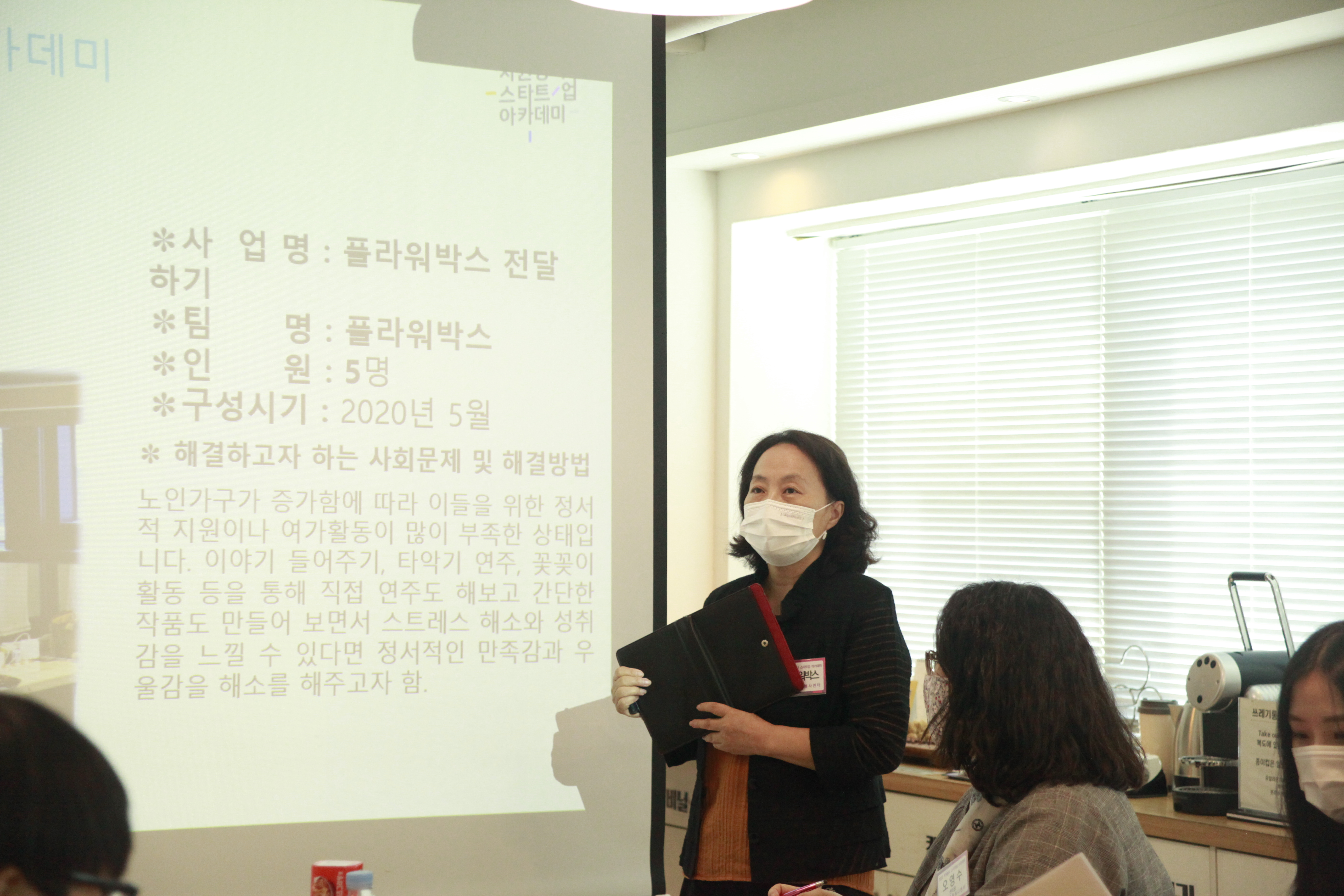 이후에는 각 팀에서 한 명씩 나와서 팀별 활동내용을 공유하는 시간을 가졌습니다. 플라워박스, 체커즈, FOR, 다시삶 팀 순서대로 각 사업의 배경과 지난 활동 내용을 공유하며 사업을 성장시키기 위한 고민의 과정들을 함께 나눠보았습니다. 2달이라는 짧은 시간동안 각 팀이 사업 성장을 위해 고민하고 노력한 과정들을 잘 알아볼 수 있는 시간이었습니다.