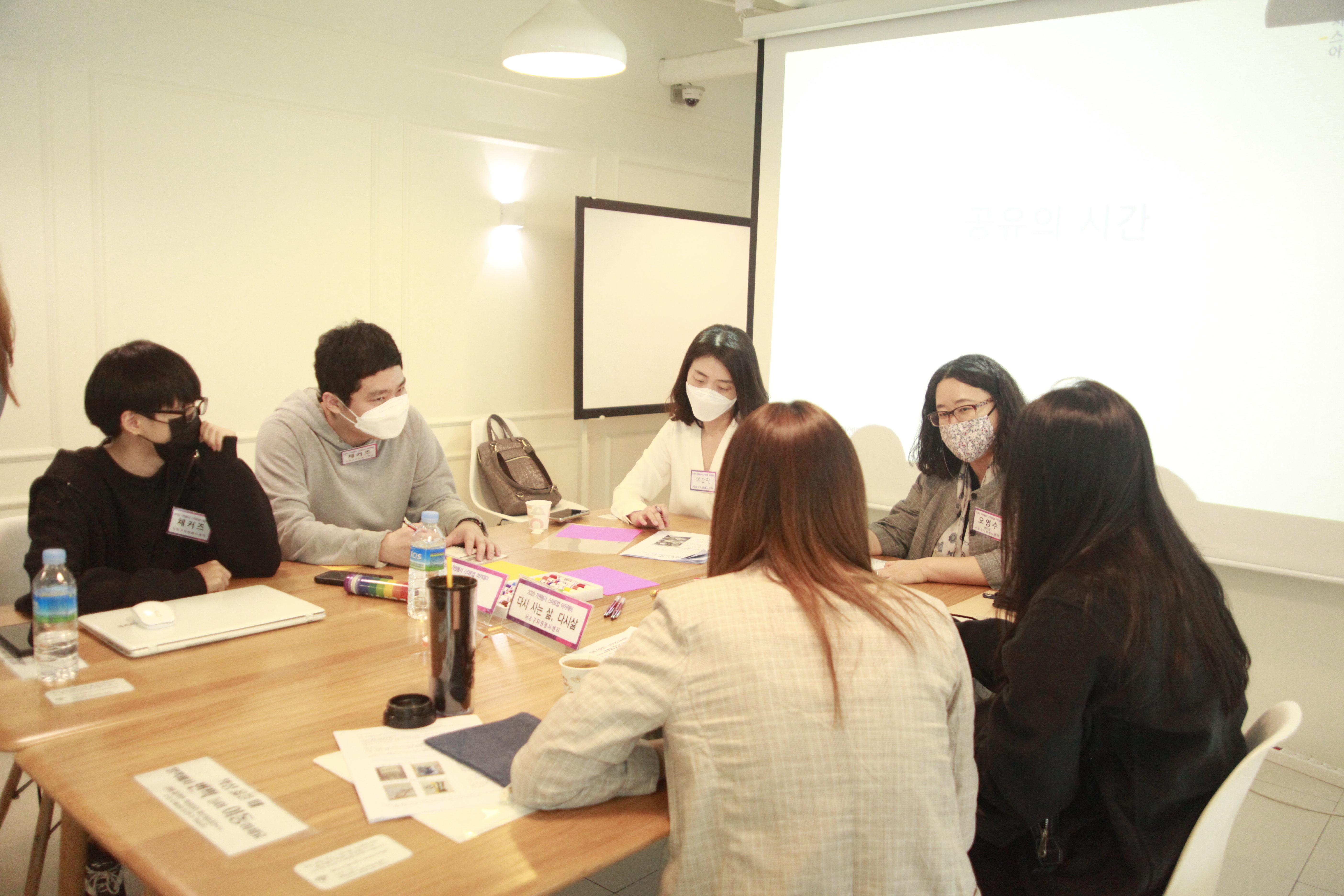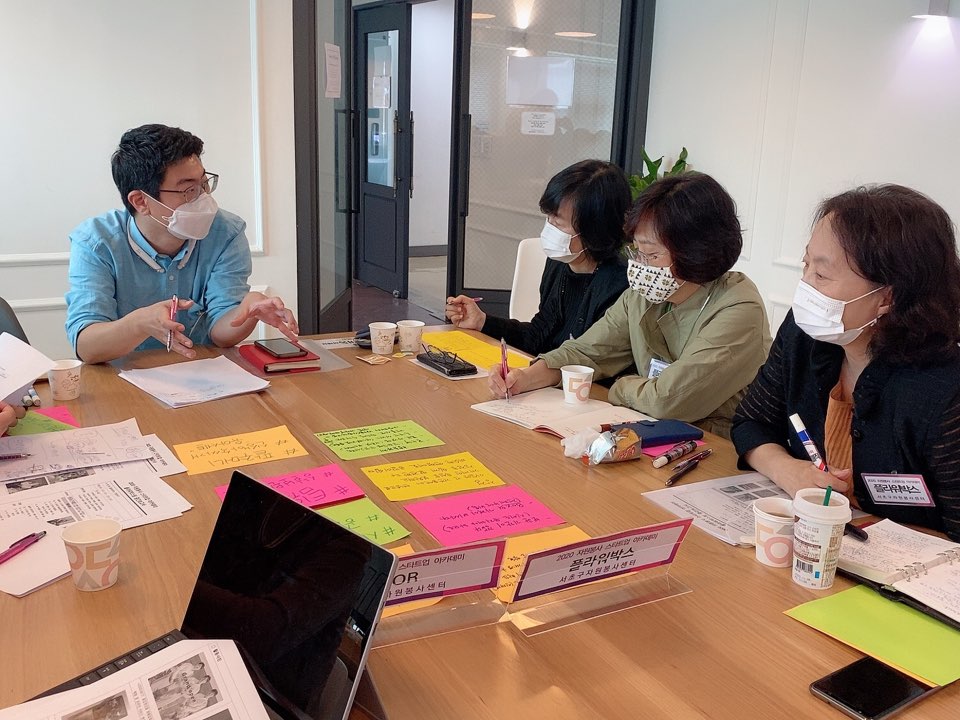 쉬는 시간 이후에는 2팀씩 나누어서 팀별 고민에 대해 얘기해보고 그에 대한 컨설턴트 분들의 피드백과 컨설팅이 있었습니다. 다시삶 팀과 체커스팀에는 이소진 사무처장님과 오영수 센터장님이 컨설팅을 해주셨고, 플라워박스 팀과 FOR팀에는 김영주 이사님과 서인호 과장님이 컨설팅을 해주셨습니다. 이 시간은 각 팀의 고민에 대해 허심탄회하게 얘기하면서도 그러한 고민들을 어떤 방향으로 잘 해결하면 좋을지, 그리고 앞으로의 사업 성장을 위해 더 고려해야할 것은 무엇인지 컨설턴트 분들과 함께 고민해볼 수 있는 시간이었습니다.