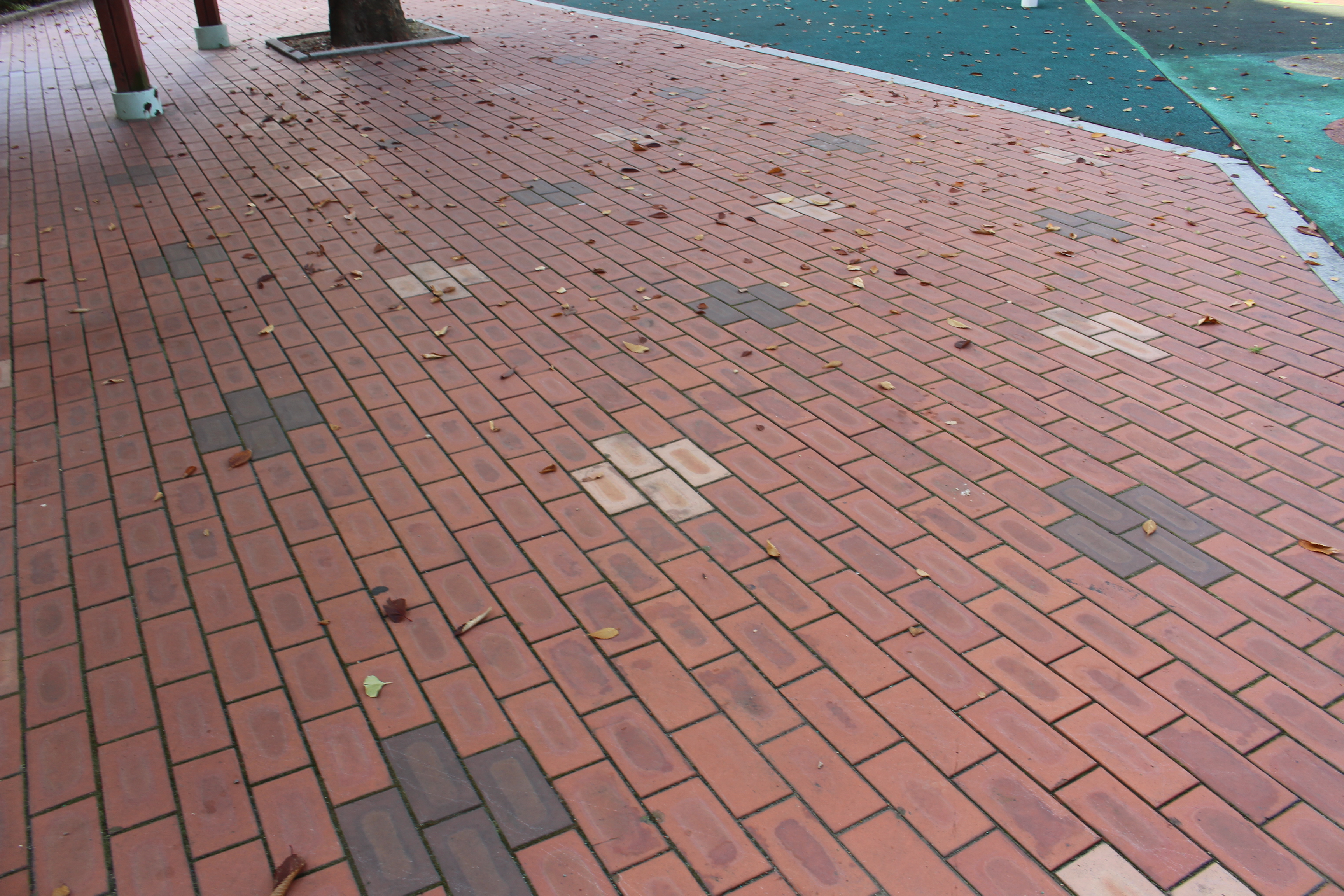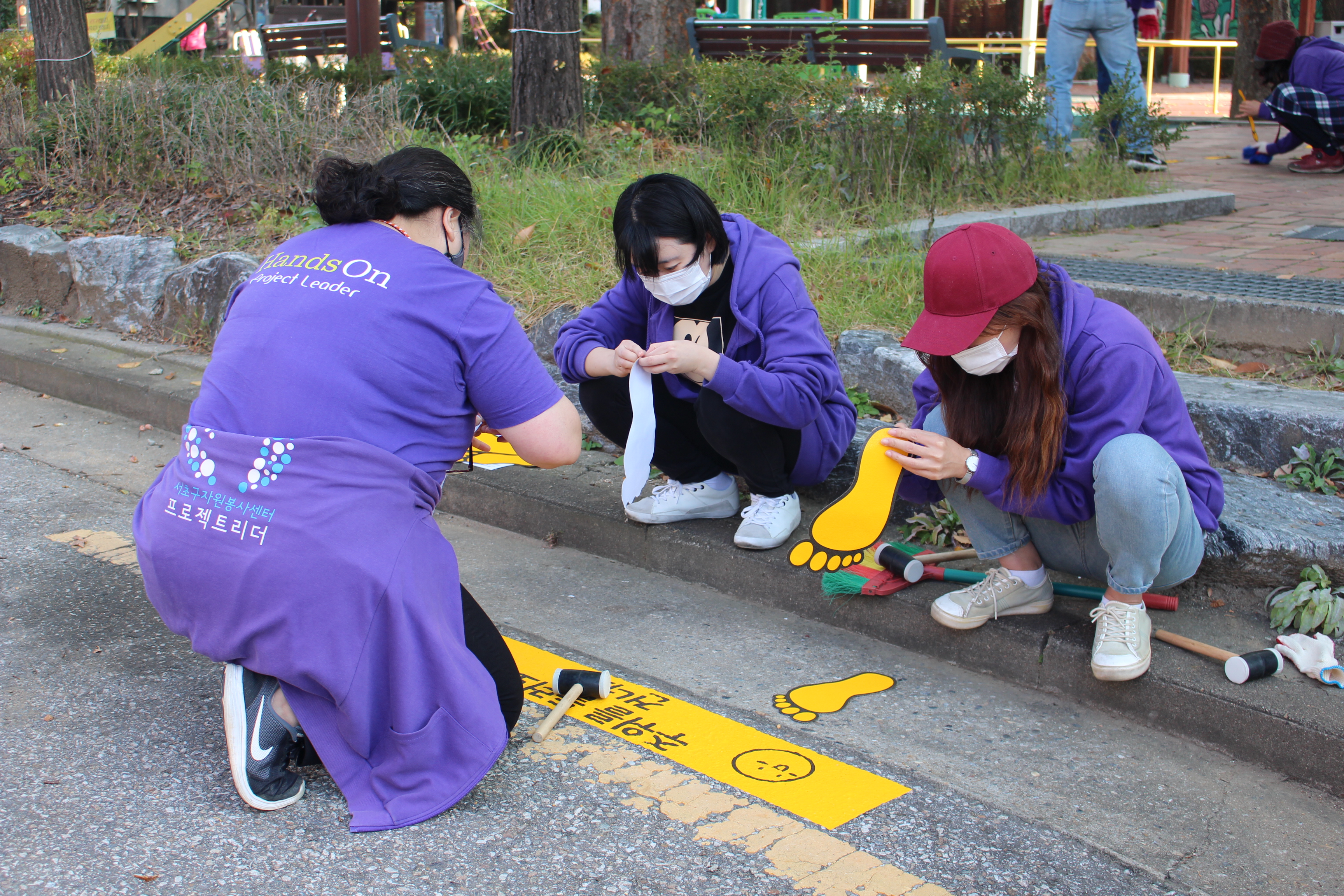 다른 PL들은 입구 바로 앞에 발자국 스티커를 붙였습니다. 아이들의 보폭을 고려해 알맞은 거리로 스티커를 놓고, 마찬가지로 고무망치로 두드렸습니다. 아이들이 안전선을 통해 공원으로 안내받고, 발자국에 따라 가볍게 뛰노는 놀이를 할 수 있겠죠?