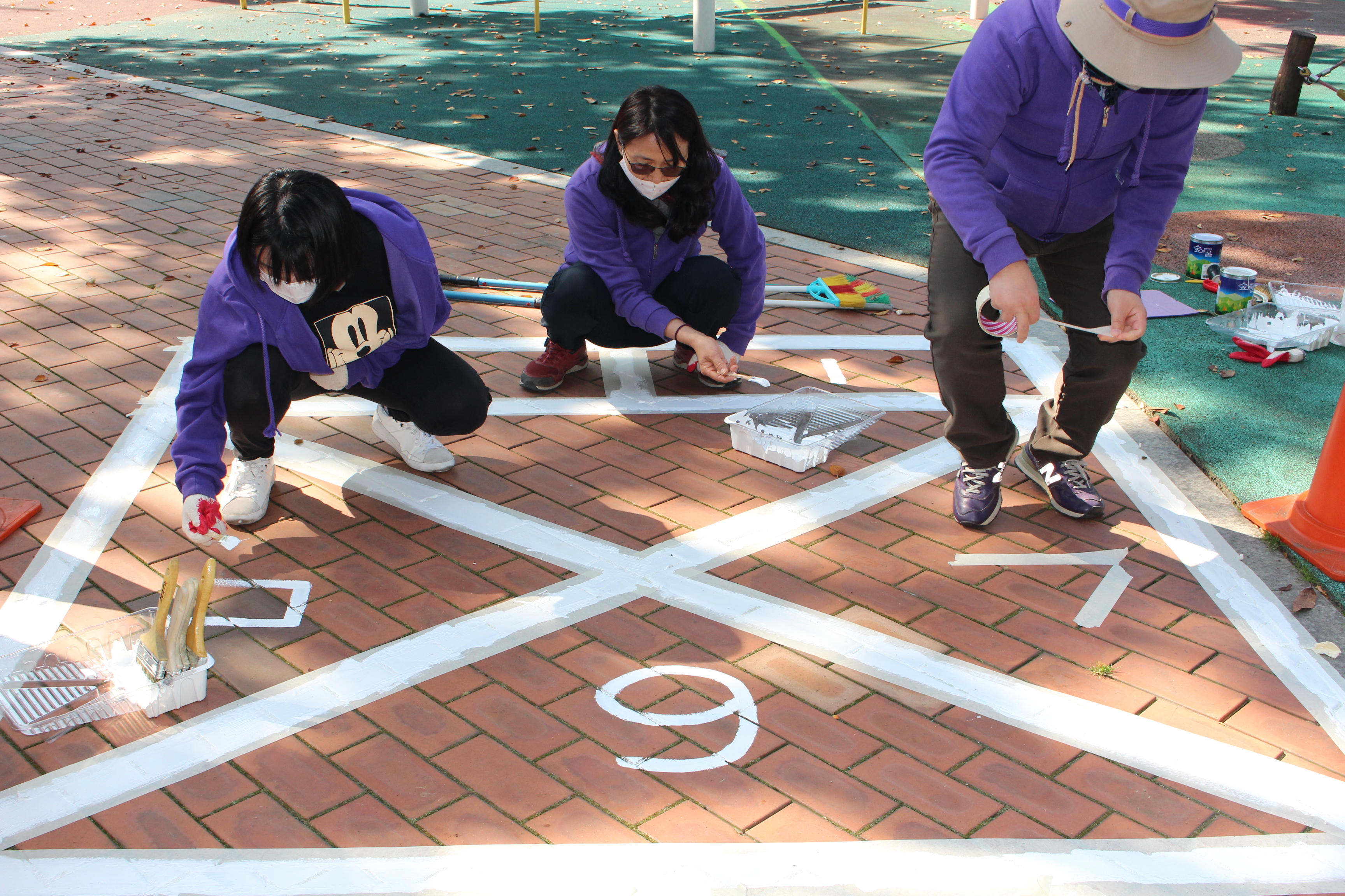 벤치 앞쪽에는 사방치기를 그렸습니다. 먼저 줄자로 치수를 재고 테이프로 연결해 바탕을 잡았습니다. 아무것도 없는 바닥에 만들다 보니 신중함이 요구되어 시간이 가장 오래 걸린 활동이었습니다. PL들이 허리를 굽혀 열심히 하다보니, 어느새 사방치기의 모양이 드러나서 저도 함께 뿌듯했습니다.