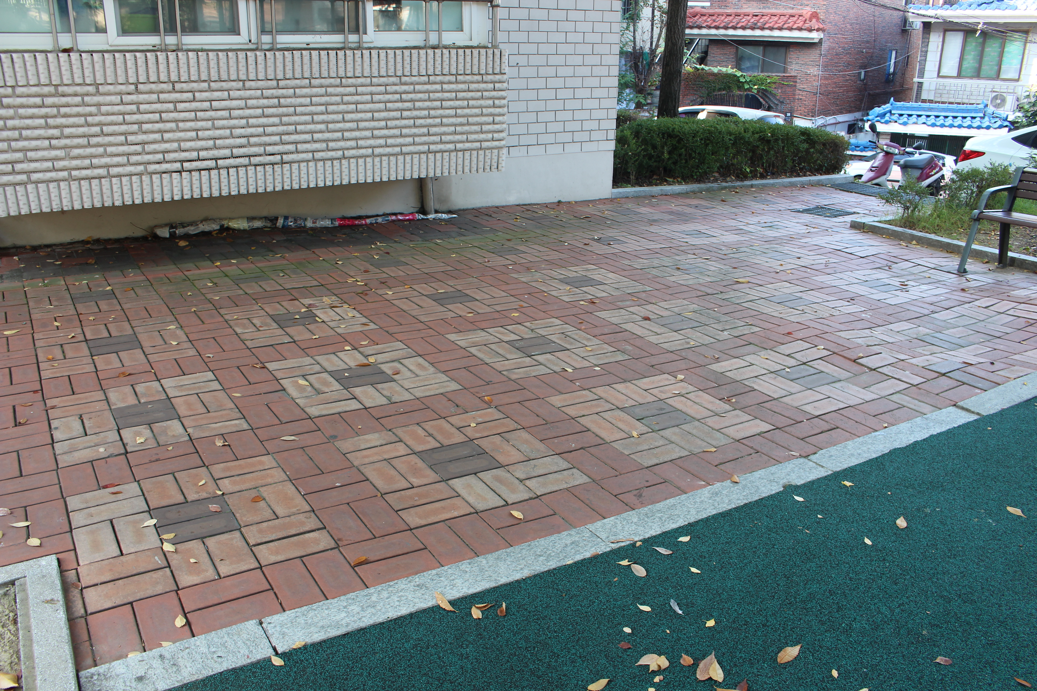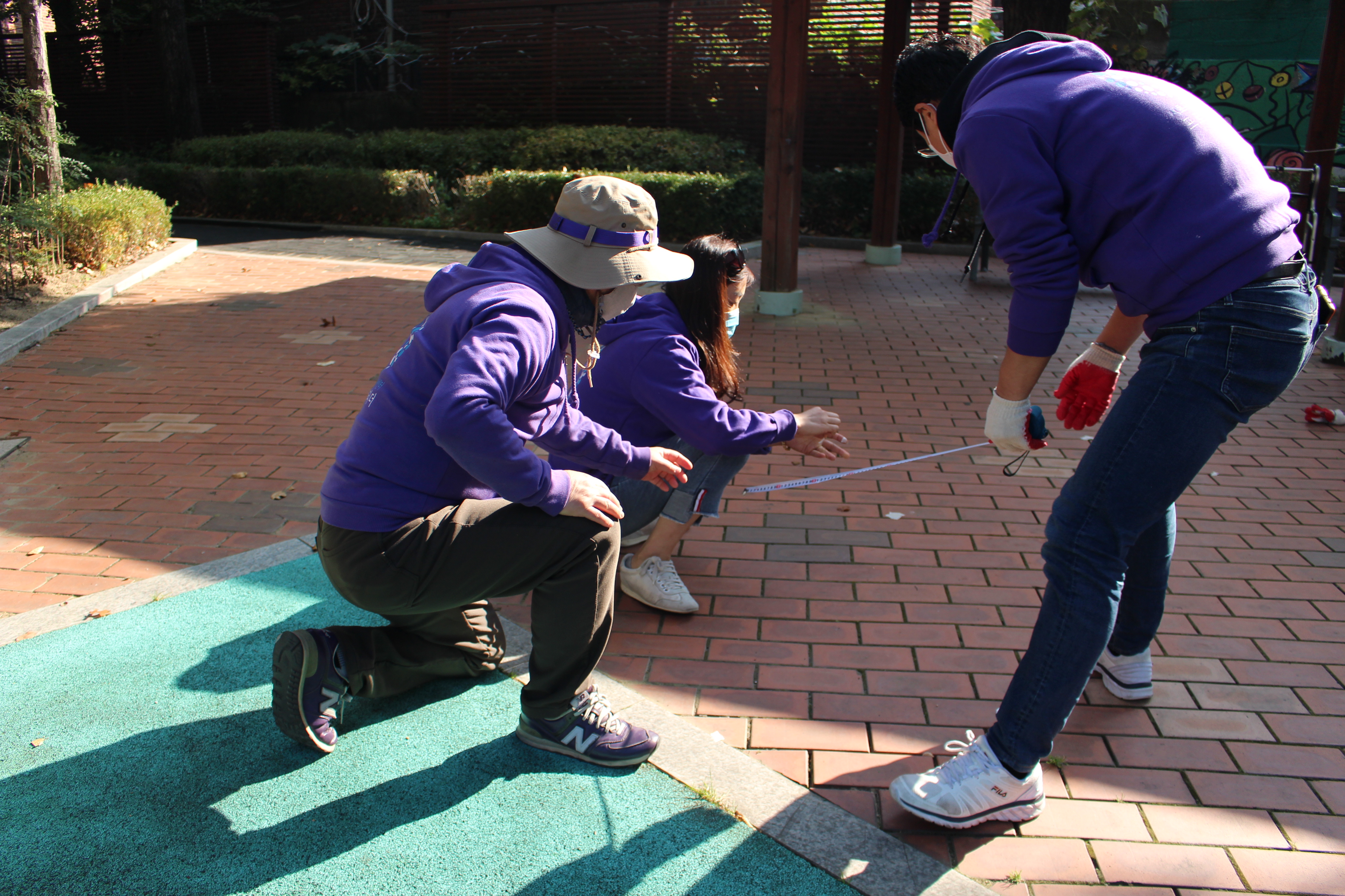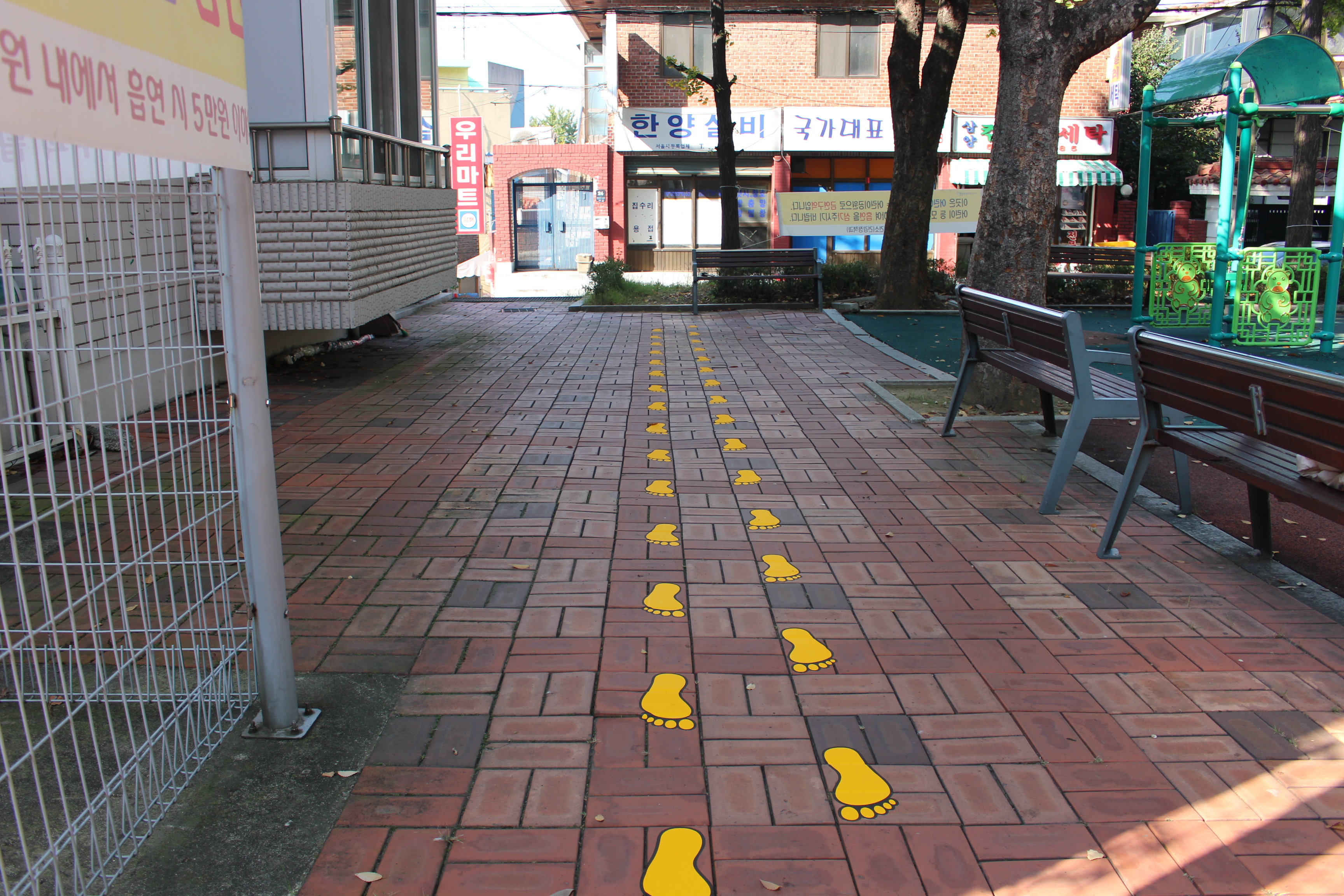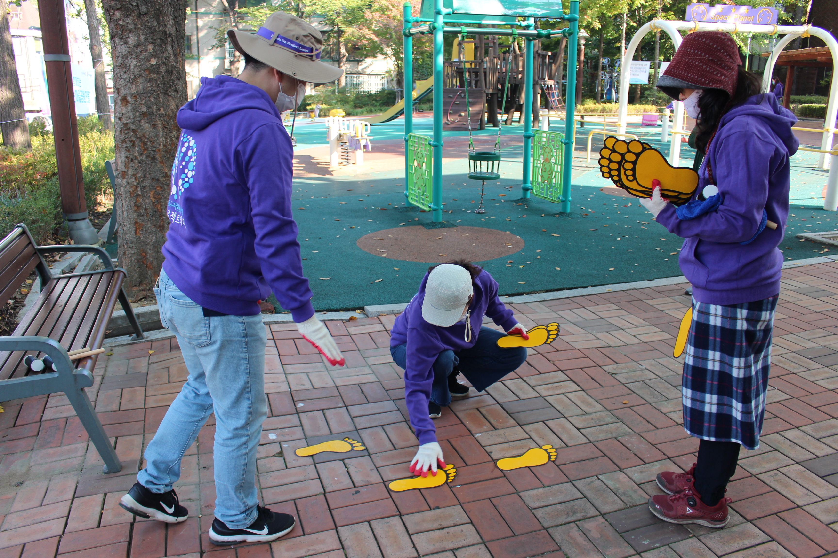 다른 PL들은 입구 바로 앞에 발자국 스티커를 붙였습니다. 아이들의 보폭을 고려해 알맞은 거리로 스티커를 놓고, 마찬가지로 고무망치로 두드렸습니다. 아이들이 안전선을 통해 공원으로 안내받고, 발자국에 따라 가볍게 뛰노는 놀이를 할 수 있겠죠?