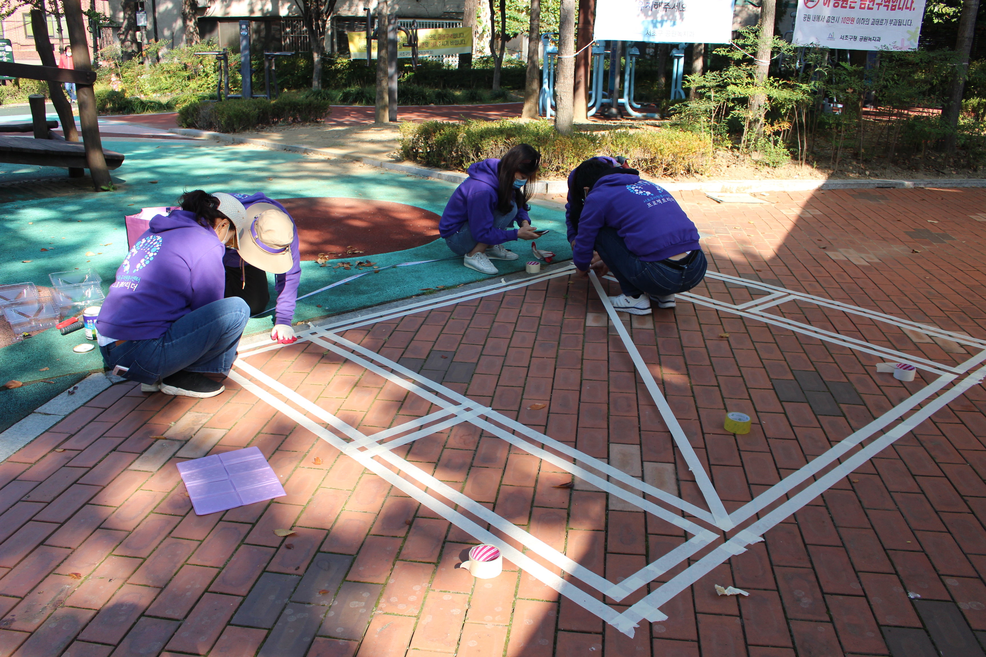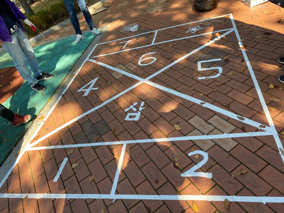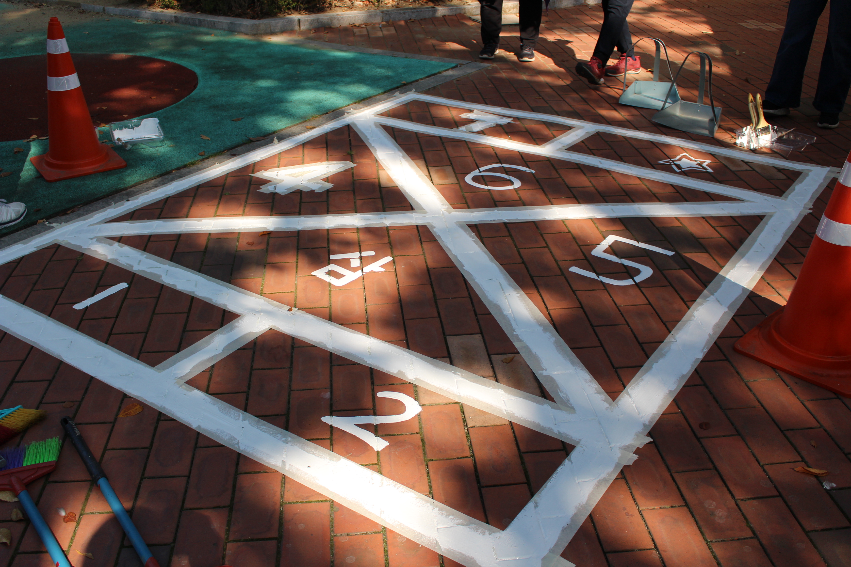 벤치 앞쪽에는 사방치기를 그렸습니다. 먼저 줄자로 치수를 재고 테이프로 연결해 바탕을 잡았습니다. 아무것도 없는 바닥에 만들다 보니 신중함이 요구되어 시간이 가장 오래 걸린 활동이었습니다. PL들이 허리를 굽혀 열심히 하다보니, 어느새 사방치기의 모양이 드러나서 저도 함께 뿌듯했습니다.