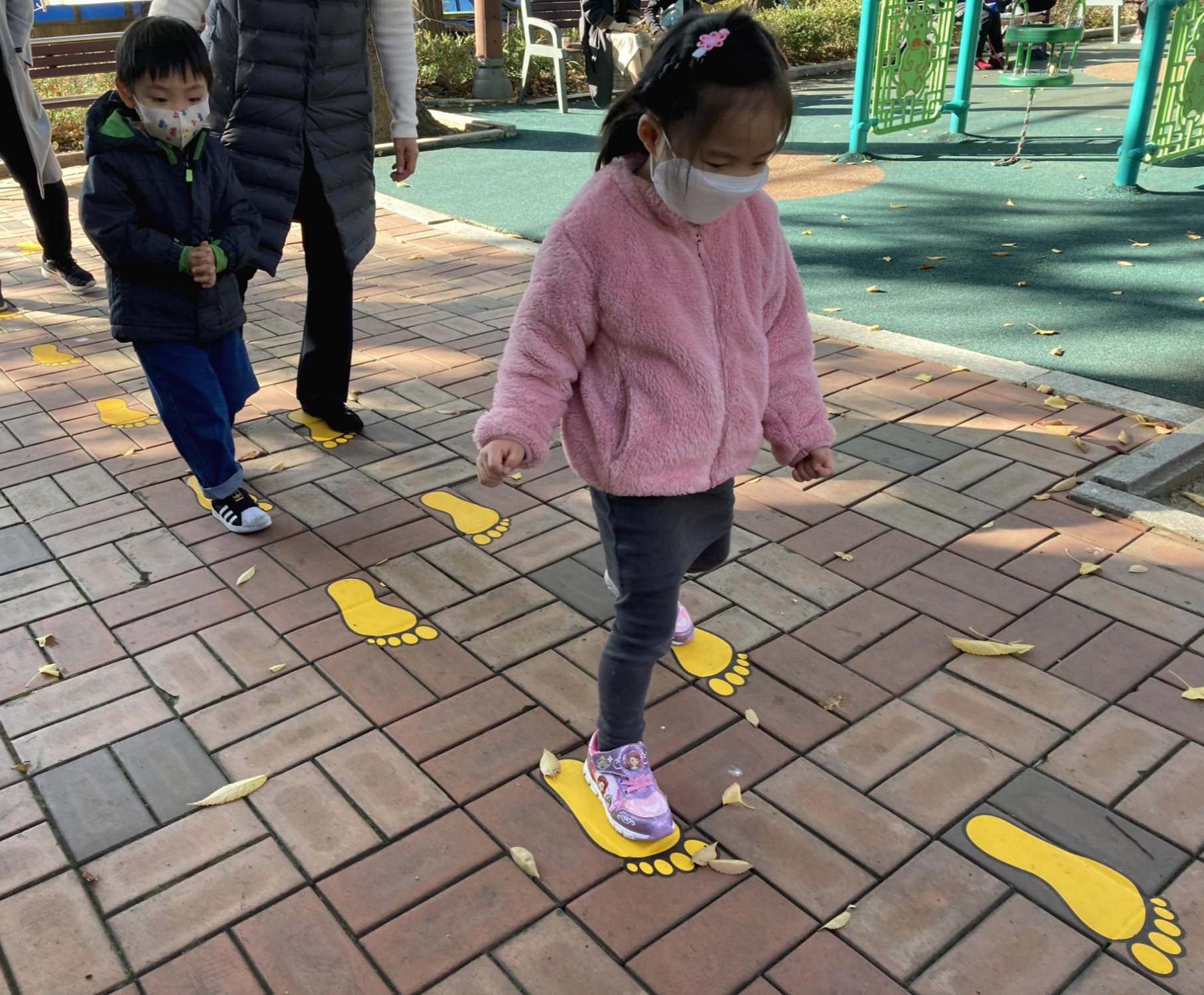 지난 10월 17일에 진행된 생기 있는 마을 공원 만들기 프로젝트에서 진행한 활동 중 노란 발자국을 따라 걸으며 집콕 전시회를 구경하러 온 아이들. 정말 봉사자들의 작은 실천을 통해 마을에 생기가 더해지는 모습을 직접 눈으로 확인할 수 있었습니다!