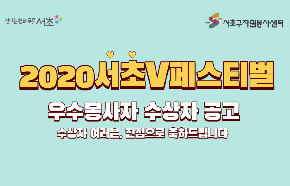 우리 센터에서는 자원봉사자들의 공로를 인정하고 활동을 축하하는 자원봉사자 연말대회인 <2020 서초V페스티벌>을 맞이하여 자원봉사활동에 모범을 보인 자원봉사자(개인 및 단체)와 자원봉사관리에 있어서 우수한 업무를 수행한 관리자들을 격려하고 인정하는 자리를 마련하였습니다.