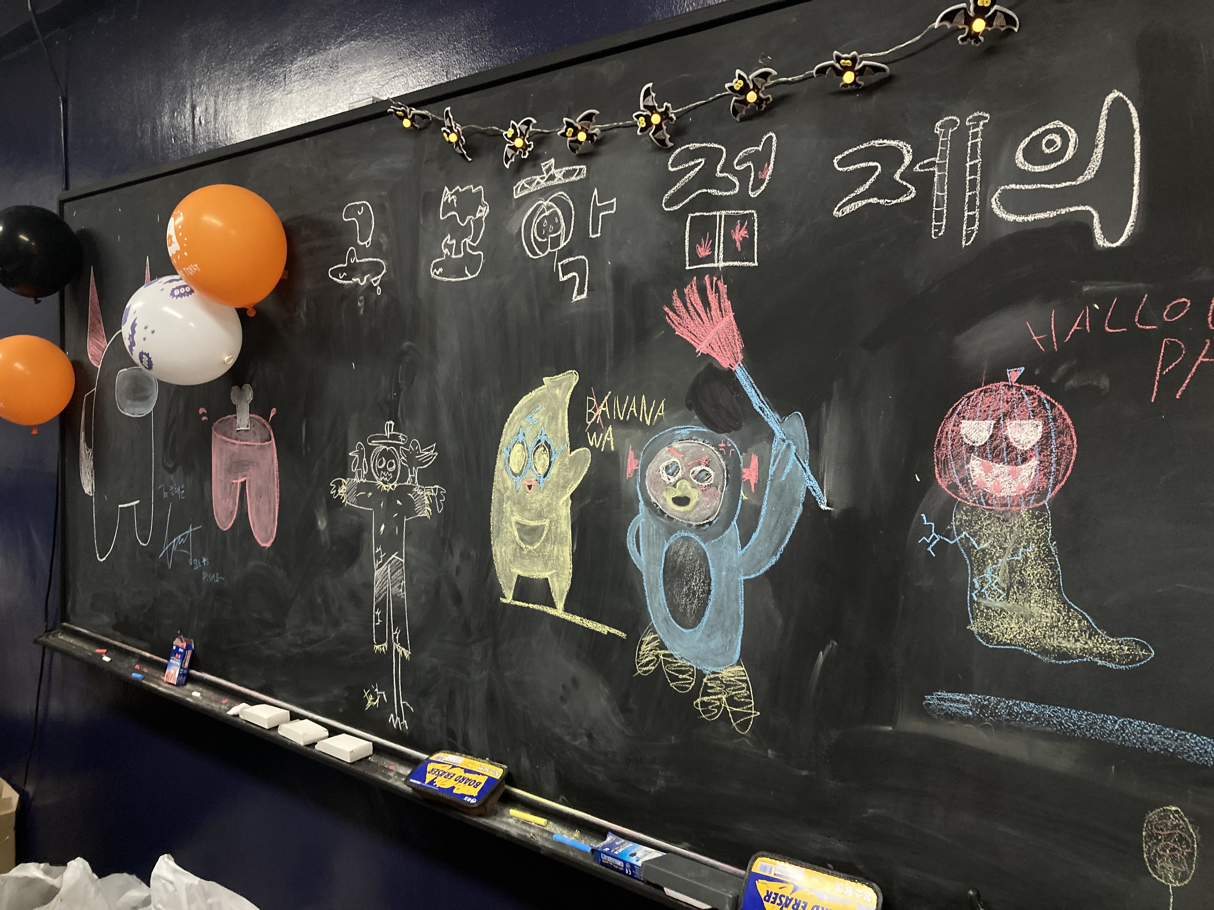 처음 입구에 들어서자마자 할로윈 분위기로 꾸며진 '두드림실'의 모습을 보고 정말 깜짝 놀랐는데요, 아기자기하게 장식된 벽과, 퀄리티 높은 무대장치 등을 보니 선생님과 학생들이 얼마나 열심히 준비했는지 확!!! 느낄 수 있었습니다. 학생들도 할로윈 머리띠 소품으로 한층 더 분위기를 냈답니다!