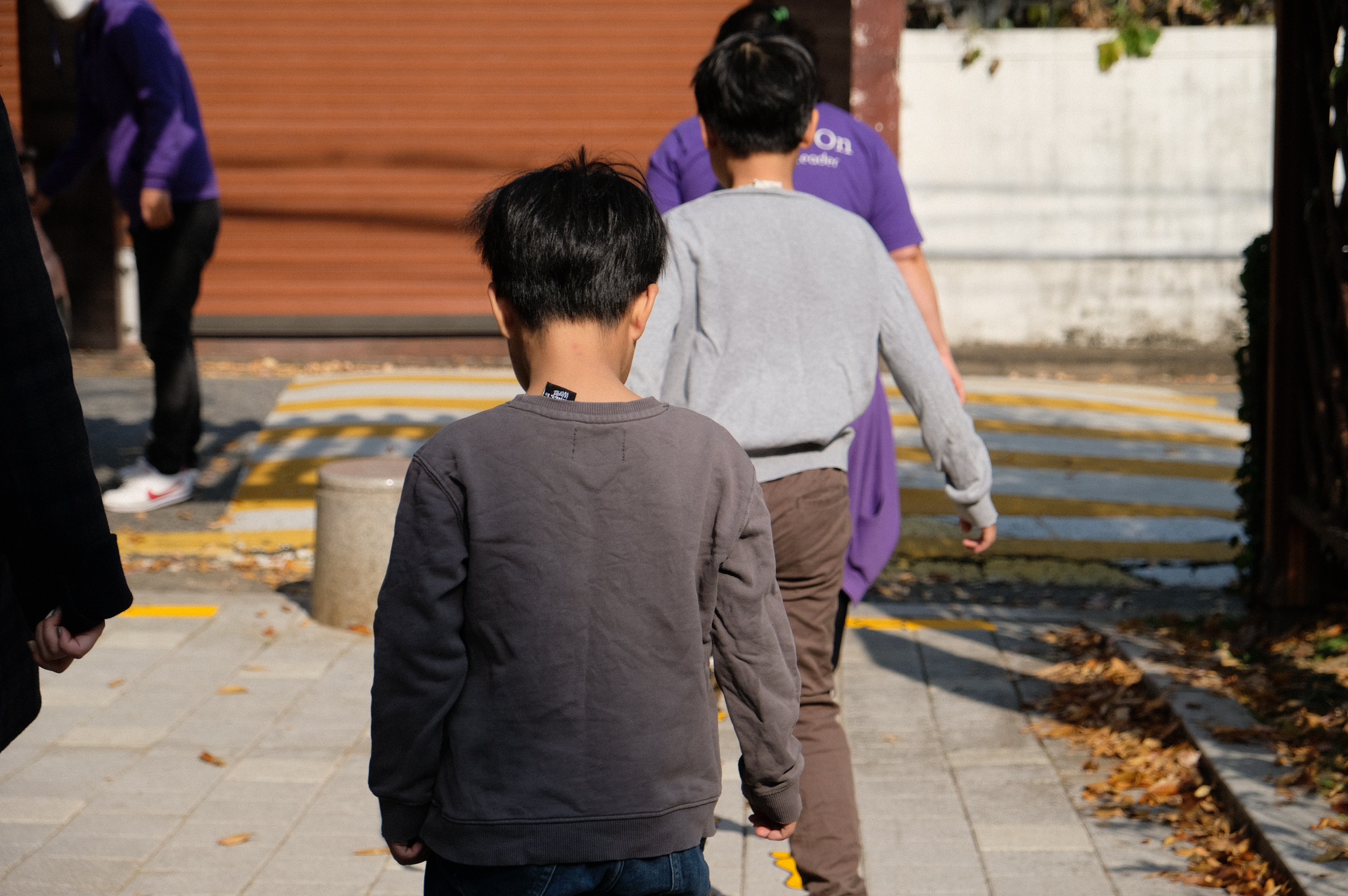 먼저, A팀은 아이들이 도로로 나가기 전 주차된 차들과 위험한 것을 살펴볼 수 있도록 안전대기선 부착을 시작했는데요. 선을 잘 맞추고 살살 스티커를 떼어내며 고무 망치질을 시작했습니다. 그다음, 어린아이들의 보폭에 맞춰 발자국을 어떻게 붙일지 열띤 토론이 벌어졌는데요. 두발로 재밌게 뛸 수 있게 놔보기도 하고, 이리저리 왔다 갔다 할 수 있게 놔보기도 하고 평범하게 보폭만 맞춰보기도 하고 어린아이들이 공원에 와서 걷는 모습을 생각하며 열심히 발자국을 놓았습니다. 고무망치로 통통통통 뚜들기면서 완성한 들어오는 길과 나가는 길! 열띤 토론의 결과가 아주 멋있게 나왔습니다.