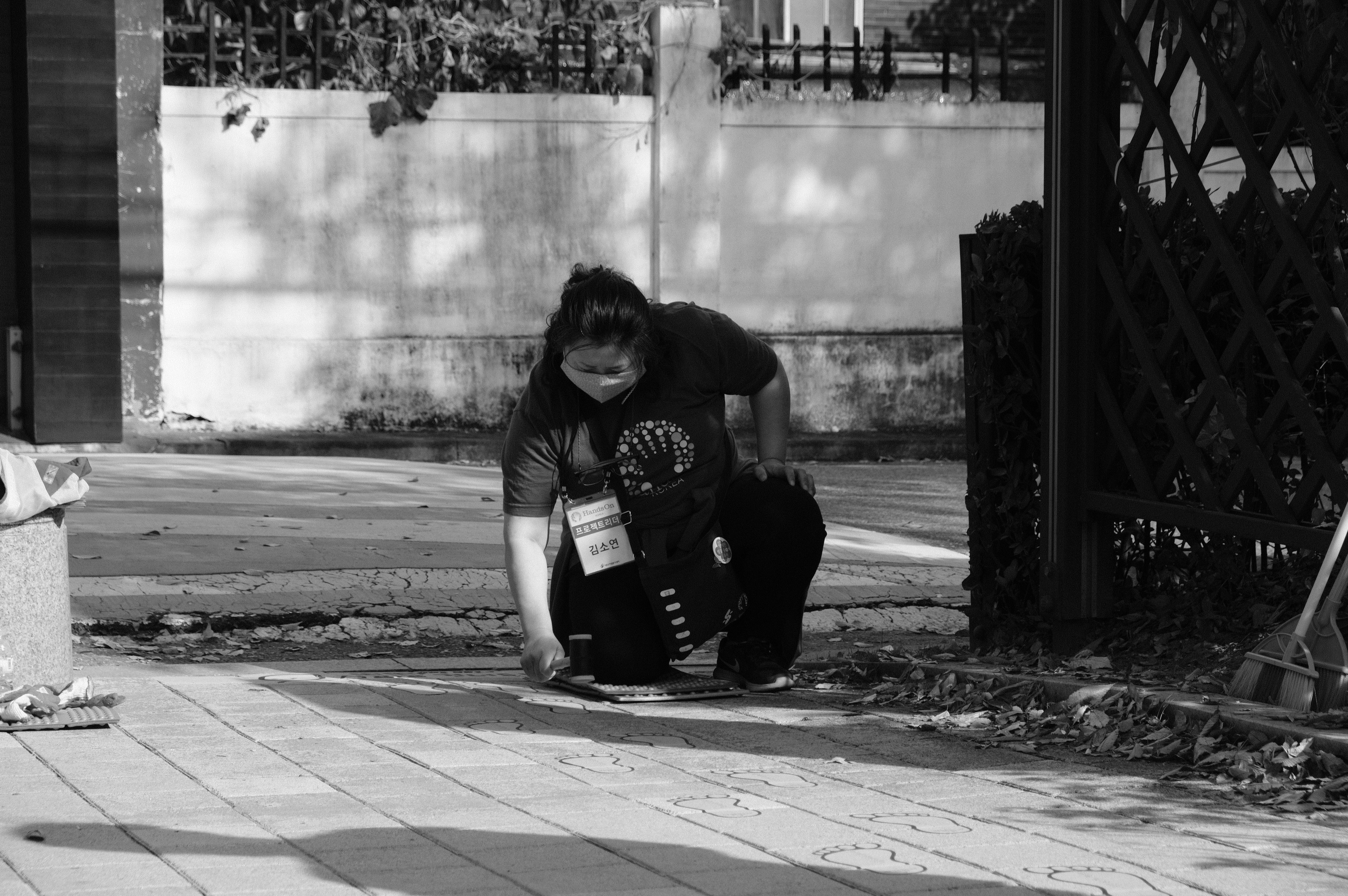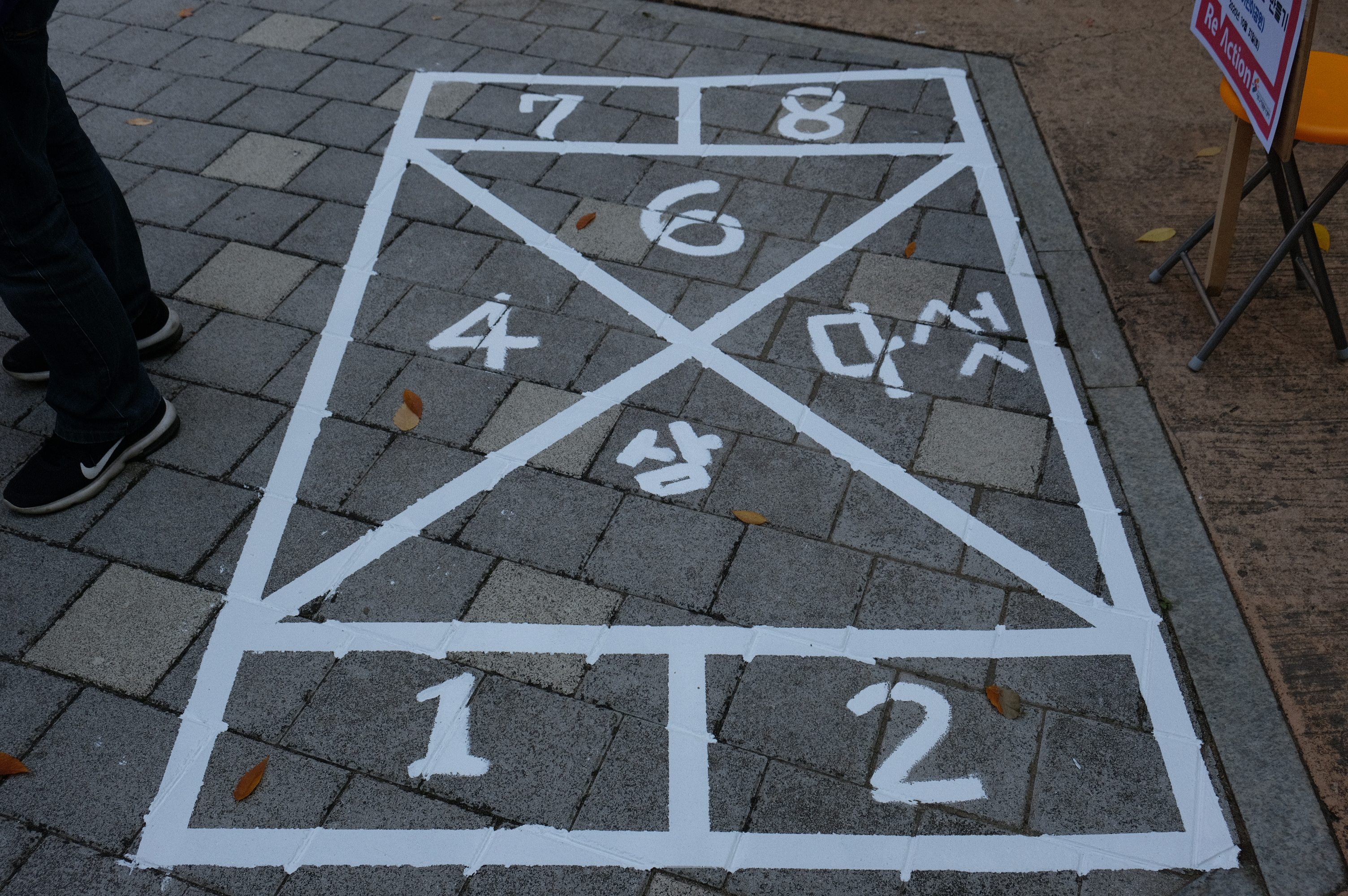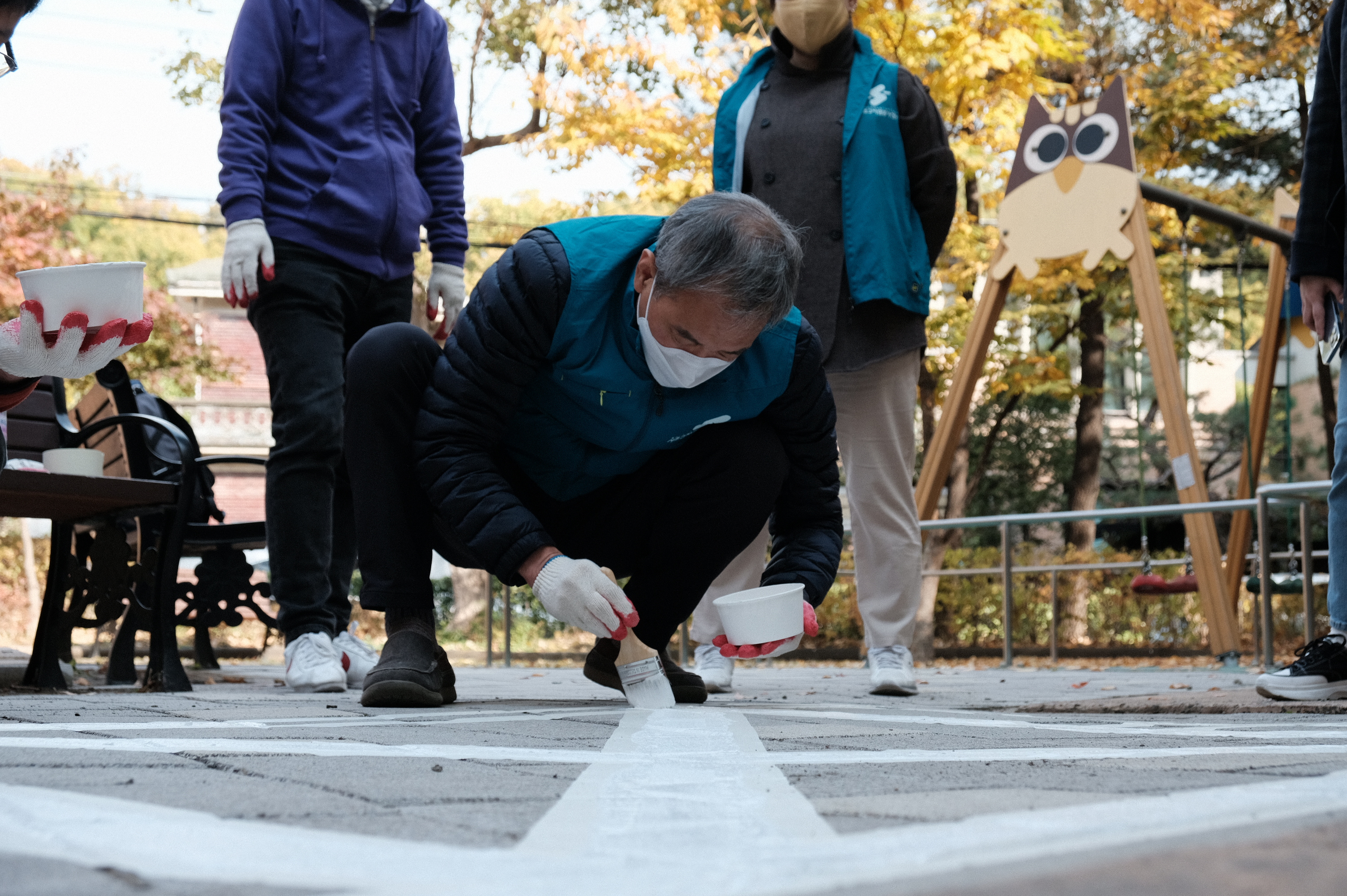 활동 조는 안전대기선 및 발자국을 담당하는 A팀과 사방치기 그리기를 담당하는 B팀 두 조로 나뉘었는데요. 나뉘고 보니 A팀은 YB, B팀은 OB인 듯했습니다! YB가 힘써주는 통통 튀는 발자국 디자인과 망치질, OB가 힘써주는 사방치기 틀의 정교함을 볼 수 있었는데요. 조 조합과 각자의 역할이 너무 적절했습니다.