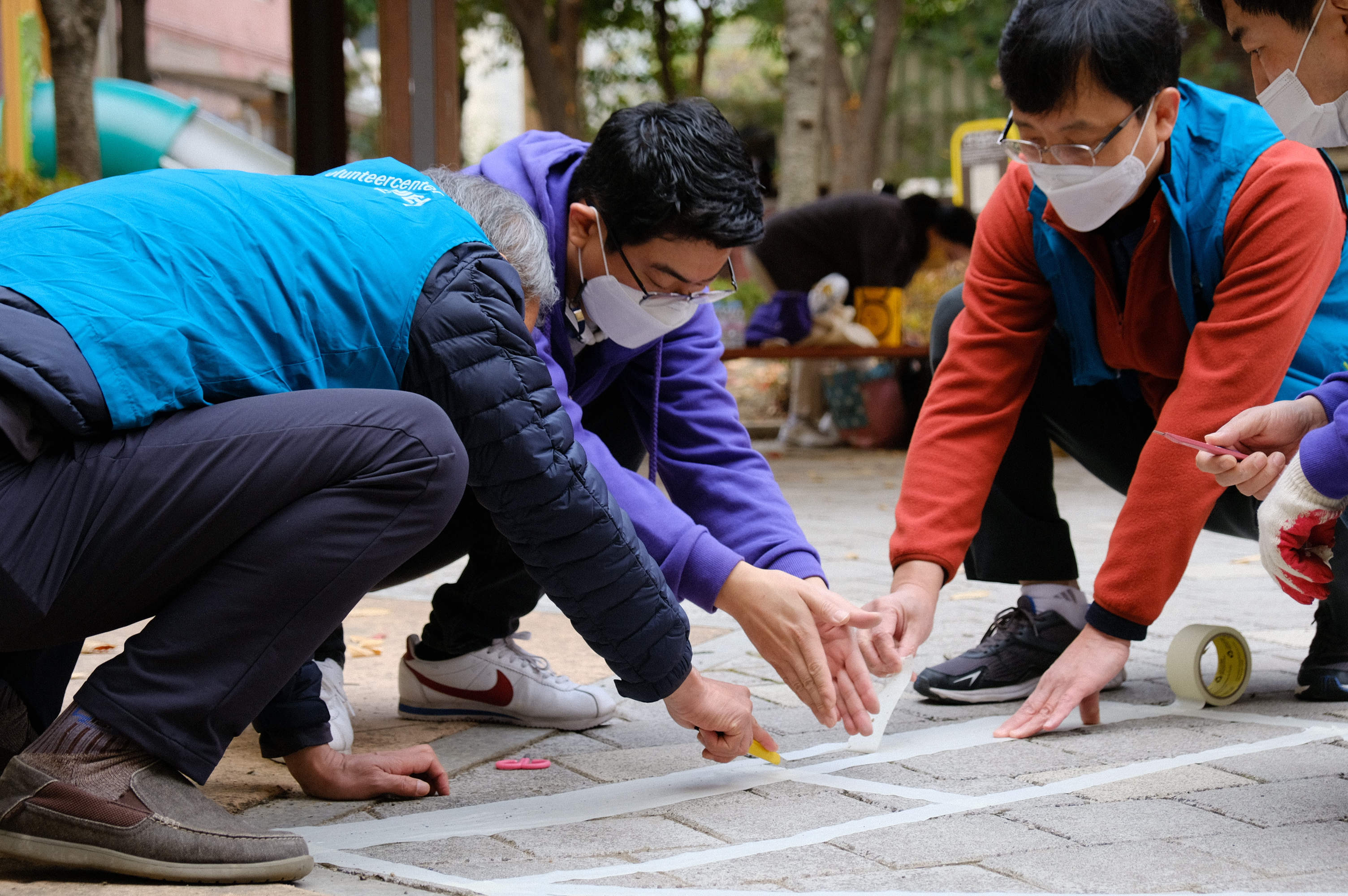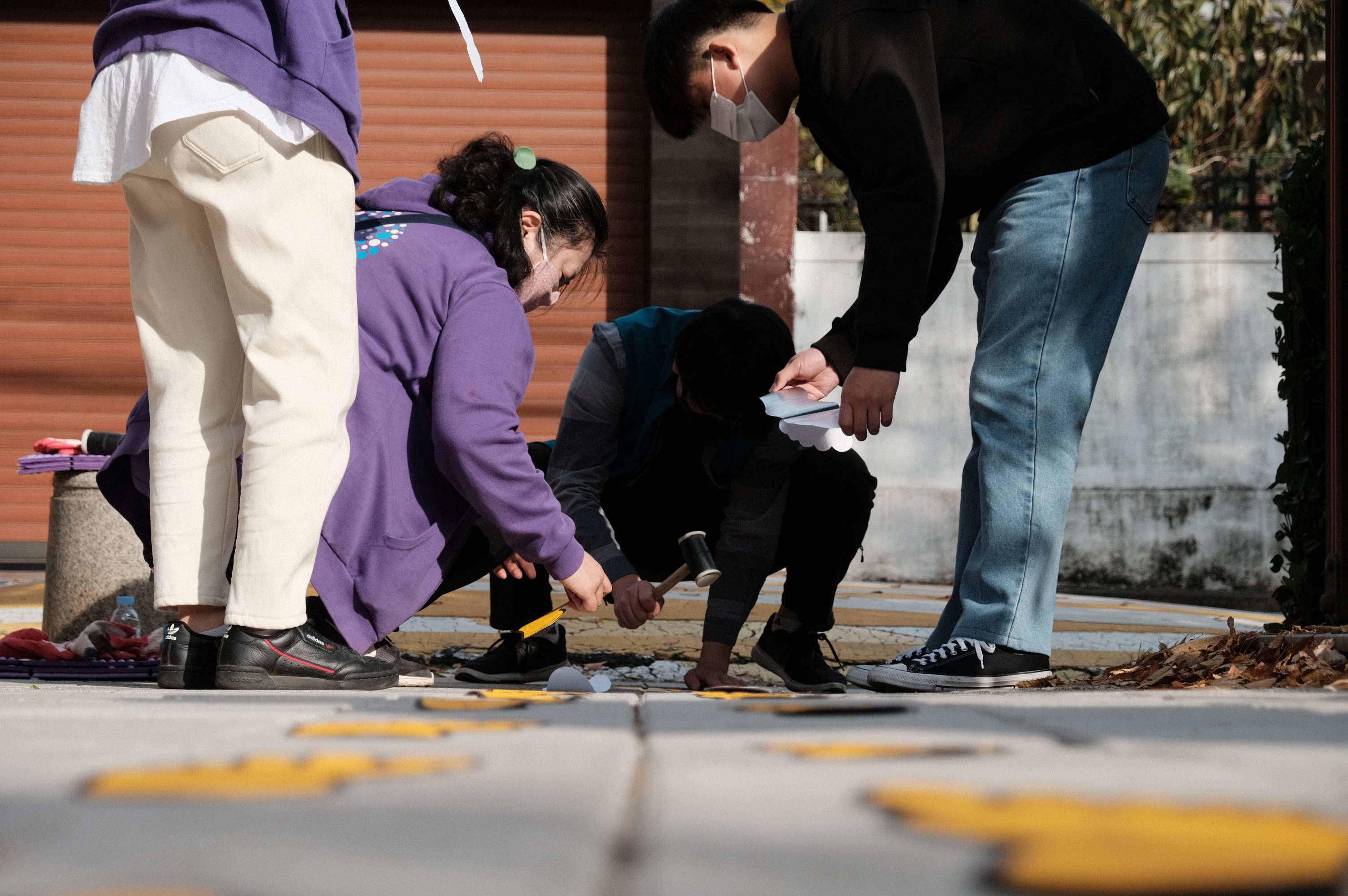활동 조는 안전대기선 및 발자국을 담당하는 A팀과 사방치기 그리기를 담당하는 B팀 두 조로 나뉘었는데요. 나뉘고 보니 A팀은 YB, B팀은 OB인 듯했습니다! YB가 힘써주는 통통 튀는 발자국 디자인과 망치질, OB가 힘써주는 사방치기 틀의 정교함을 볼 수 있었는데요. 조 조합과 각자의 역할이 너무 적절했습니다.