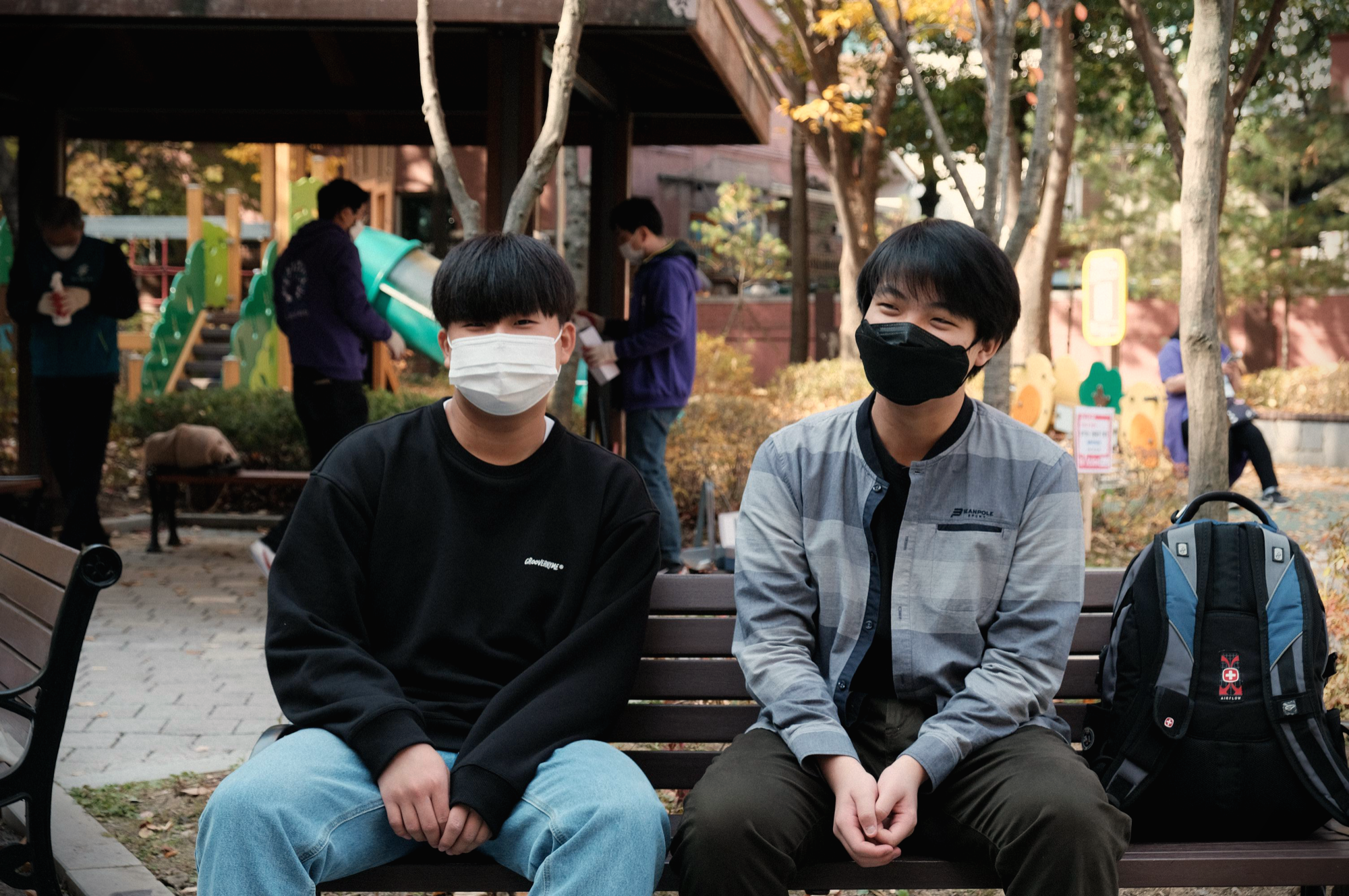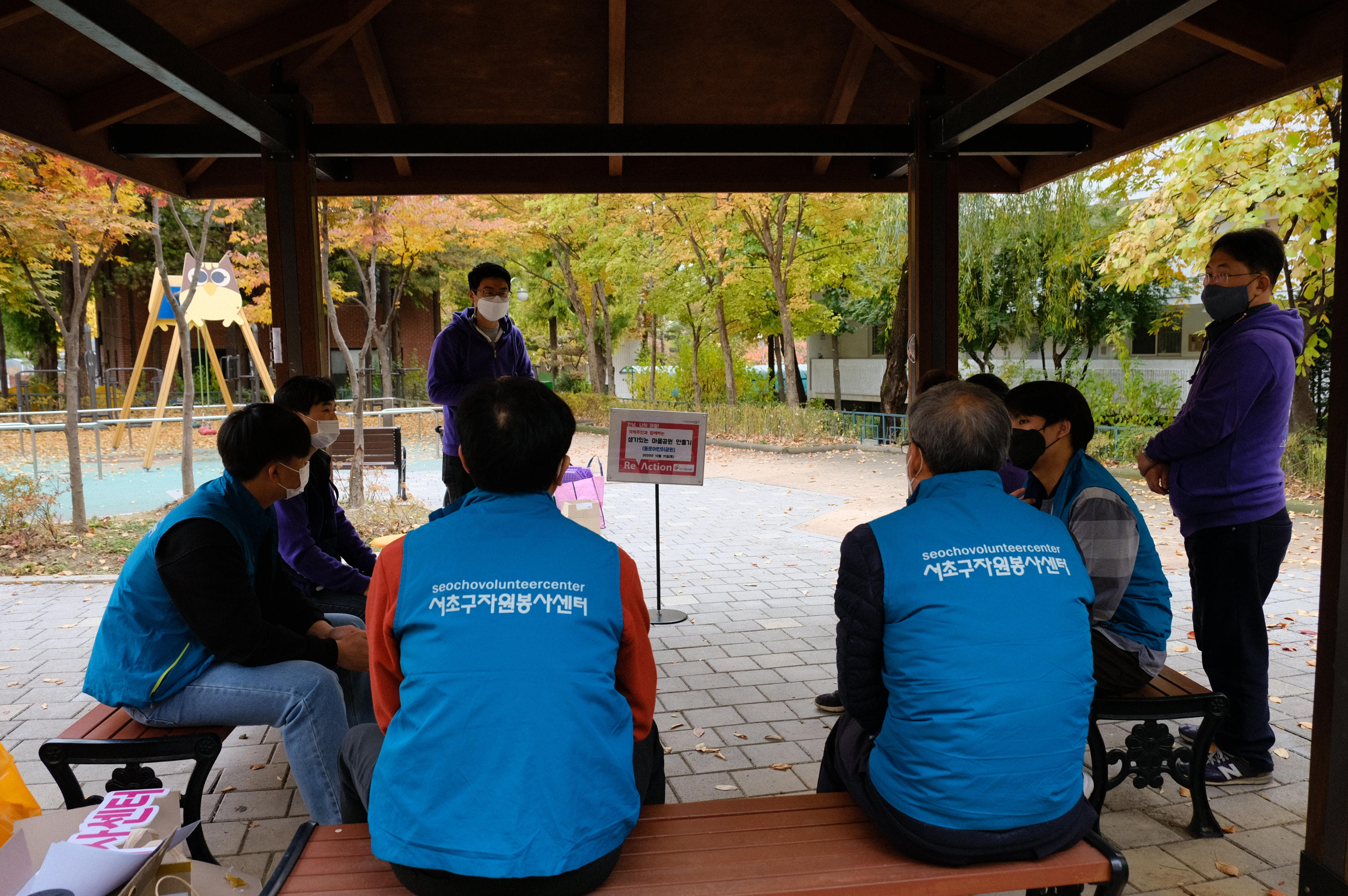 낙엽이 우수수 떨어지는 가을의 아침, 프로젝트 리더 3명과 가족봉사자 4명, 양재1동 캠프장 직원 3명과 안테나가 한자리에 모였습니다. 코로나 19에 대비하여 모두 도착하자마자 온도를 재고 손 소독을 하고 활동을 시작했는데요. 안전한 야외활동을 준수하는 참가자들!