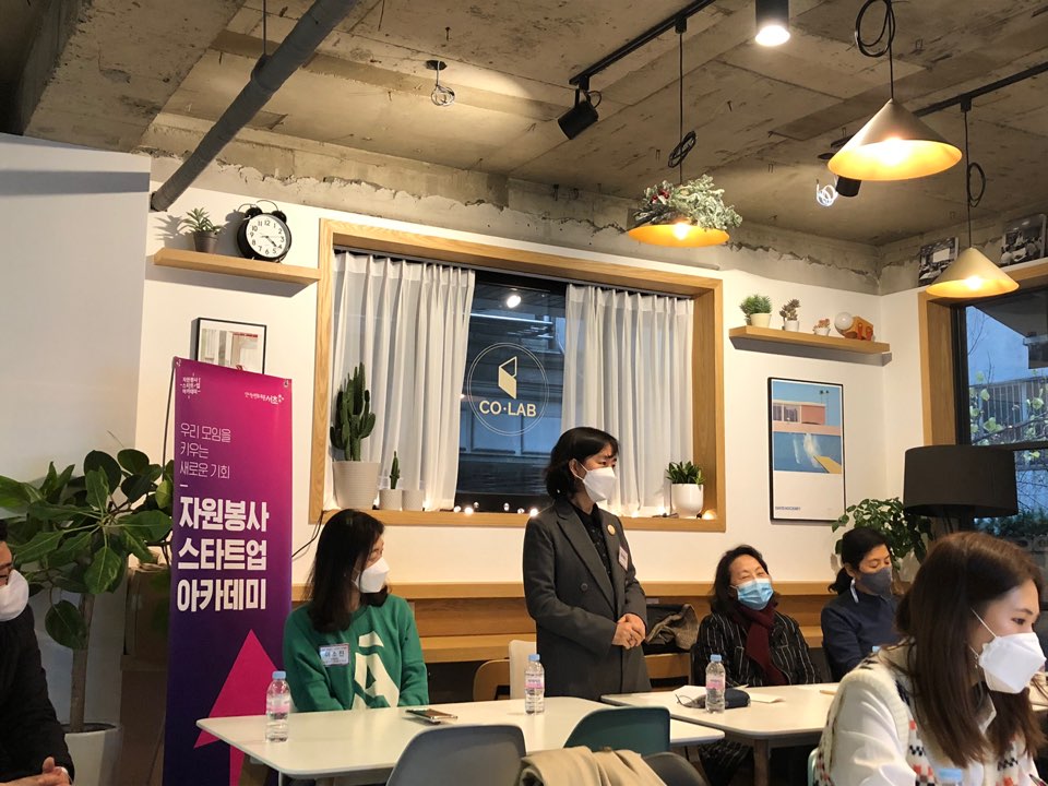 다음으로는 그동안 자원봉사 스타트업 아카데미 진행을 도맡으셨던 김은희 주임님이 지난 발자취를 되돌아보며 진행 과정, 코로나로 인한 어려움, 팀별 사업 구축 및 컨설턴트 교육 등에 대해 말해주셨습니다. 코로나로 인해 여러모로 어려움이 많았지만 사업팀들과 컨설턴트 분들 모두 사업을 구축하고 발전시키기 위해 항상 고민하고 노력했습니다.