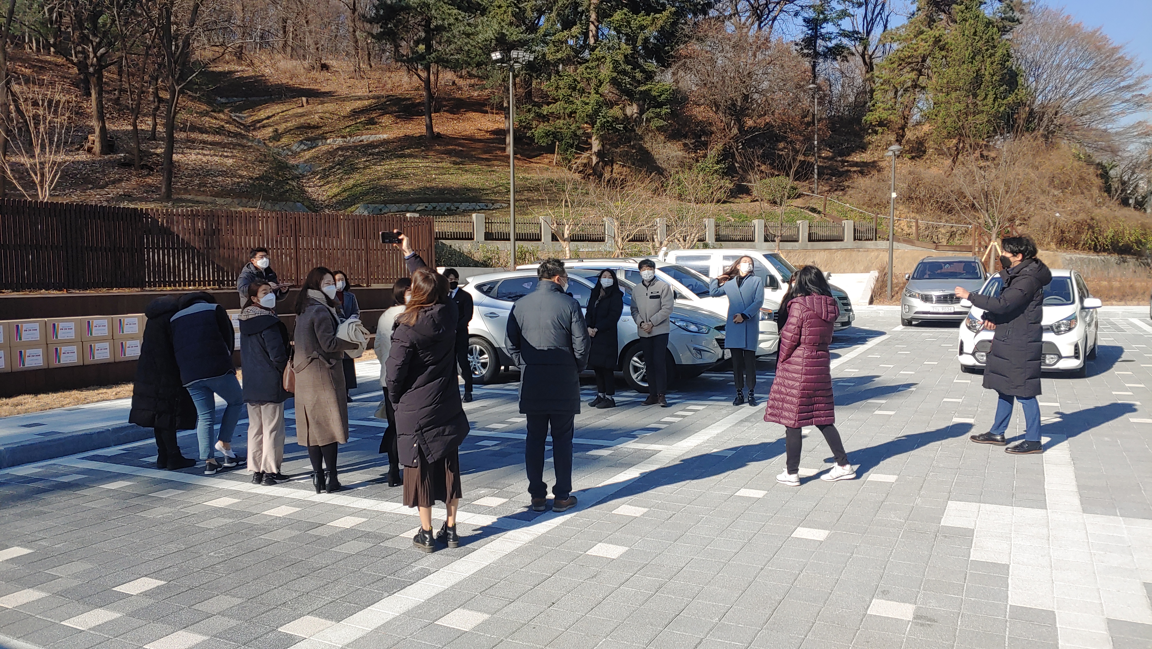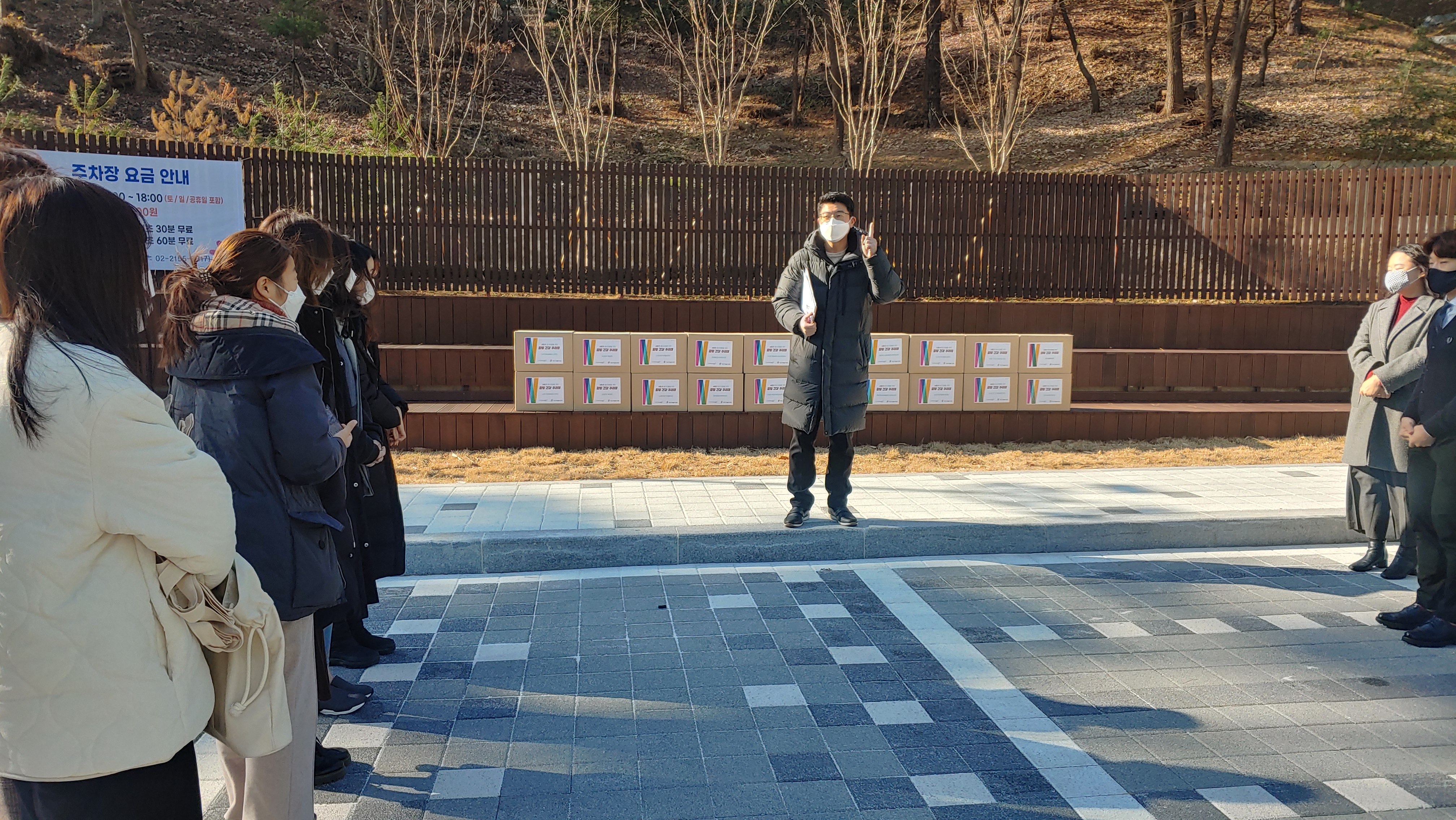 건강꾸러미 전달식의 하이라이트! 건강꾸러미 전달을 앞두고 있는 모습입니다. 서인호 과장님이 참가자들에게 수령 방법과 순서를 알려주고 있는 모습입니다. 건강꾸러미 전달은 정해진 순서대로 한 대 씩 차량으로 건강꾸러미 박스를 전달하는 방식으로 진행되었습니다.