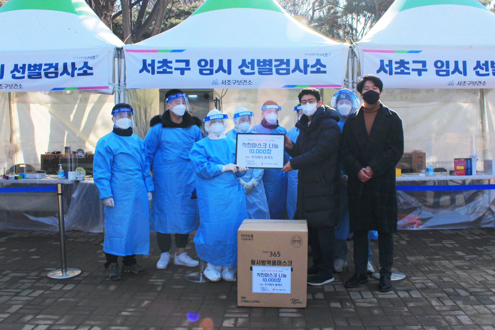 서초구청 선별 진료소에는 9,000장의 마스크가 , 2월까지 운영되는 양재 글린공원 임시진료소에는 1,000장에 마스크가 전달되었습니다. 현장 사진에서 보시는 바와 같이 각 선료소 모두 의료진들이 지역사회를 헌신하는 열정이 더욱이 느껴지는 자리였습니다.