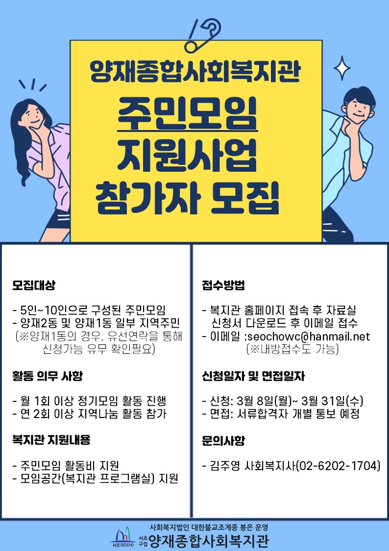 ▷ 모집 대상 : 5인~10인으로 구성된 주민모임(양재2동 및 양재1동 일부 지역주민)