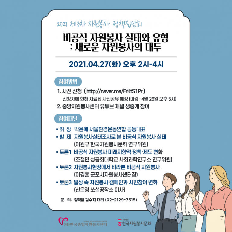 자원봉사의 저변이 확대되고 시민의 자발적 참여의식이 높아진 가운데, (재)한국중앙자원봉사센터와 (사)한국자원봉사문화에서 비공식 자원봉사에 대한 현황을 공유하고 시대변화에 적합한 정책 대안을 마련하고자 정책집담회를 개최합니다.