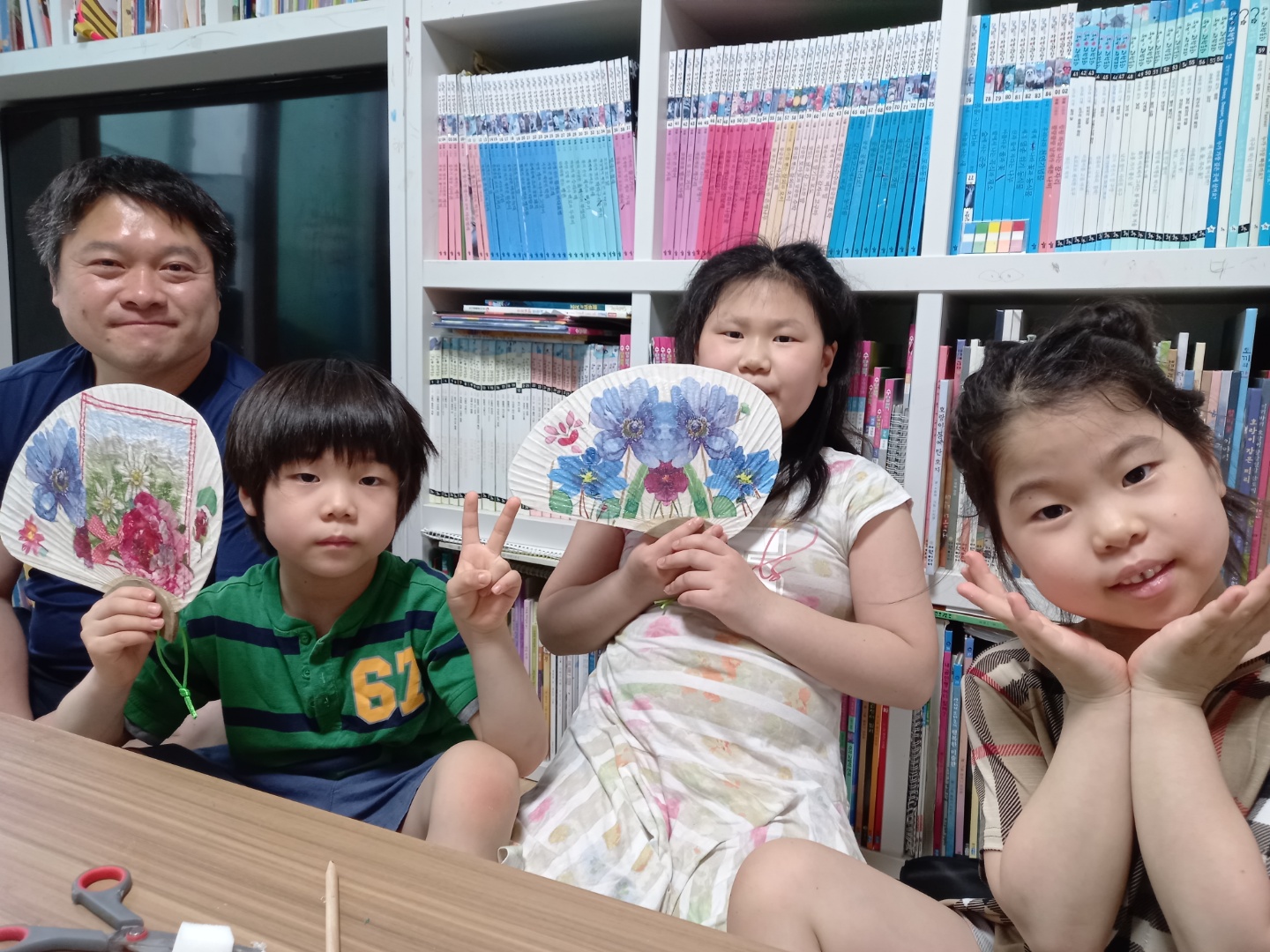 부채 만드는 법을 쭉 설명해주시고 1시간 정도 부채를 가족들과 직접 만들어 보는 시간을 가졌습니다. 만들어진 부채는 하나는 주변 이웃들 중에 전달하고, 하나는 가족 중에 전달하도록 하였습니다. 진니찬건만만세 가족은 경비아저씨께, 더사랑해 가족은 아래층 할머님께, 복팀 가족은 반찬배달 봉사를 하고 있는 분께 등등 다양하고 뜻깊은 이유로 이웃들께 전달하고 싶다는 의견들을 들어보았습니다.